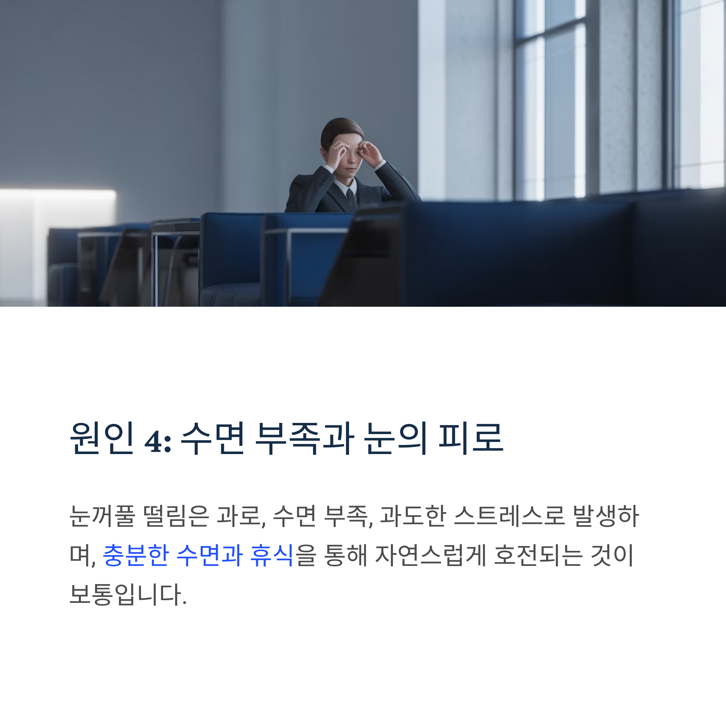 눈꺼풀 떨림은 과로, 수면 부족, 과도한 스트레스와 같은 요인으로 발생하며, 충분한 수면과 휴식을 통해 자연스럽게 호전되는 것이 보통입니다.