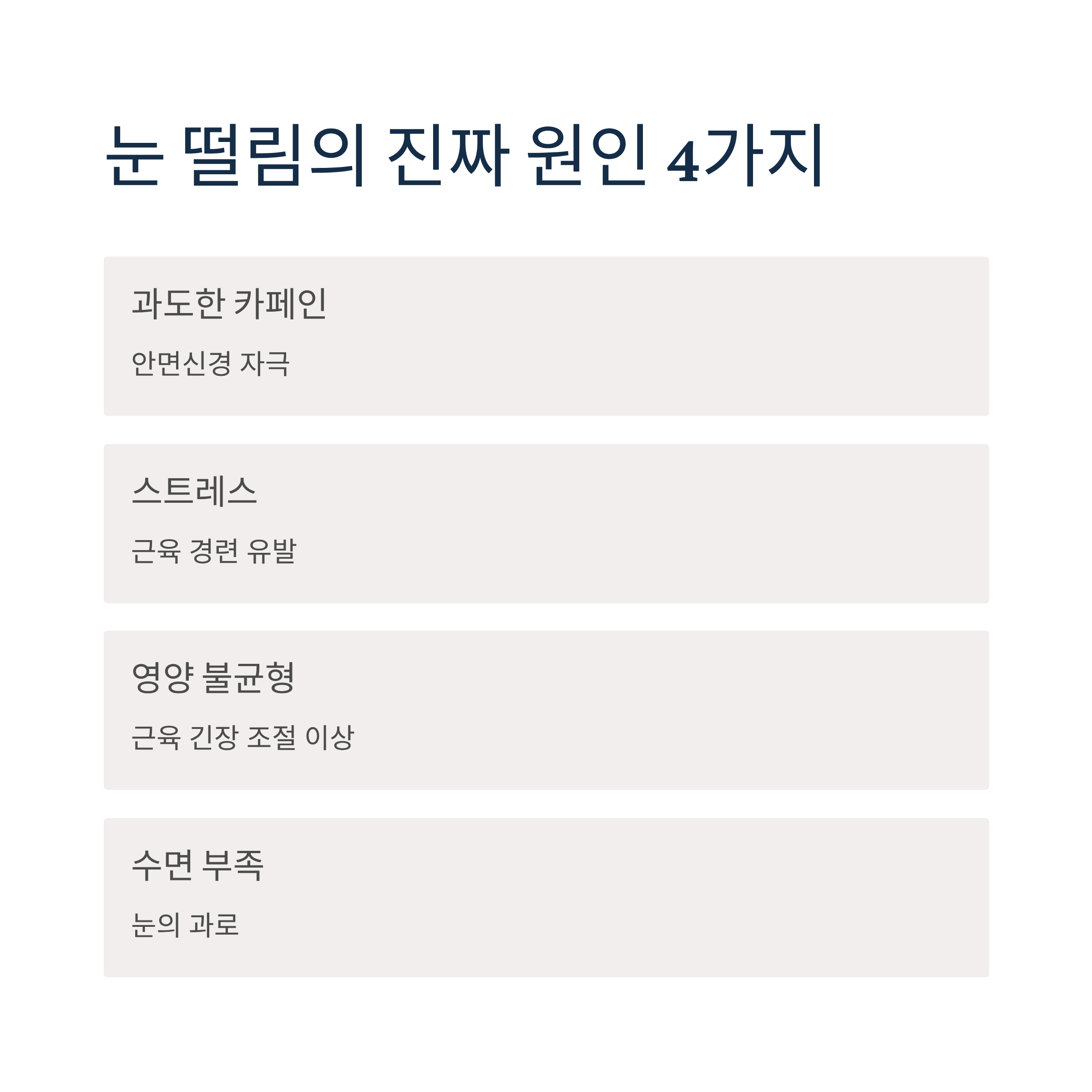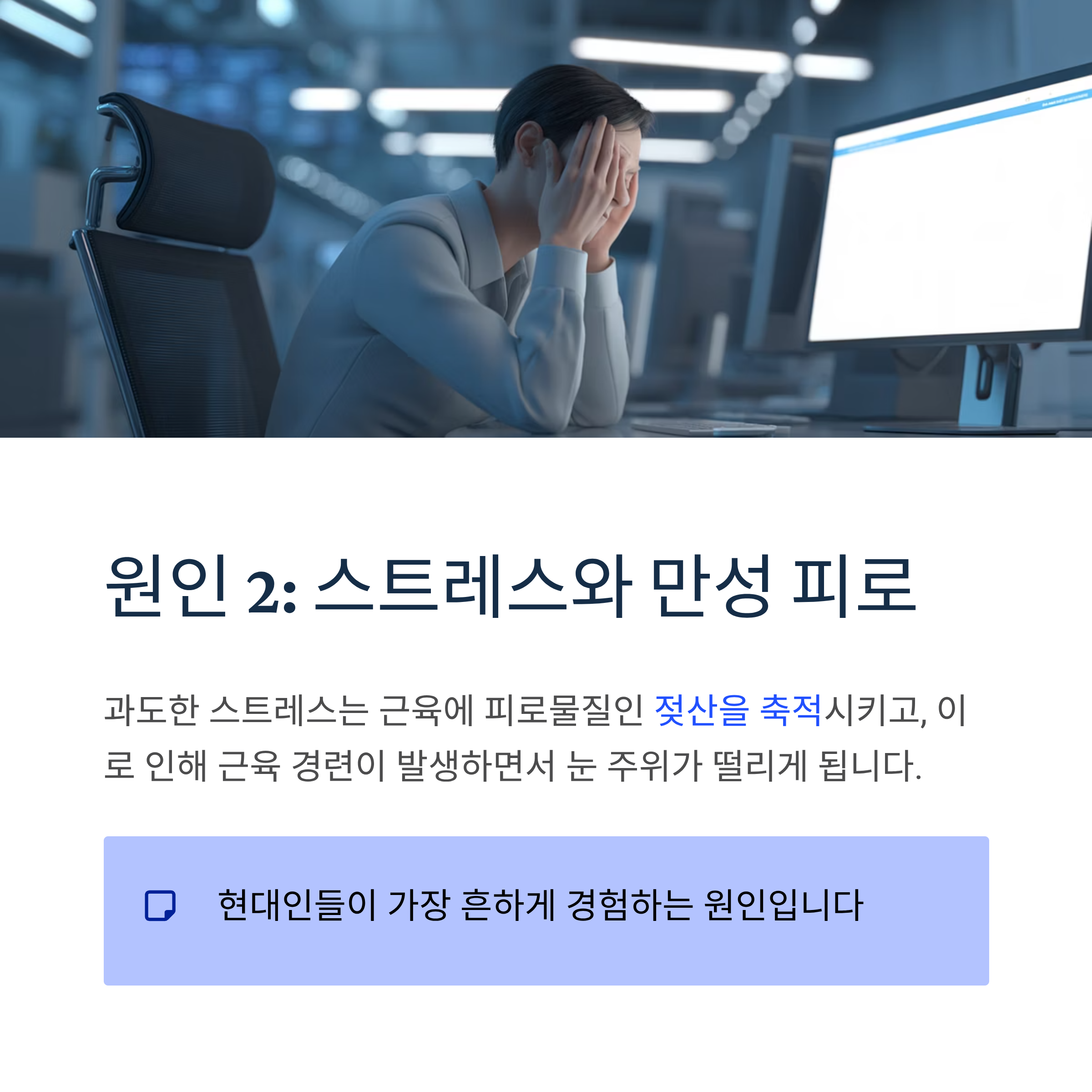 과도한 스트레스는 근육에 피로물질인 젖산을 축적시키고, 이로 인해 근육 경련이 발생하면서 눈 주위가 떨리게 됩니다. 현대인들이 가장 흔하게 경험하는 원인입니다.