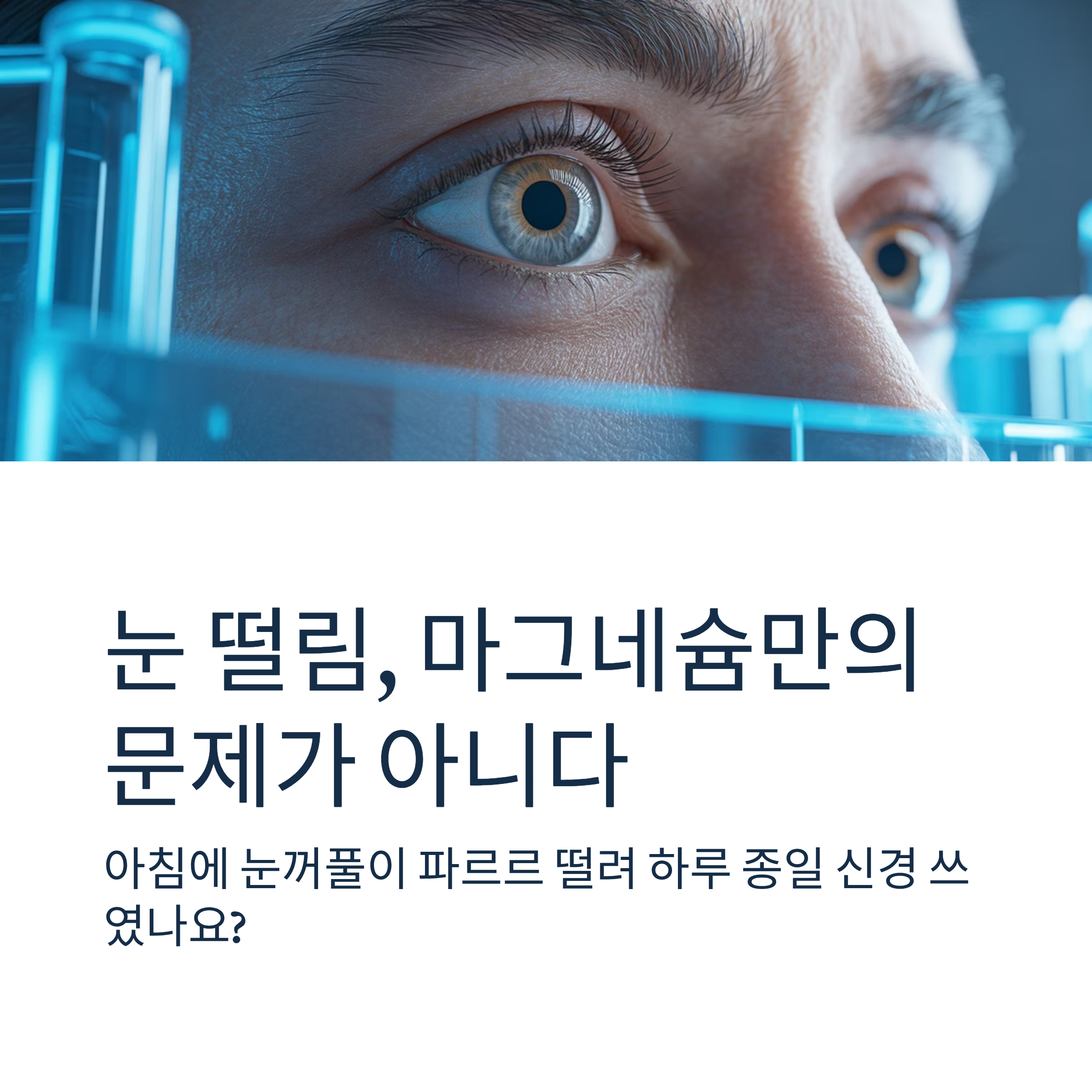 "아침에 일어나자마자 눈꺼풀이 파르르 떨려서 하루 종일 신경 쓰였던 적 있으신가요?" 분당제생병원 연구팀의 최신 연구에 따르면, 눈 떨림 환자와 일반인의 혈중 마그네슘 농도는 거의 차이가 없는 것으로 나타났습니다. 우리가 당연하게 믿었던 '마그네슘 부족'만이 원인이 아니라는 뜻입니다. 그렇다면 눈 떨림의 진짜 원인은 무엇이고, 어떻게 해결해야 할까요?