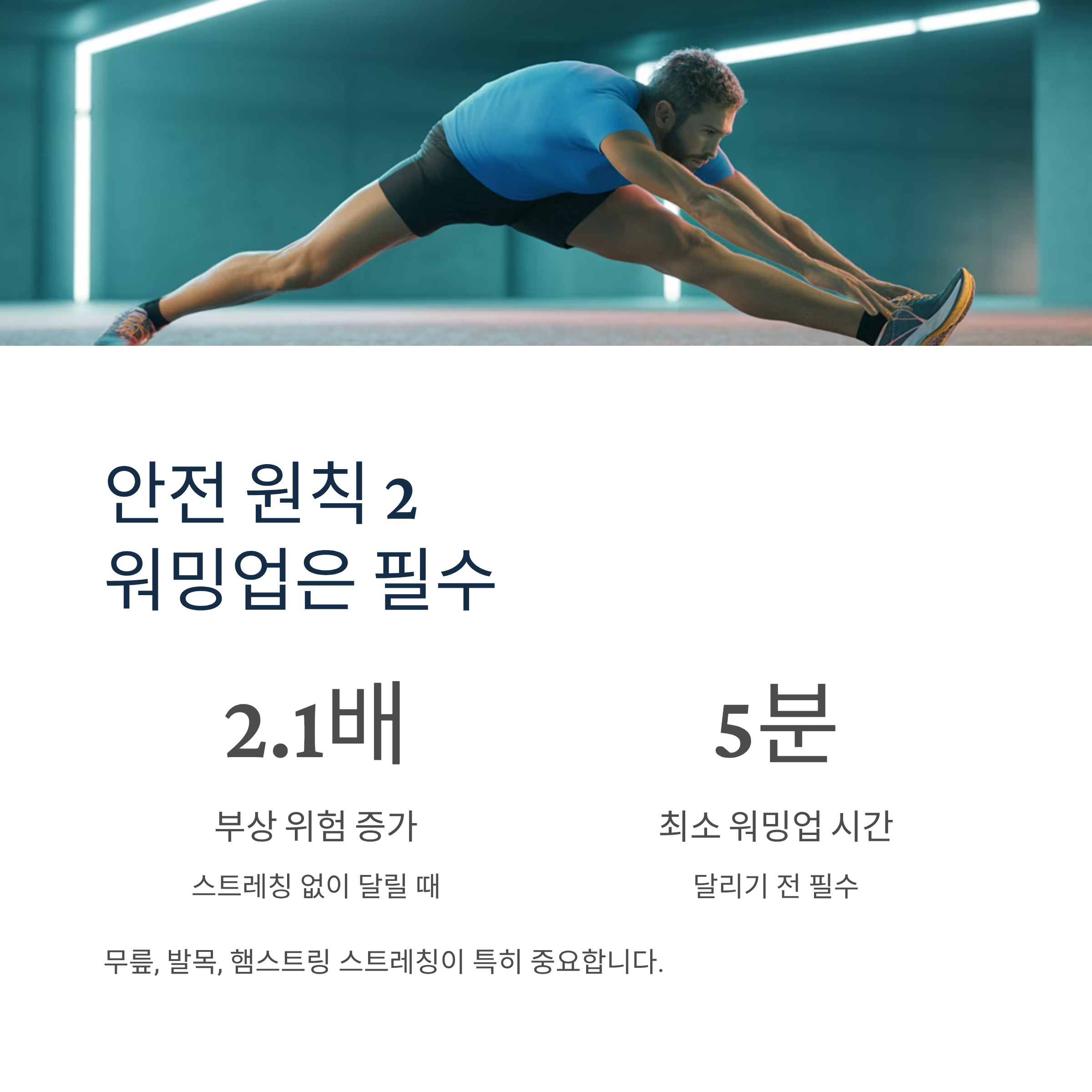 달리기 전 5분 이상 스트레칭을 하지 않으면 부상 위험이 2.1배 높아집니다. 무릎, 발목, 햄스트링 스트레칭이 특히 중요하며, 운동 후에도 충분한 정리 운동으로 근육을 이완시켜야 합니다.