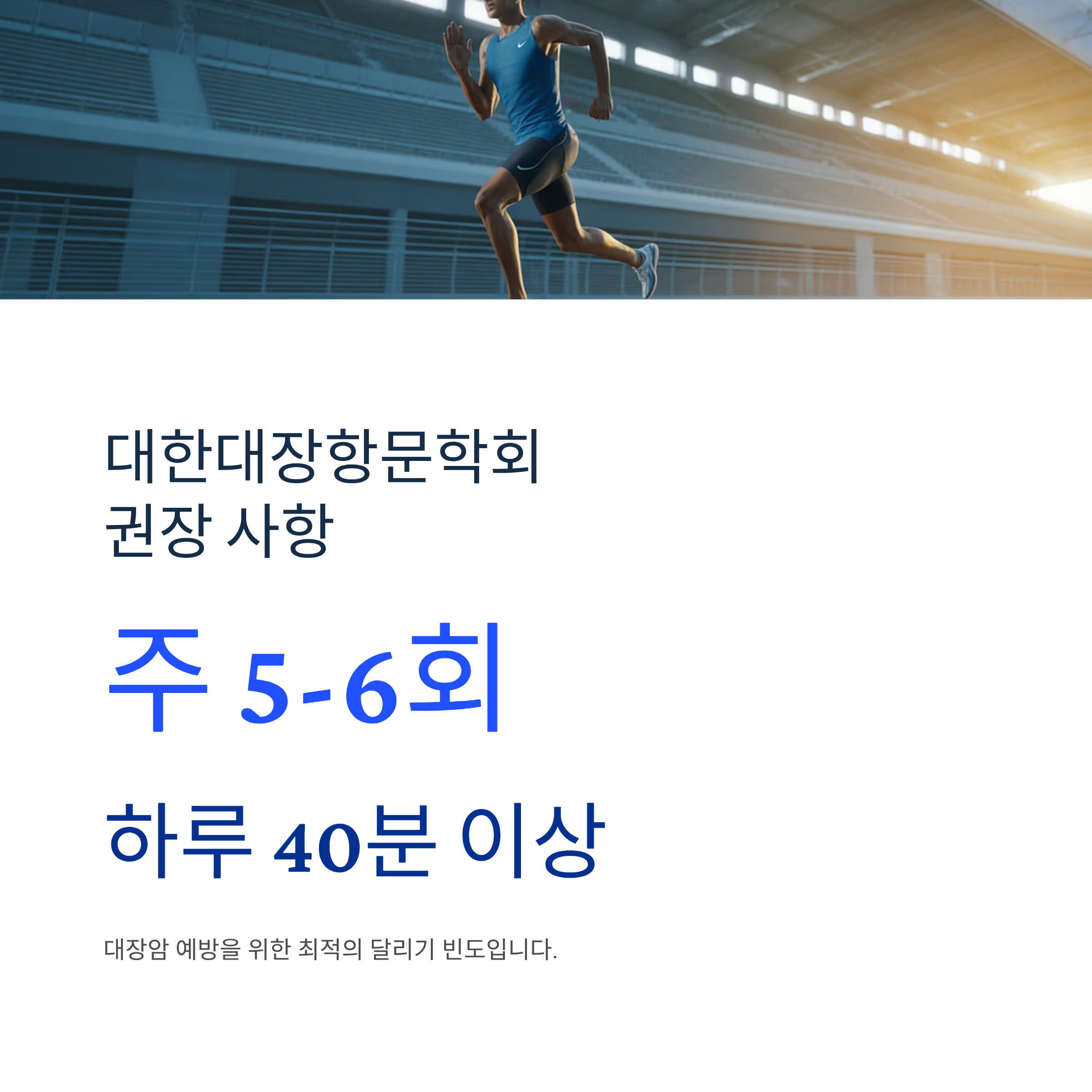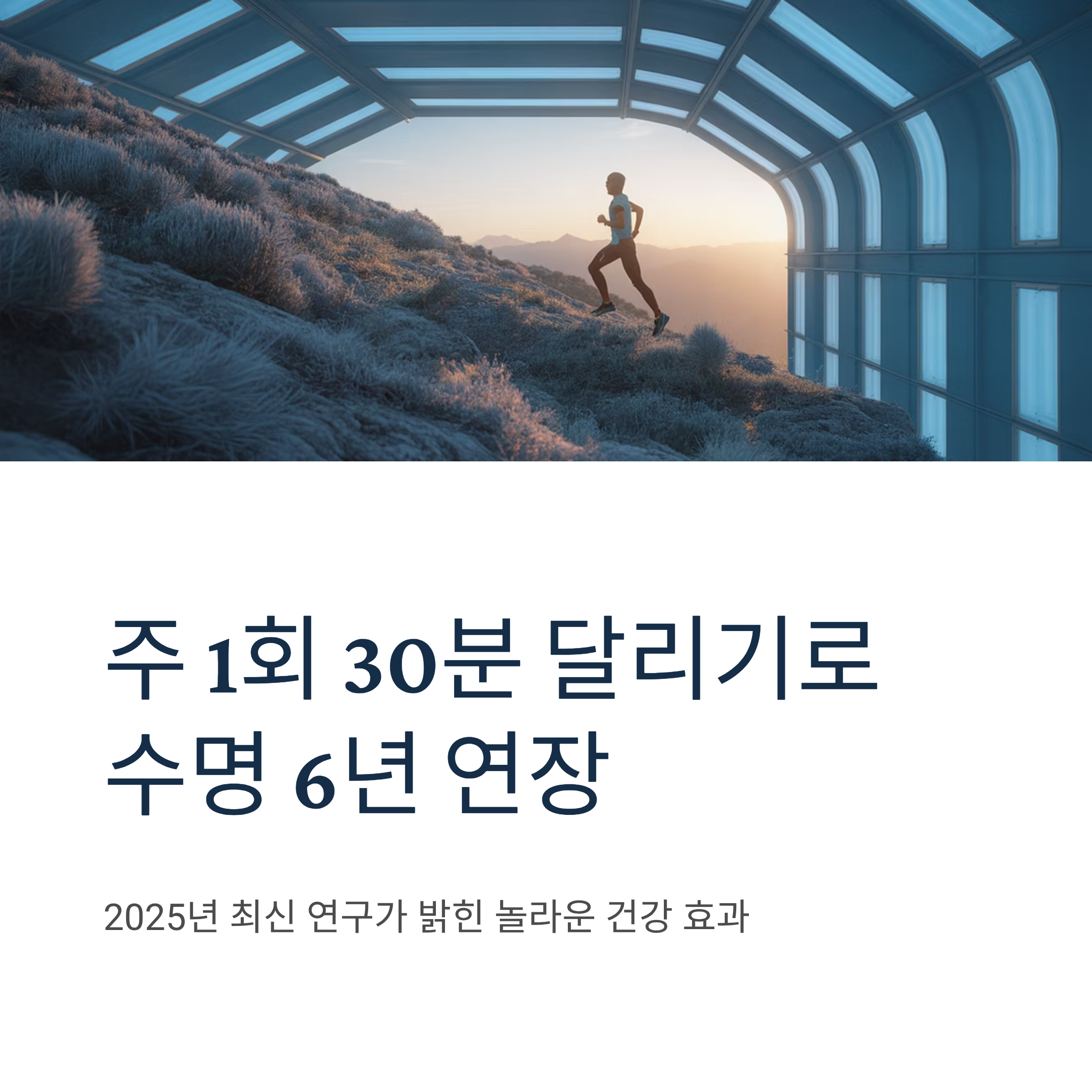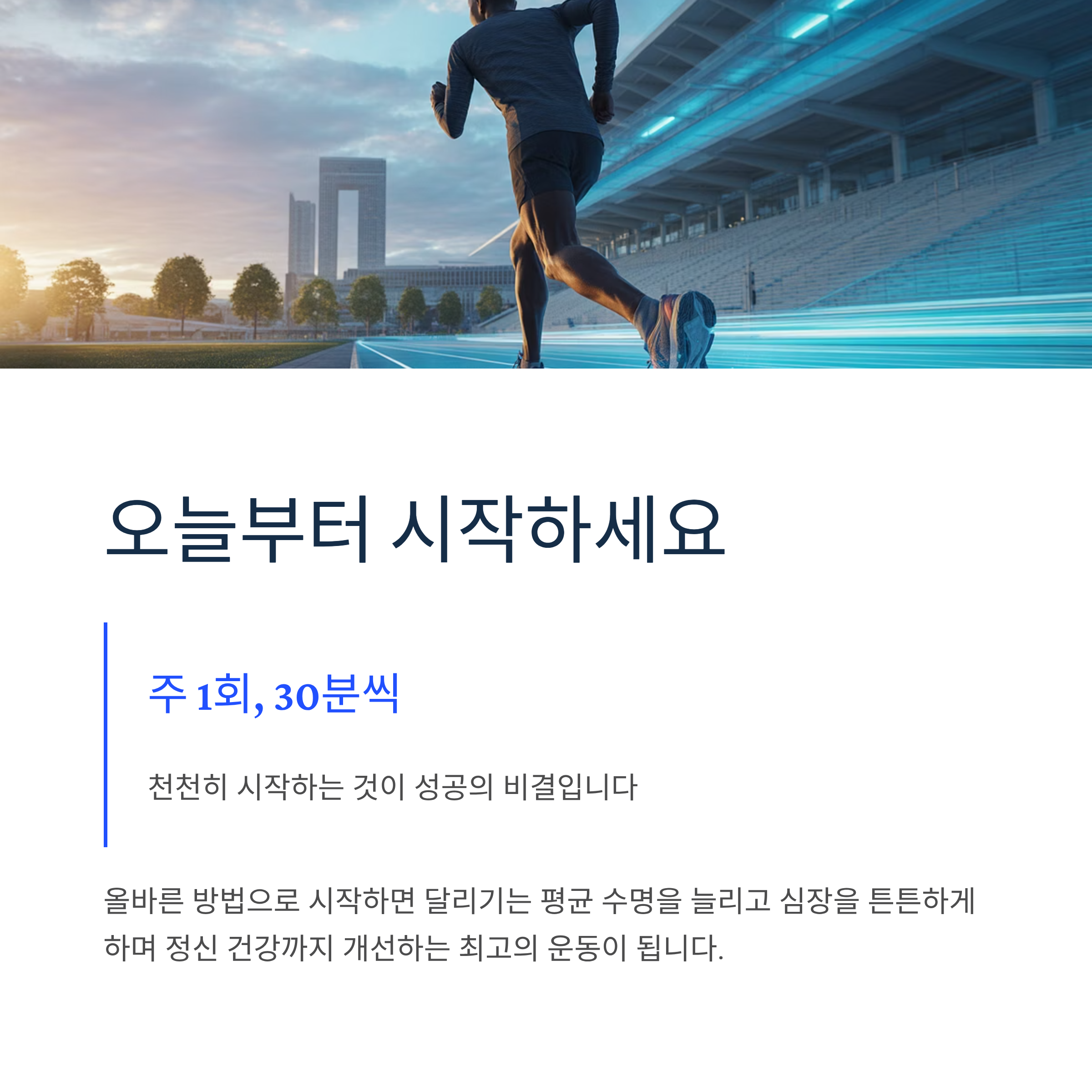 달리기는 평균 수명을 늘리고 심장을 튼튼하게 하며 정신 건강까지 개선하는 최고의 운동입니다. 하지만 올바른 방법으로 시작하지 않으면 건강을 해칠 수 있습니다. 오늘부터 주 1회, 30분씩 천천히 시작해보세요. 6개월 후, 당신의 몸과 마음이 달라진 것을 느낄 수 있을 것입니다.