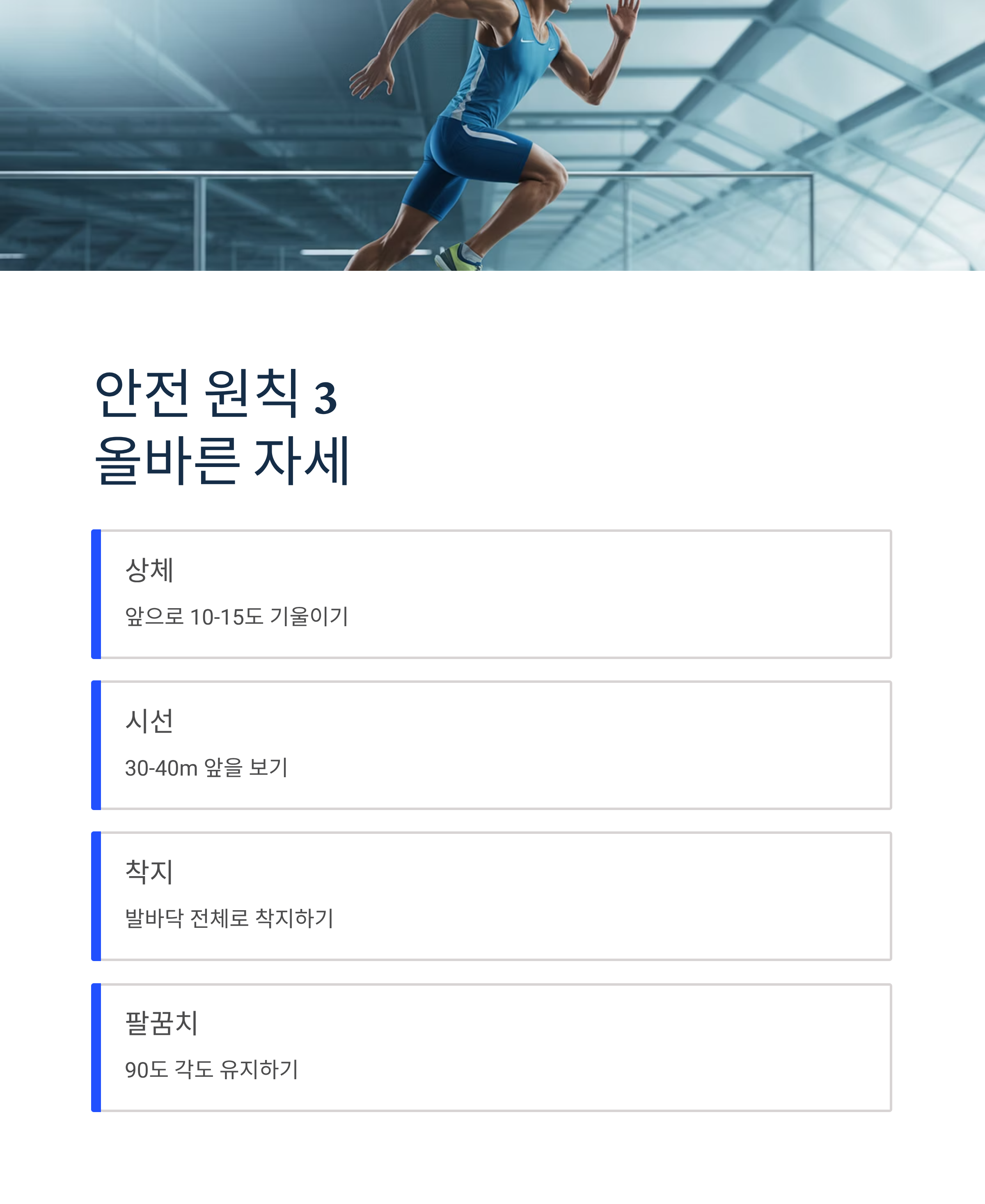 상체는 앞으로 10~15도 기울이고, 시선은 30~40m 앞을 봅니다. 발뒤꿈치가 아닌 발바닥 전체로 착지하며, 팔꿈치는 90도를 유지합니다. 착지 시 무릎이 약간 구부러져야 충격을 흡수할 수 있습니다.