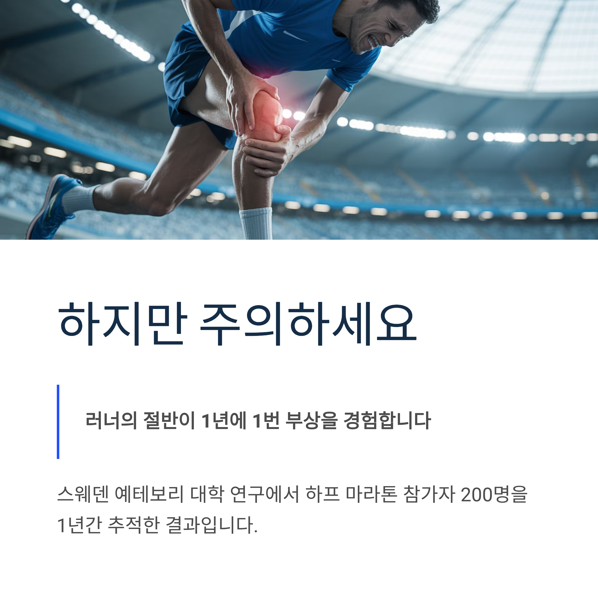 스웨덴 예테보리 대학 연구에서 하프 마라톤 참가자 200명을 1년간 추적한 결과, 3분의 1이 부상을 입었고 중도 포기자까지 포함하면 절반 가까이가 부상을 경험했습니다. 가장 흔한 부상은 무릎 통증, 발목 염좌, 족저근막염, 정강이뼈 통증 등입니다.