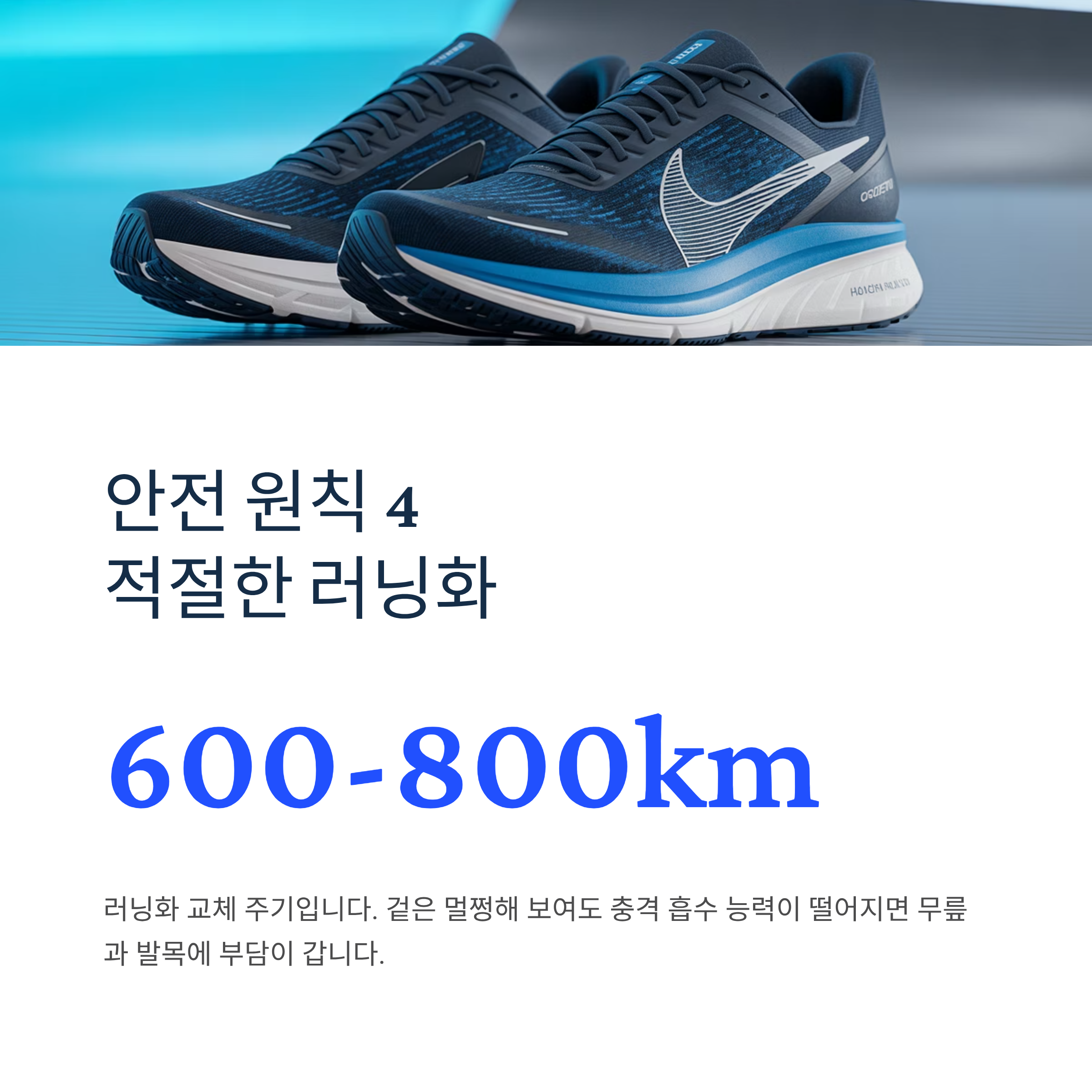 러닝화는 600~800km마다 교체해야 합니다. 겉은 멀쩡해 보여도 충격 흡수 능력이 떨어지면 무릎과 발목에 부담이 갑니다.