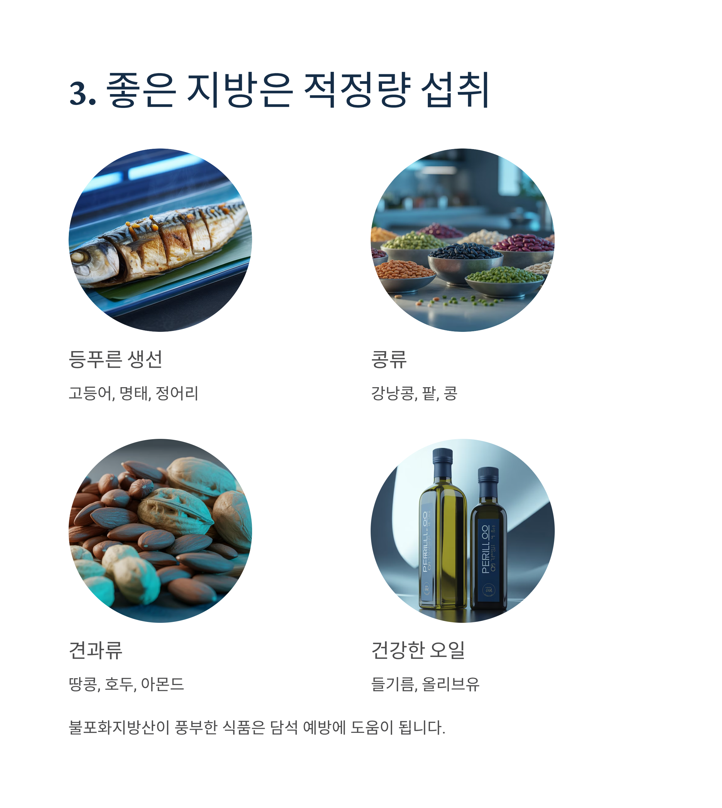 모든 지방이 나쁜 것은 아닙니다. 불포화지방산이 풍부한 고등어, 명태, 정어리 같은 등푸른 생선과 강낭콩, 팥, 콩 등의 두류, 땅콩, 호두, 아몬드 등의 견과류, 들기름, 올리브유는 적정량 섭취가 가능합니다. 이러한 건강한 지방은 담석 예방에 도움이 됩니다.
