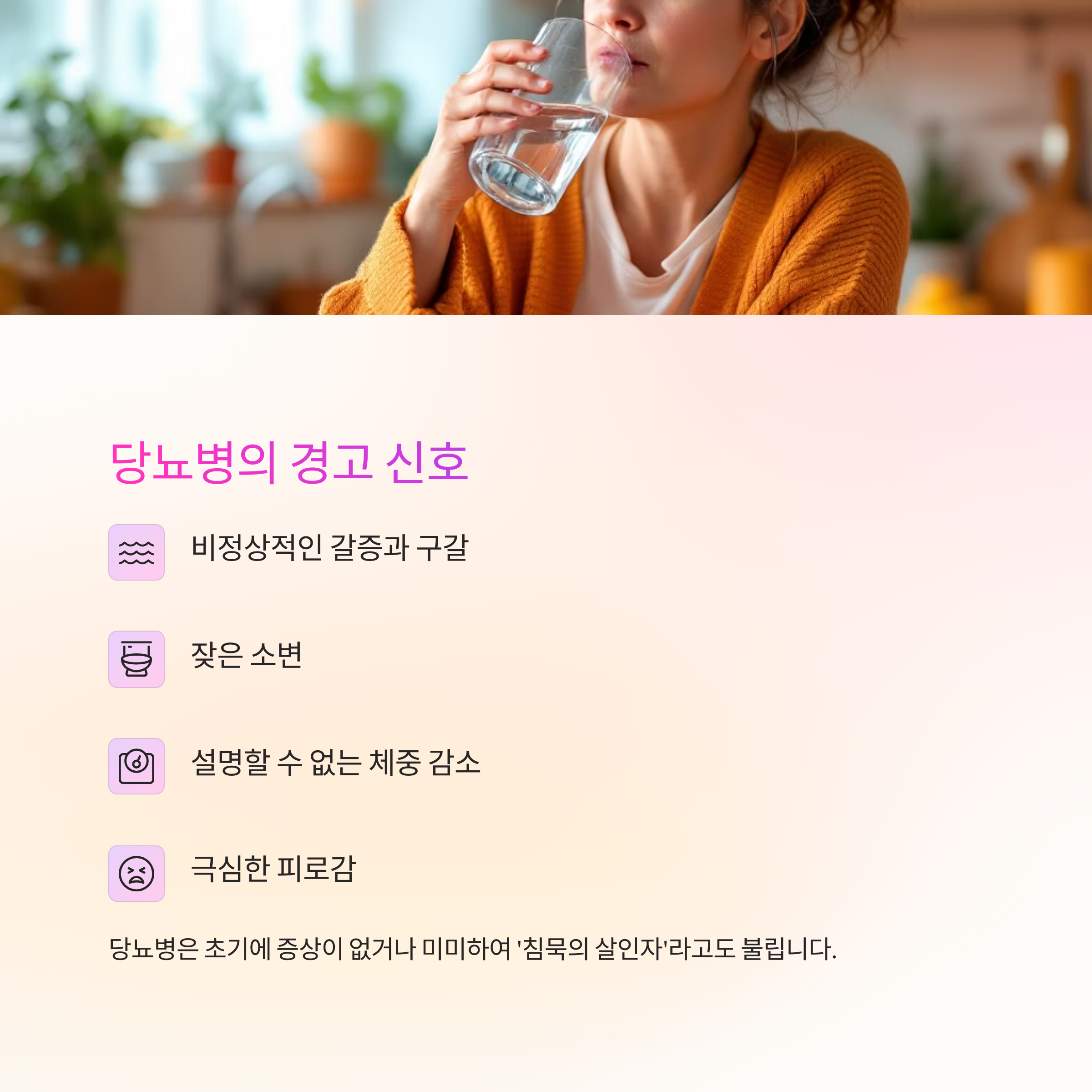 당뇨병은 초기에 증상이 없거나 미미하여 '침묵의 살인자'라고도 불립니다. 다음과 같은 증상에 주의하세요: