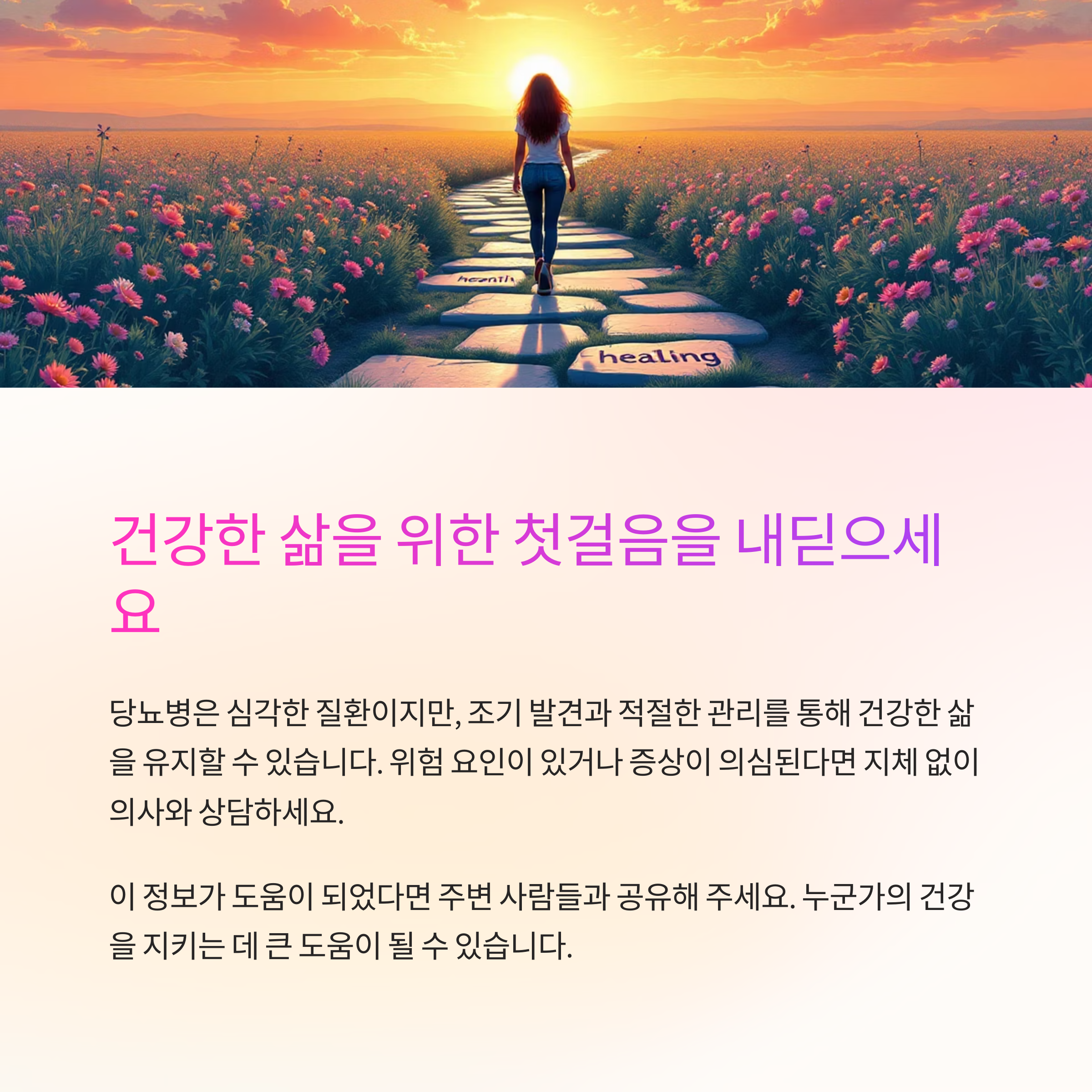 당뇨병은 심각한 질환이지만, 조기 발견과 적절한 관리를 통해 건강한 삶을 유지할 수 있습니다. 위험 요인이 있거나 증상이 의심된다면 지체 없이 의사와 상담하세요. 당뇨병 관리는 평생의 여정이며, 올바른 지식과 꾸준한 관리가 합병증 예방과 삶의 질 향상의 열쇠입니다.