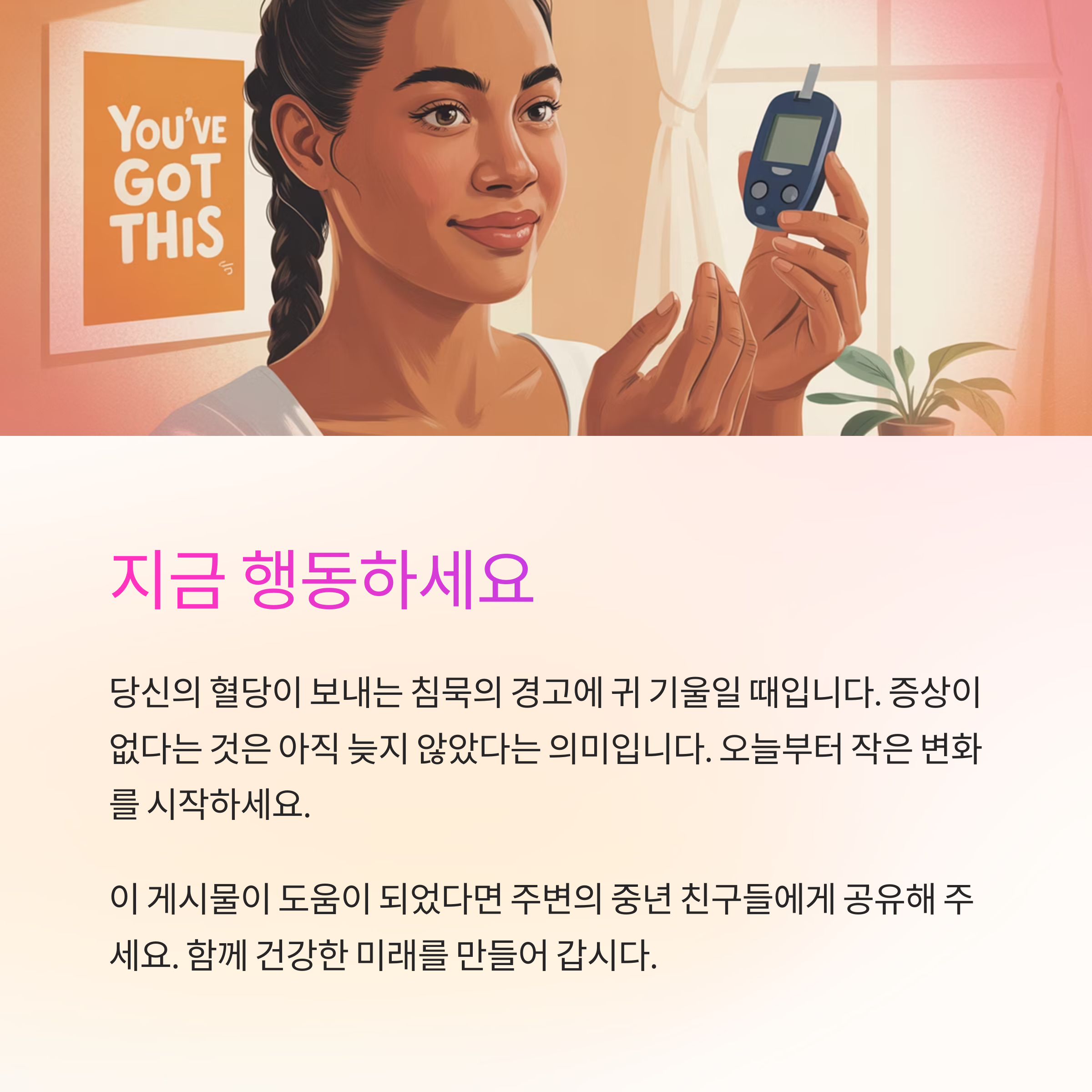 건강검진에서 '경계'라는 결과를 받았다면, 이를 삶의 전환점으로 삼으세요. 당신의 몸이 보내는 작은 경고 신호에 귀 기울일 때입니다. 아직 늦지 않았습니다. 오히려 지금이 가장 효과적으로 개입할 수 있는 완벽한 타이밍입니다.