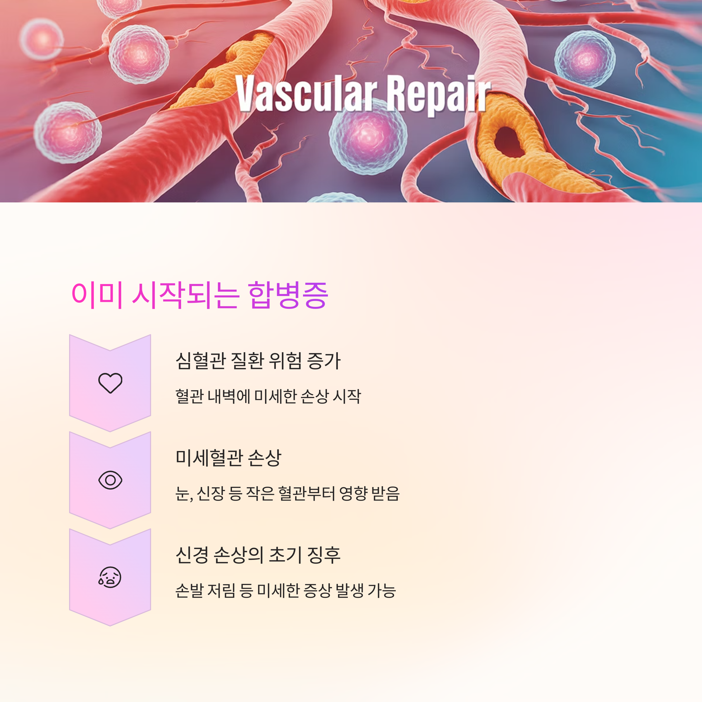 미세혈관 손상, 심혈관 질환 위험 증가, 신경 손상의 초기 징후가 당뇨 전단계에서부터 시작됩니다. 증상이 없다고 안심하기에는 너무 위험한 단계인 것입니다.