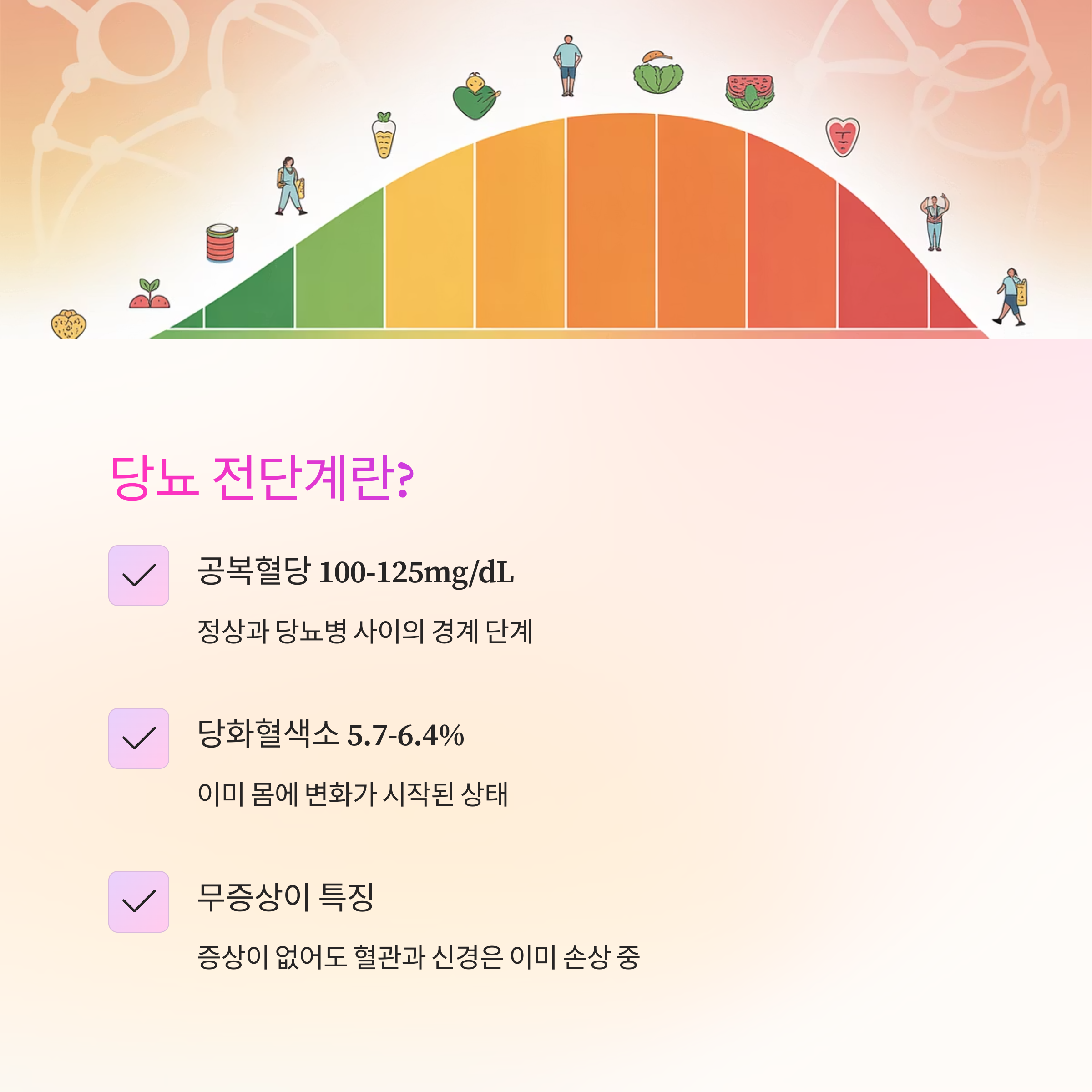 당뇨병은 하루아침에 생기지 않습니다. 정상에서 당뇨로 넘어가는 중간 단계, 바로 '당뇨 전단계'가 존재합니다. 공복혈당 100~125mg/dL, 또는 당화혈색소 5.7~6.4%에 해당하는 이 단계는 이미 우리 몸에 변화가 시작되었다는 신호입니다.