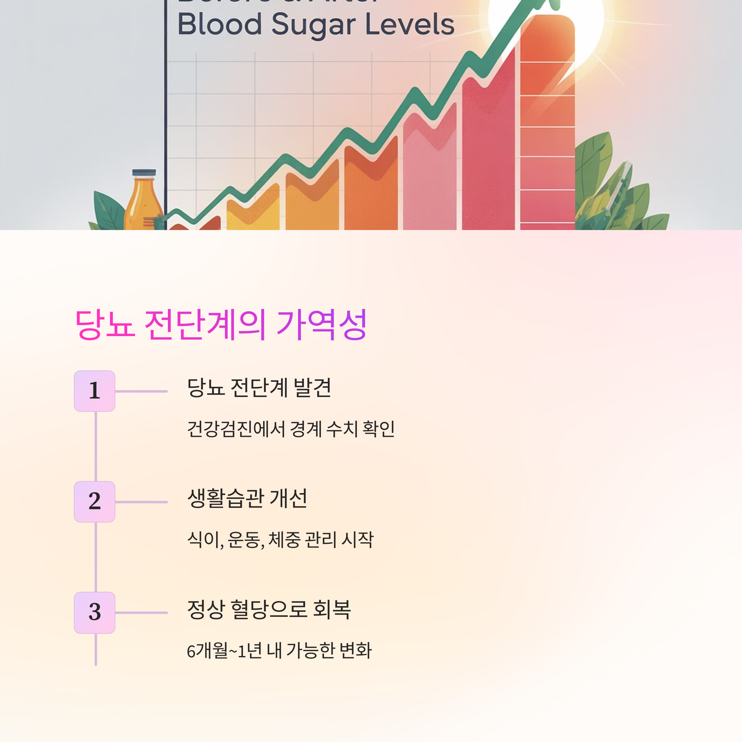 하지만 너무 걱정하지 마세요. 당뇨 전단계의 가장 큰 특징은 '가역성'입니다. 적절한 생활습관 개선을 통해 정상 혈당으로 돌아갈 수 있는 황금 기회의 시간입니다.
