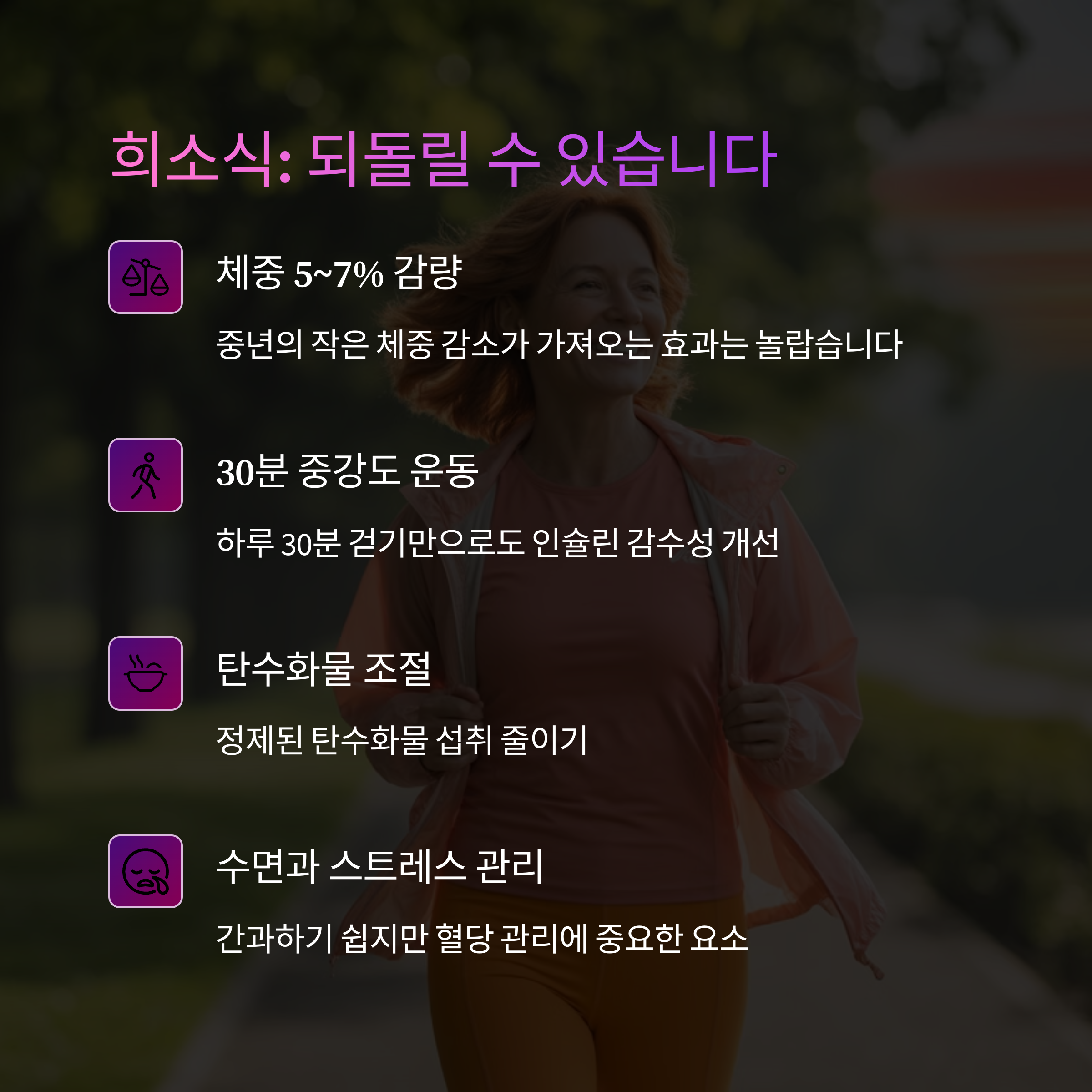 중년의 작은 체중 감소가 가져오는 혈당 개선 효과는 놀랍습니다. 80kg의 성인이라면 단 4~5kg만 감량해도 인슐린 저항성이 크게 개선됩니다.