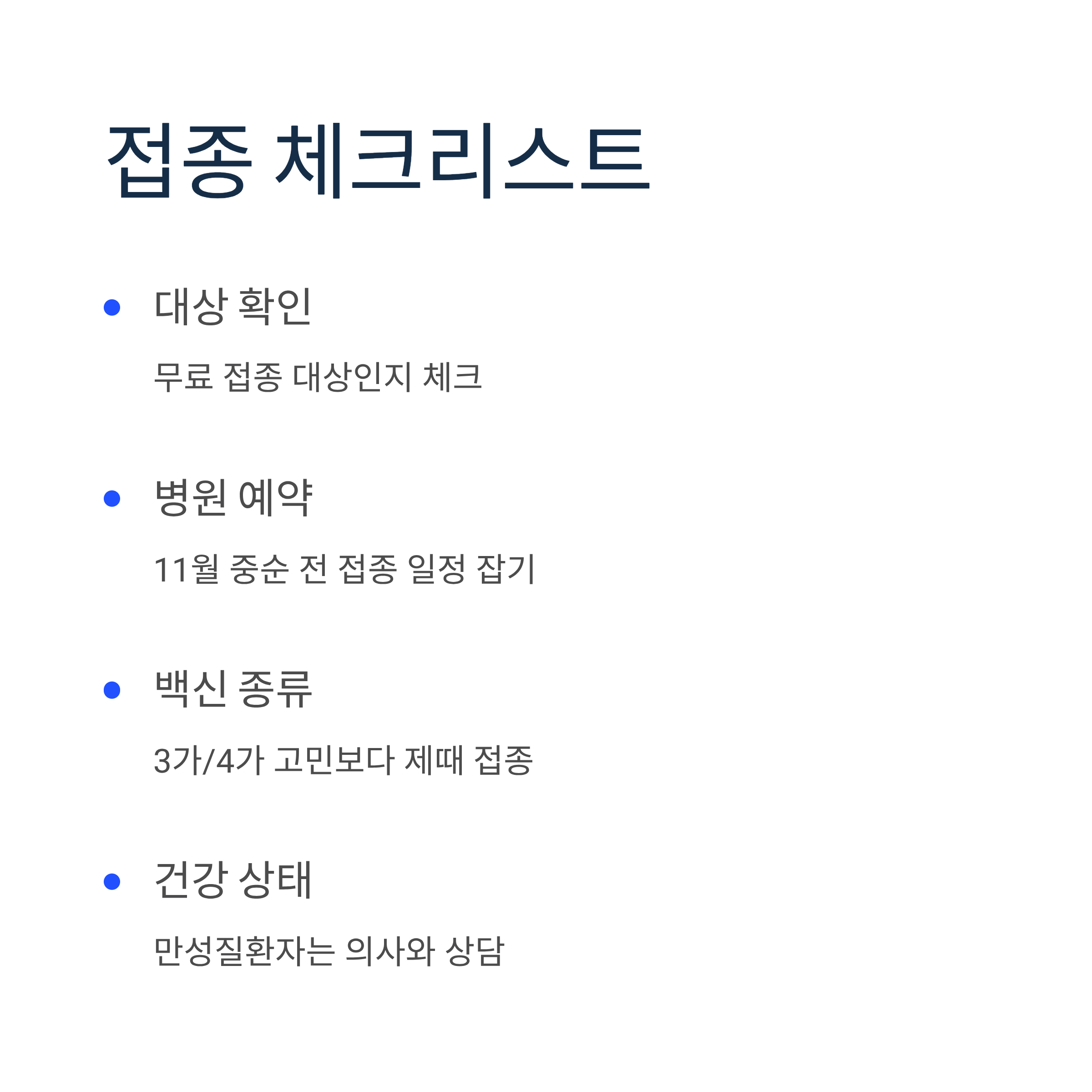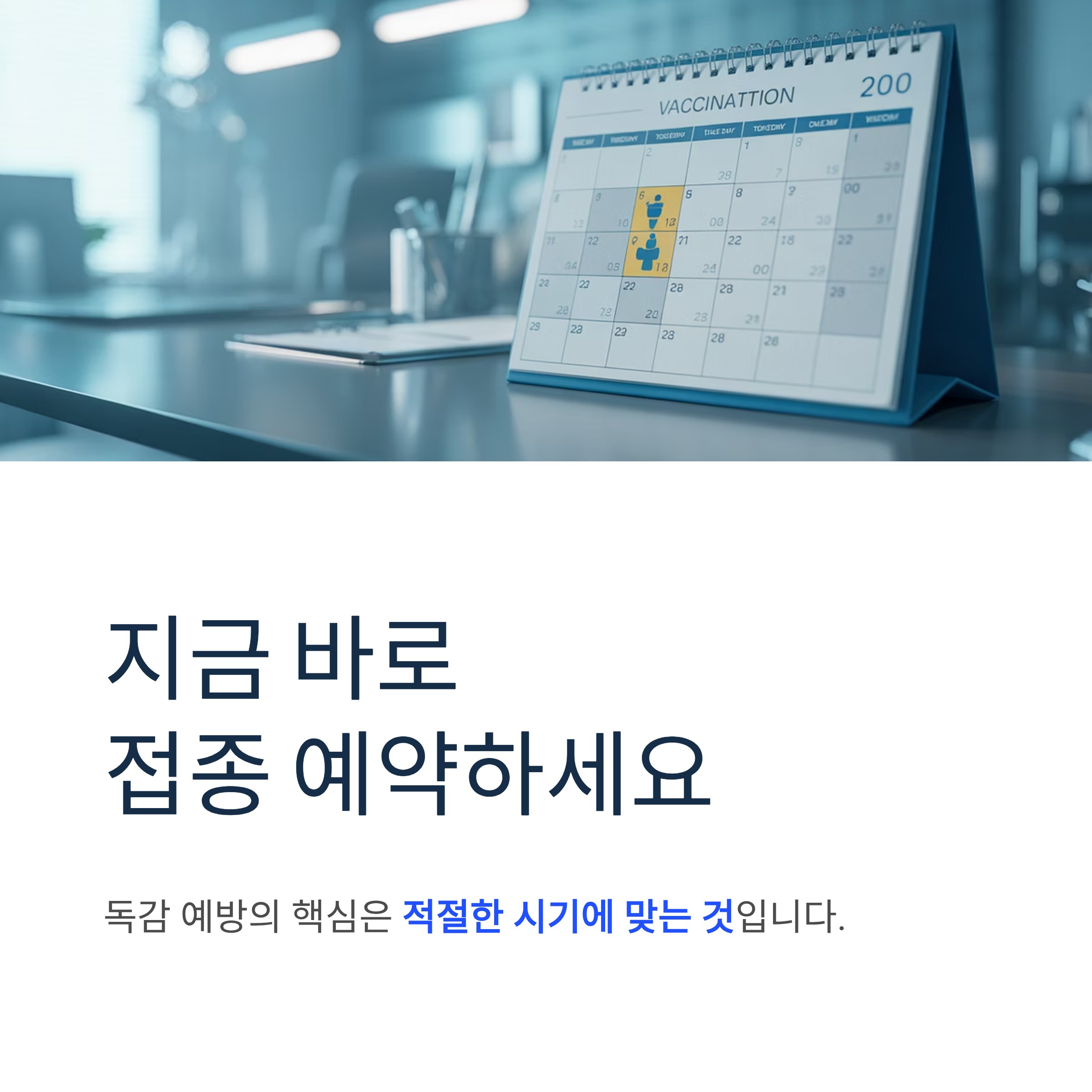 독감 백신은 접종 후 항체가 생성되기까지 약 2주가 걸립니다. 국내 독감은 주로 12월부터 1월 사이 1차 유행을 보이고 3~4월에 2차 유행을 하므로, 늦어도 11월 중순까지는 접종을 완료하는 것이 좋습니다. 접종 당일에는 신분증을 지참하고, 접종 후 20~30분간 의료기관에서 이상반응 관찰이 필요합니다.