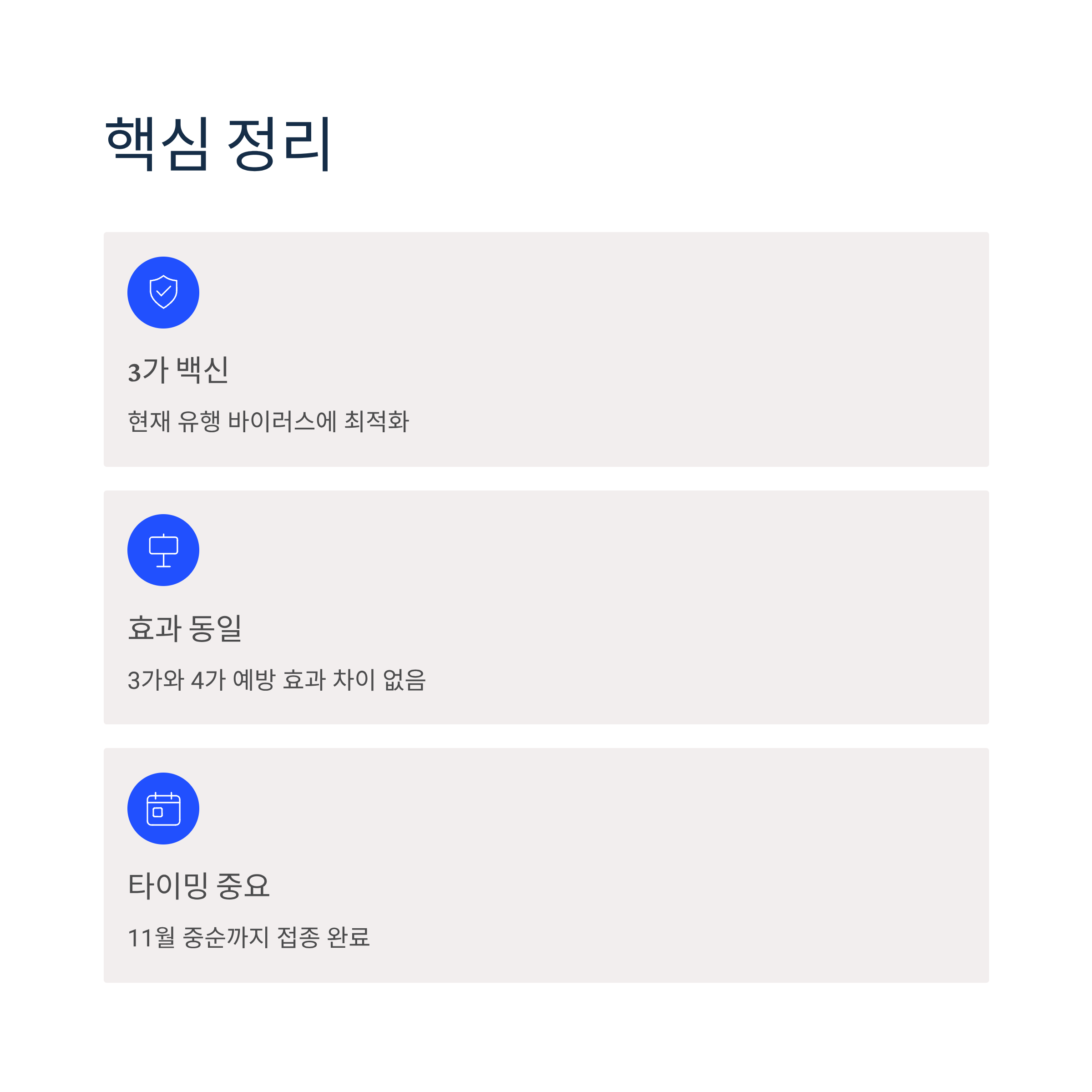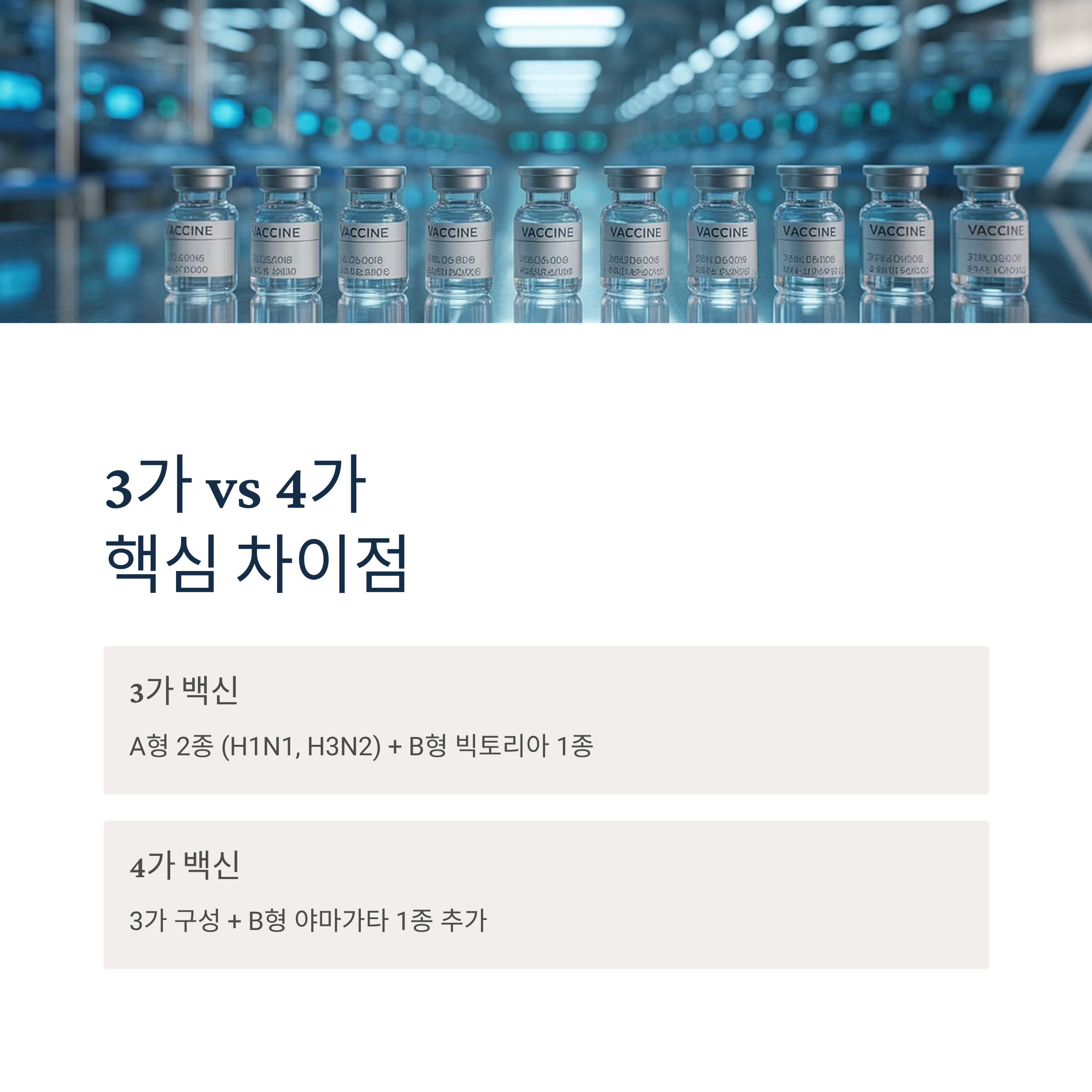 올해 독감 예방접종을 준비하면서 "3가 백신으로 바뀌었다는데 괜찮을까?"라는 걱정, 한 번쯤 하셨나요? 2025년 9월부터 국가예방접종이 기존 4가 백신에서 3가 백신으로 전환되면서 많은 분들이 예방효과에 대한 의문을 가지고 계십니다. 결론부터 말씀드리면, 예방효과와 안전성은 4가와 동일합니다. 오늘은 독감 3가와 4가 백신의 차이점과 왜 올해부터 3가 백신으로 전환되었는지 자세히 알아보겠습니다.