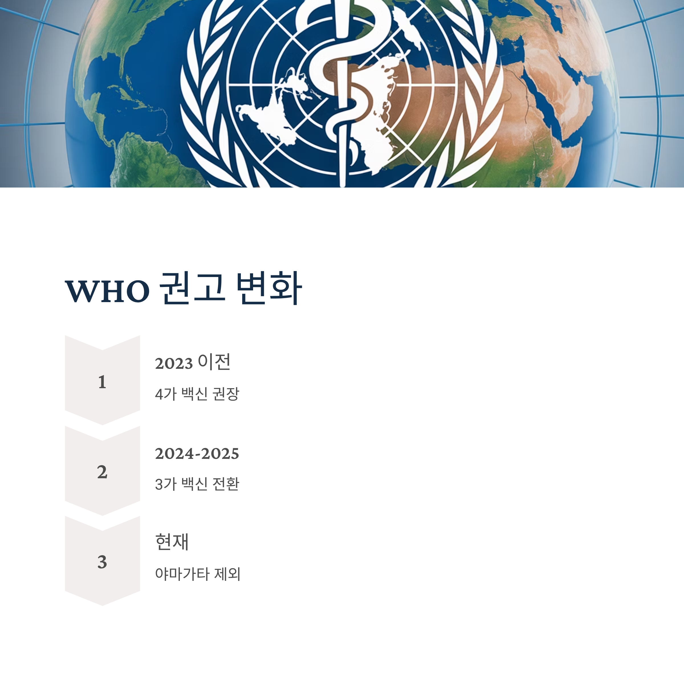 세계보건기구(WHO)가 2024년부터 3가 백신을 권고하면서 한국을 포함한 전 세계 많은 국가들이 3가 백신으로 전환하고 있습니다. 가장 큰 이유는 B형 야마가타 계통 바이러스가 사실상 사라졌기 때문입니다. 2020년 코로나19 팬데믹 이후 야마가타 계통 바이러스는 전 세계적으로 단 한 건도 검출되지 않았으며, 전문가들은 이 바이러스가 멸종된 것으로 추정하고 있습니다. 존재하지 않는 바이러스를 예방할 필요가 없다는 과학적 근거에 따라 백신 구성이 변경된 것입니다.