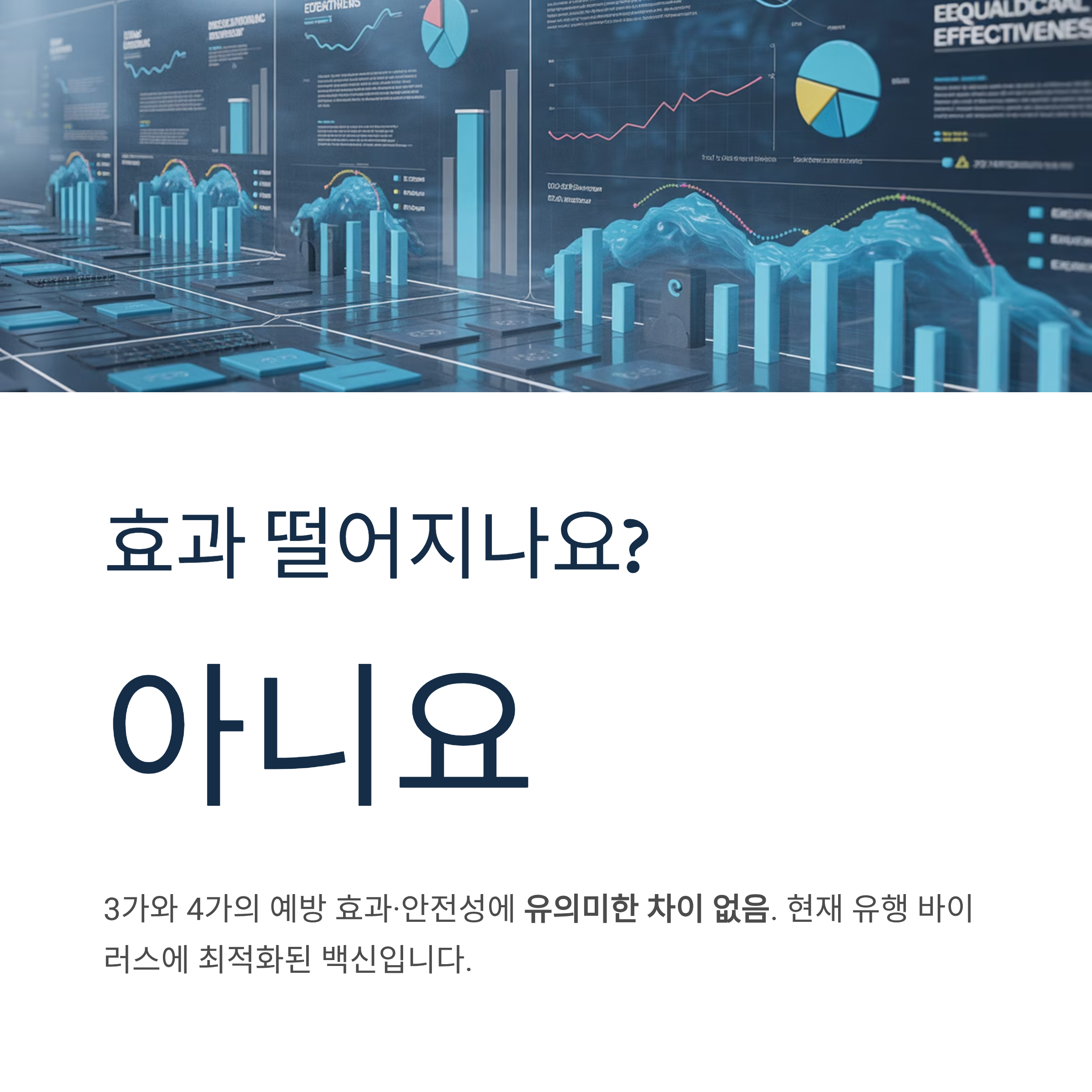 질병관리청과 국제 연구 결과에 따르면, 3가 백신과 4가 백신의 예방효과는 동일합니다. 건강한 성인 기준으로 두 백신 모두 70~90%의 예방률을 보이며, 중증 합병증 및 사망 예방 효과도 같습니다. 야마가타 계통 바이러스가 더 이상 유행하지 않는 상황에서 4가 백신을 접종해도 실질적인 추가 보호 효과는 없습니다. 안전성 측면에서도 두 백신 간 유의미한 차이가 없는 것으로 확인되었습니다.