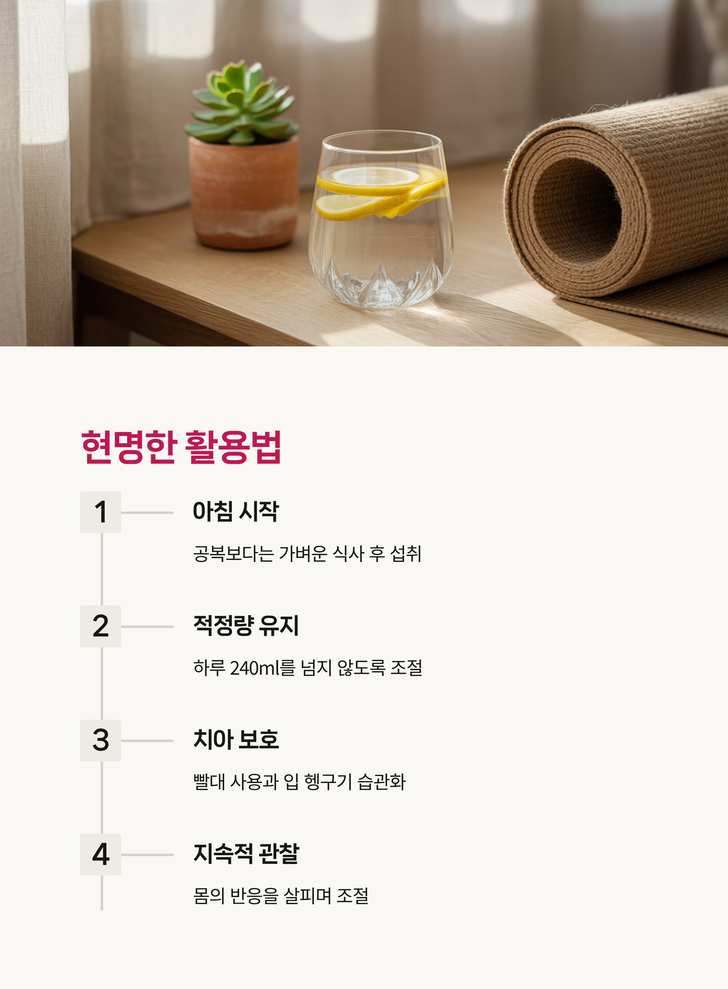 건강한 라이프스타일의 일부로 레몬수를 현명하게 활용해보세요. 작은 변화가 큰 건강 개선으로 이어질 수 있습니다.