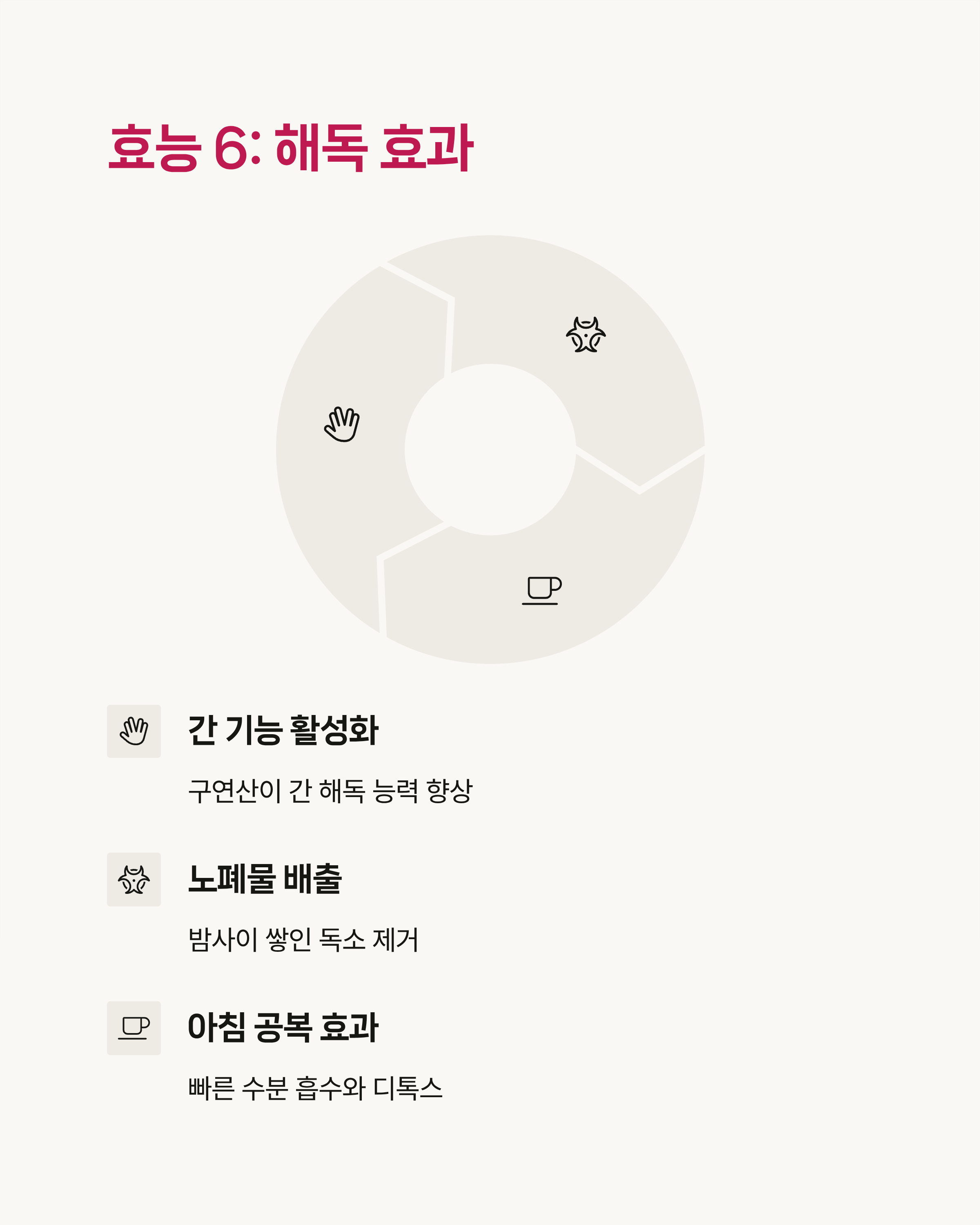 아침 공복에 마시면 밤사이 쌓인 독소가 배출되고 수분을 빠르게 흡수하는 효과를 누릴 수 있습니다.