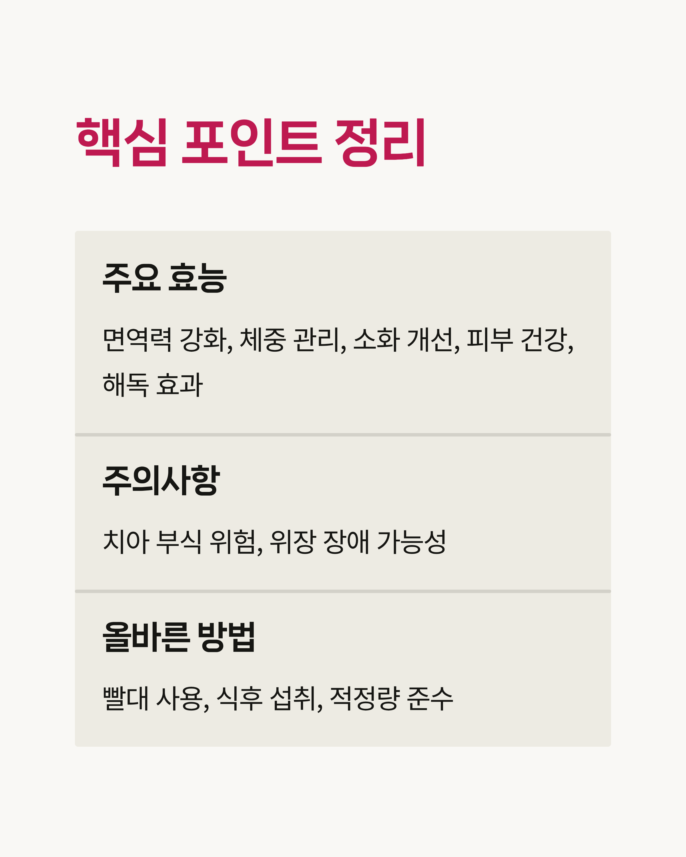 - 효능: 면역력 강화, 체중 관리, 소화 개선, 피부 건강, 해독 효과