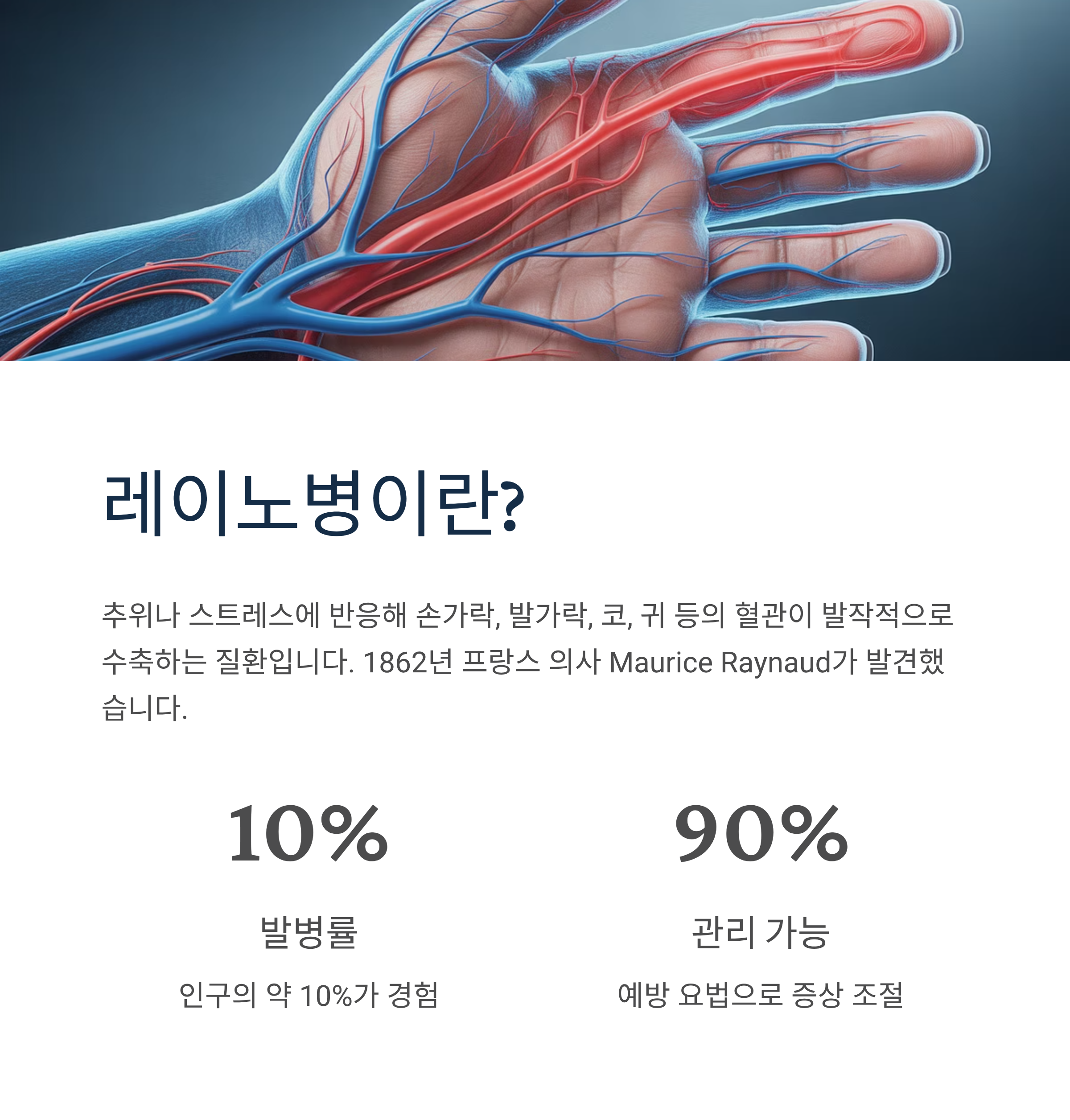 레이노병은 추운 곳에 나가거나 찬물에 손발을 담글 때, 또는 과도한 스트레스에 노출될 때 손가락, 발가락, 코, 귀 등의 끝부분 혈관이 발작적으로 수축하여 피부 색깔이 변하는 질환입니다. 1862년 프랑스 의사 Maurice Raynaud가 발견하여 그의 이름을 따서 명명되었습니다.