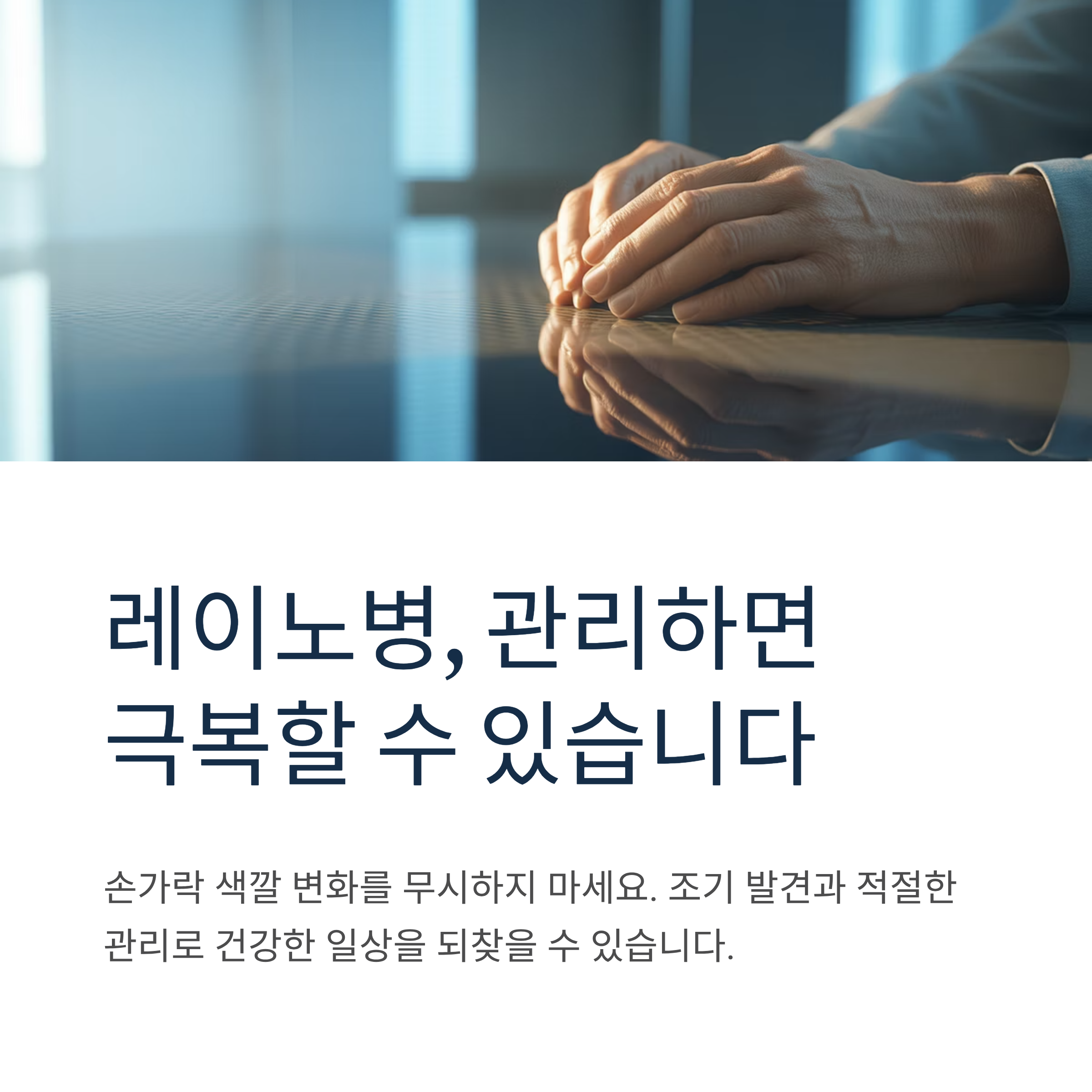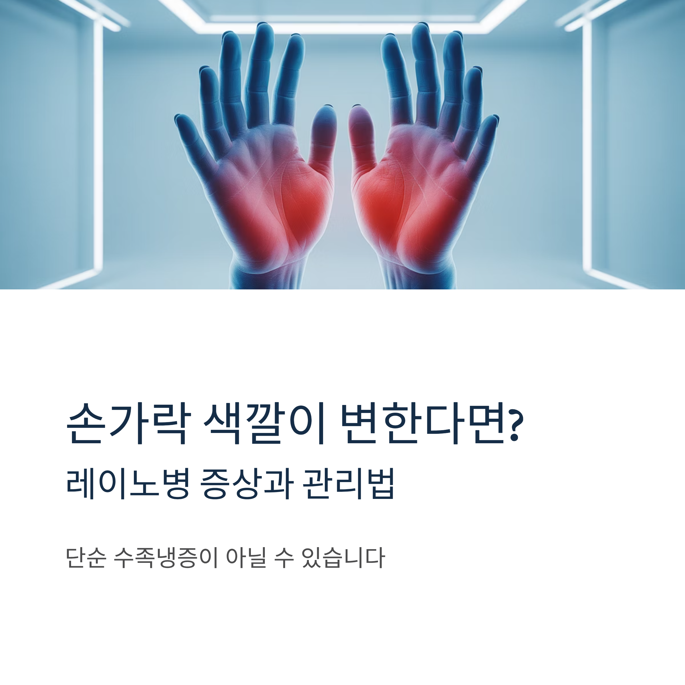 손발의 감각이 이상하거나 손발이 차다고 느끼는 사람 중 상당수가 레이노병으로 진단받습니다. 손가락 색깔이 추위에 반복적으로 변한다면 류마티스 내과를 방문하여 정확한 진단을 받는 것이 중요합니다. 레이노병은 일부 환자에서 전신성 경화증과 같은 류마티스 질환의 초기 증상으로 나타날 수 있기 때문입니다.