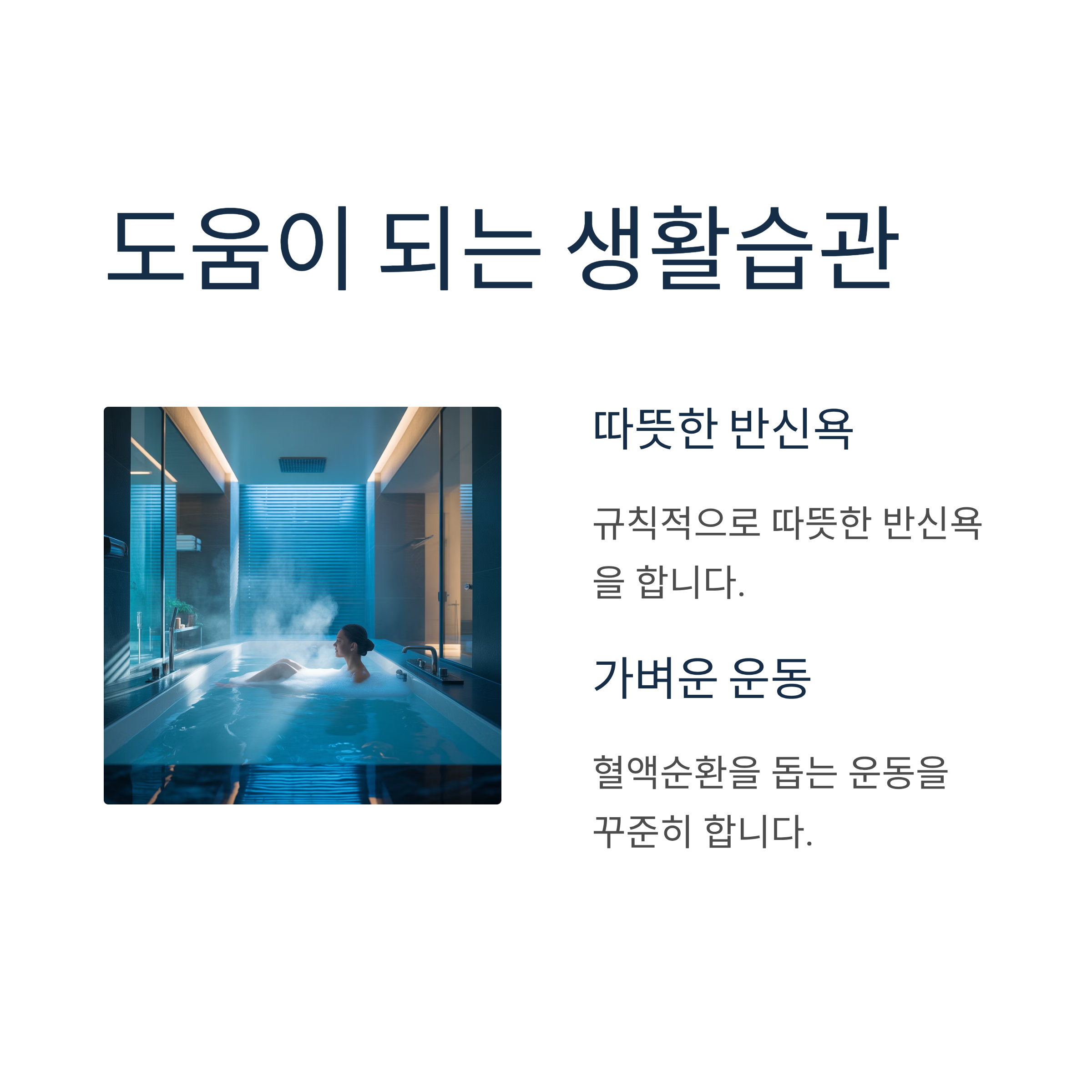 레이노병은 우리나라처럼 사계절이 뚜렷한 기후 조건에서 특히 겨울철 건강관리가 중요합니다. 따뜻한 반신욕을 규칙적으로 하고, 혈액순환을 돕는 가벼운 운동을 꾸준히 하는 것이 좋습니다.