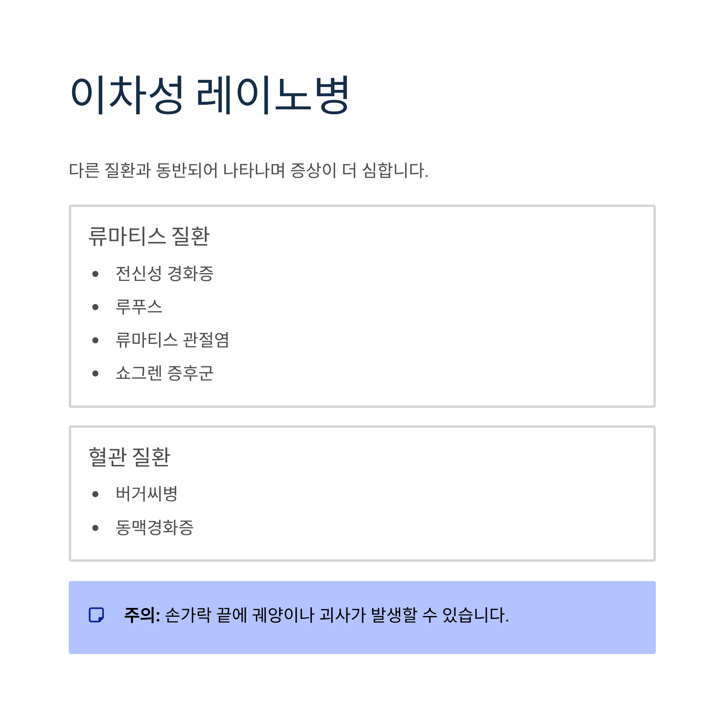 이차성 레이노병은 전신성 경화증, 루푸스, 류마티스 관절염, 쇼그렌 증후군 등의 류마티스 질환이나 버거씨병, 동맥경화증 같은 혈관 질환이 있을 때 발생합니다. 일차성보다 증상이 심하며 손가락 끝에 궤양이나 괴사가 발생할 수도 있습니다.