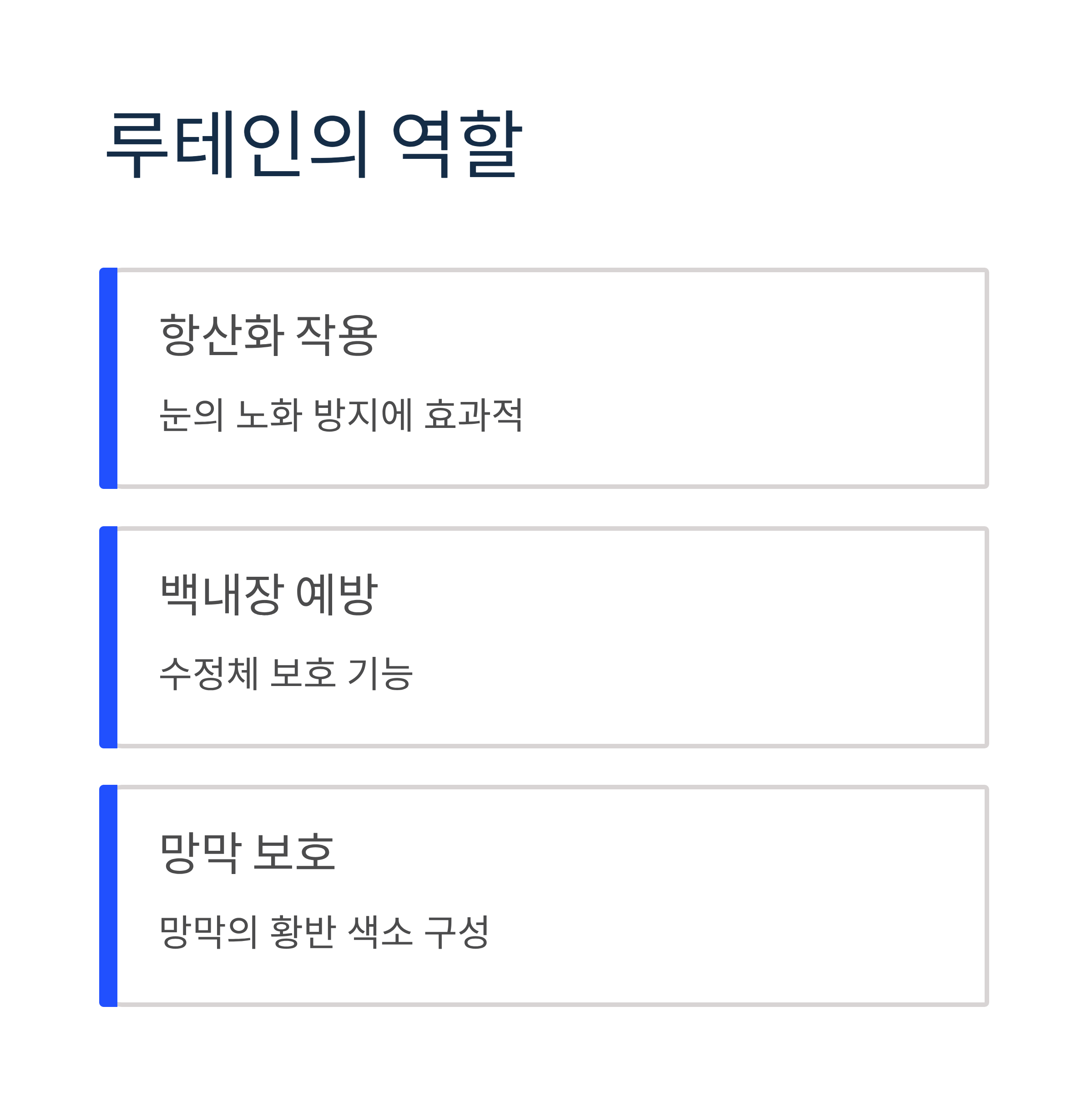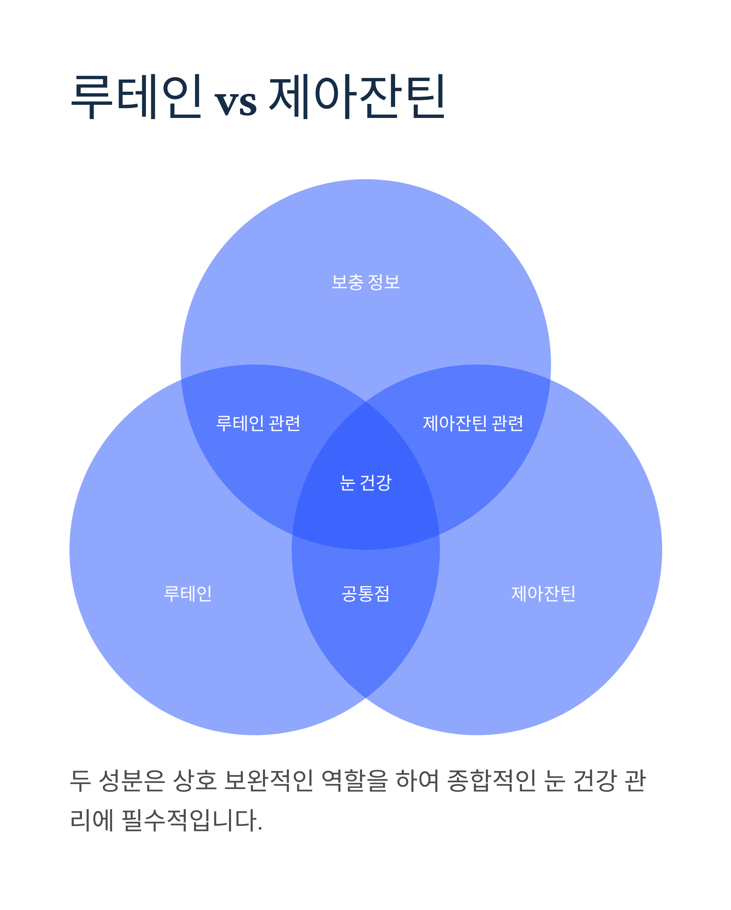 두 성분 모두 시각 보호와 관련된 기능성 천연색소로, 상호 보완적인 역할을 하여 종합적인 눈 건강 관리에 필수적입니다.