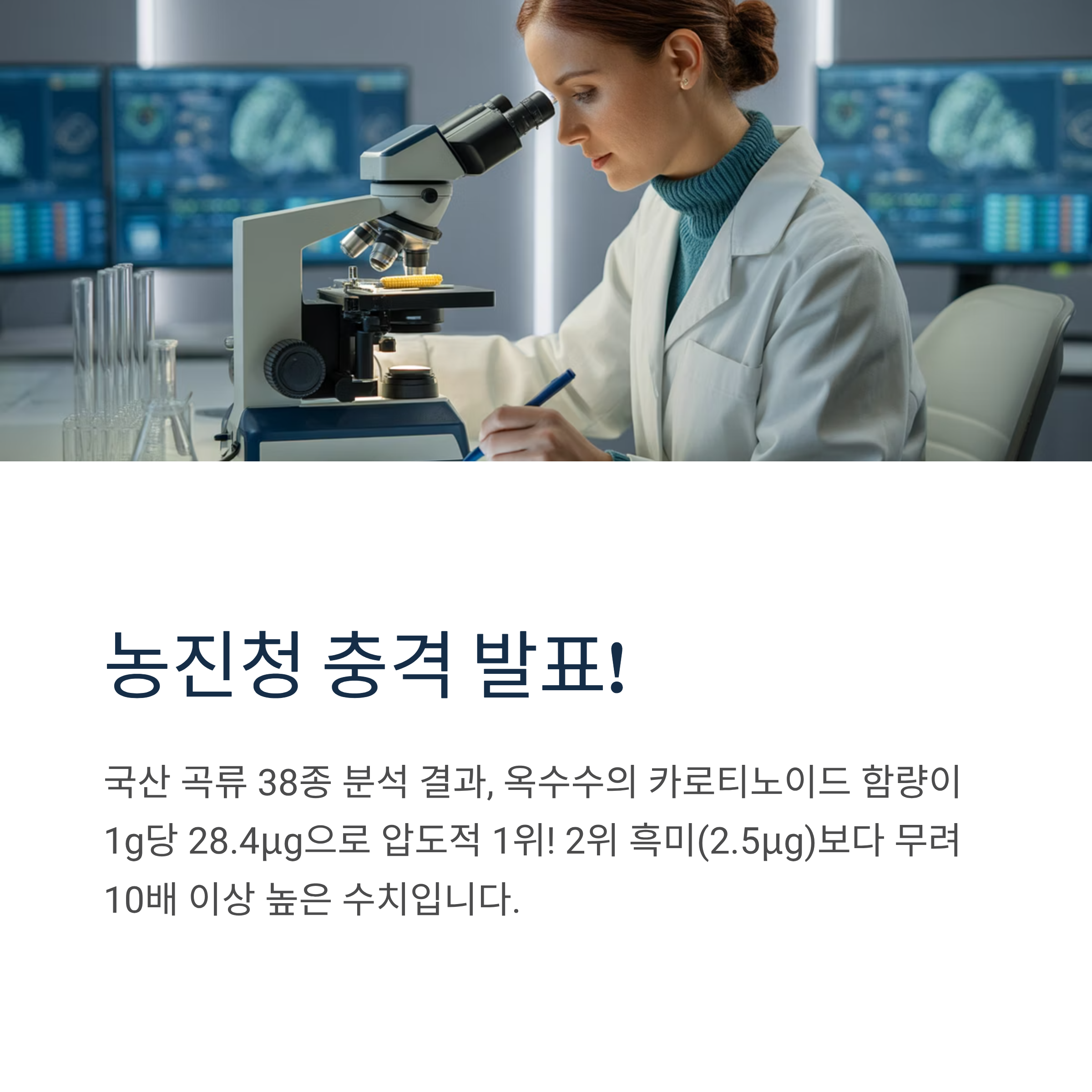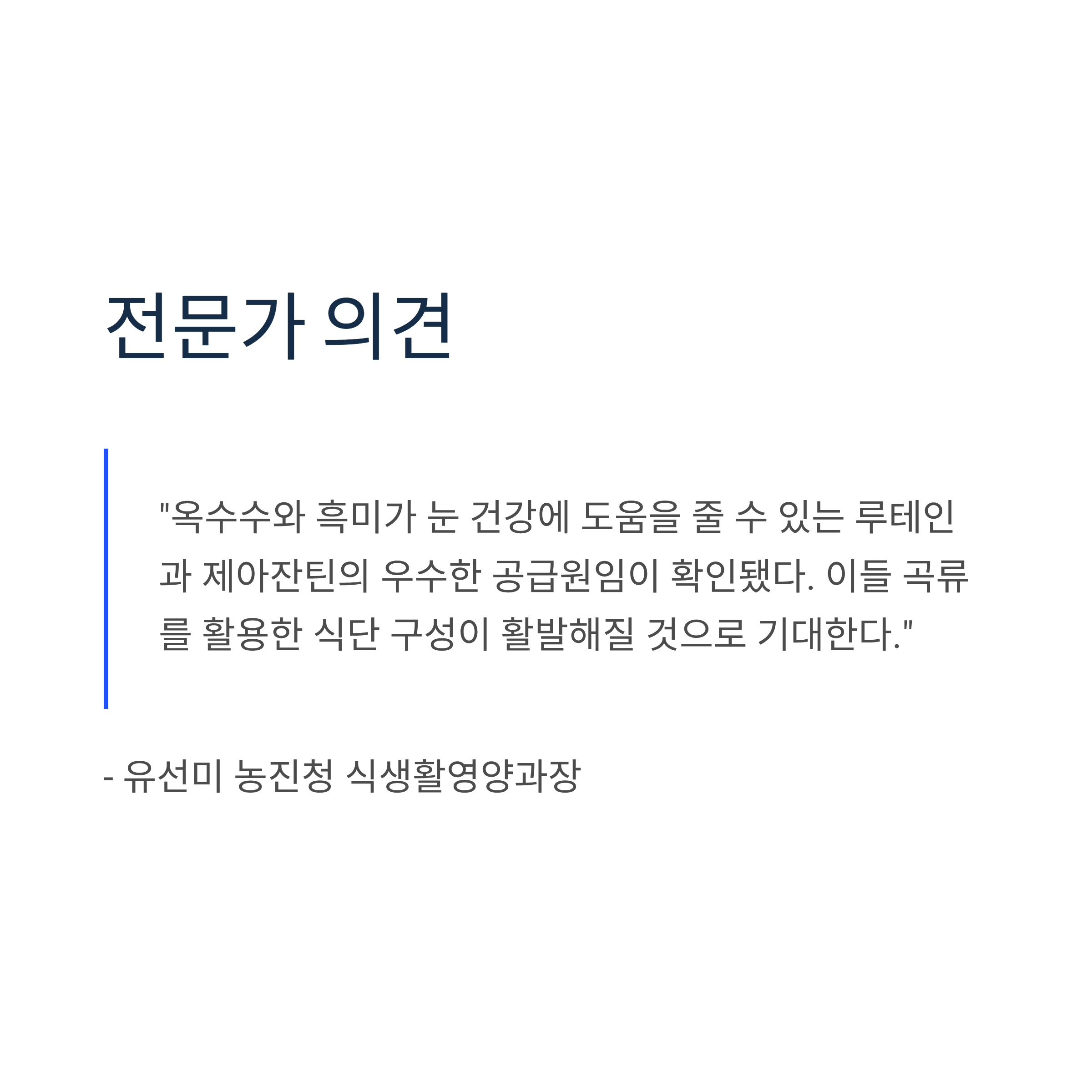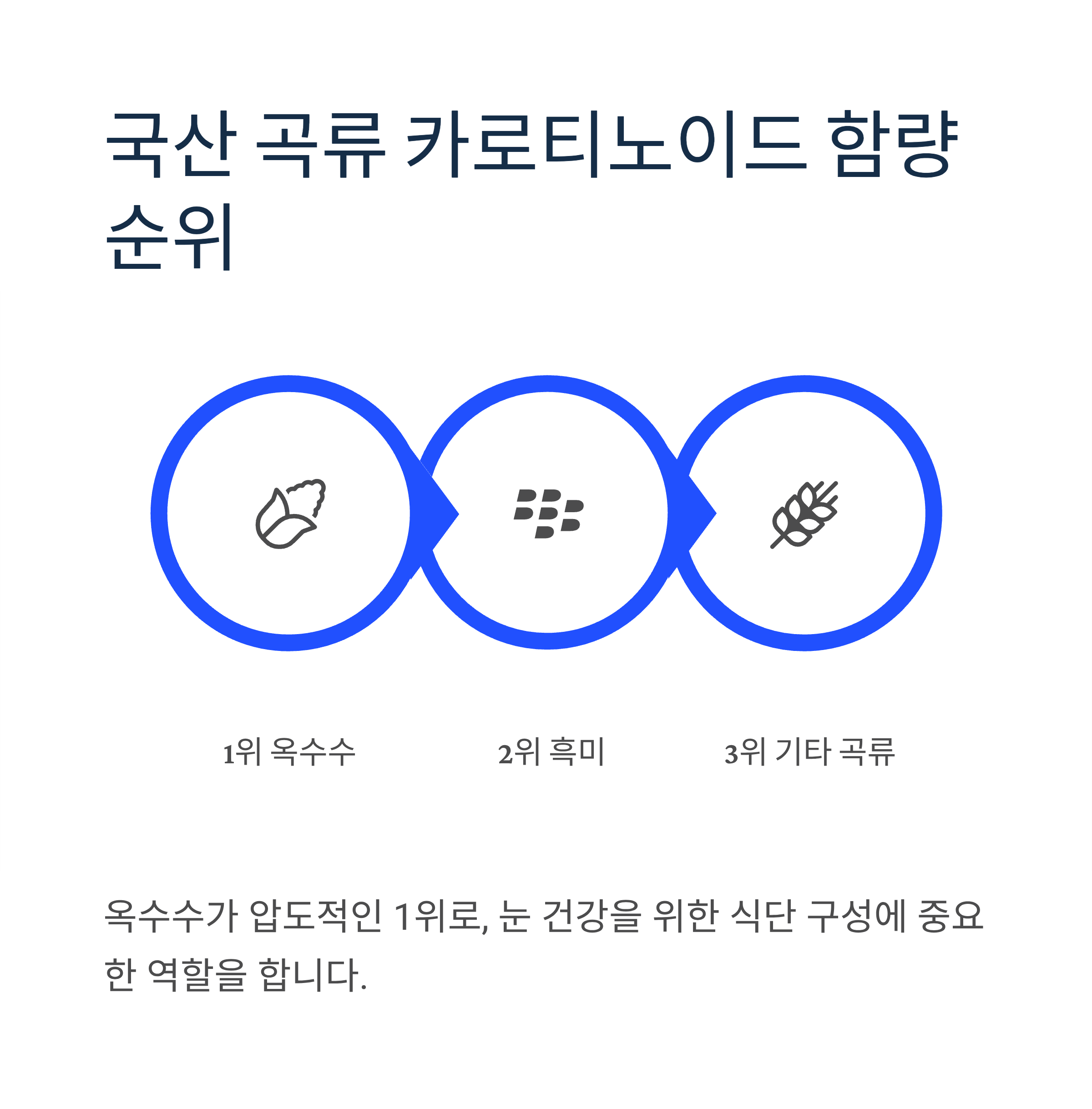 이 결과는 눈 건강을 위한 식단 구성에서 옥수수와 흑미의 중요성을 다시 한번 확인해주는 중요한 데이터입니다.