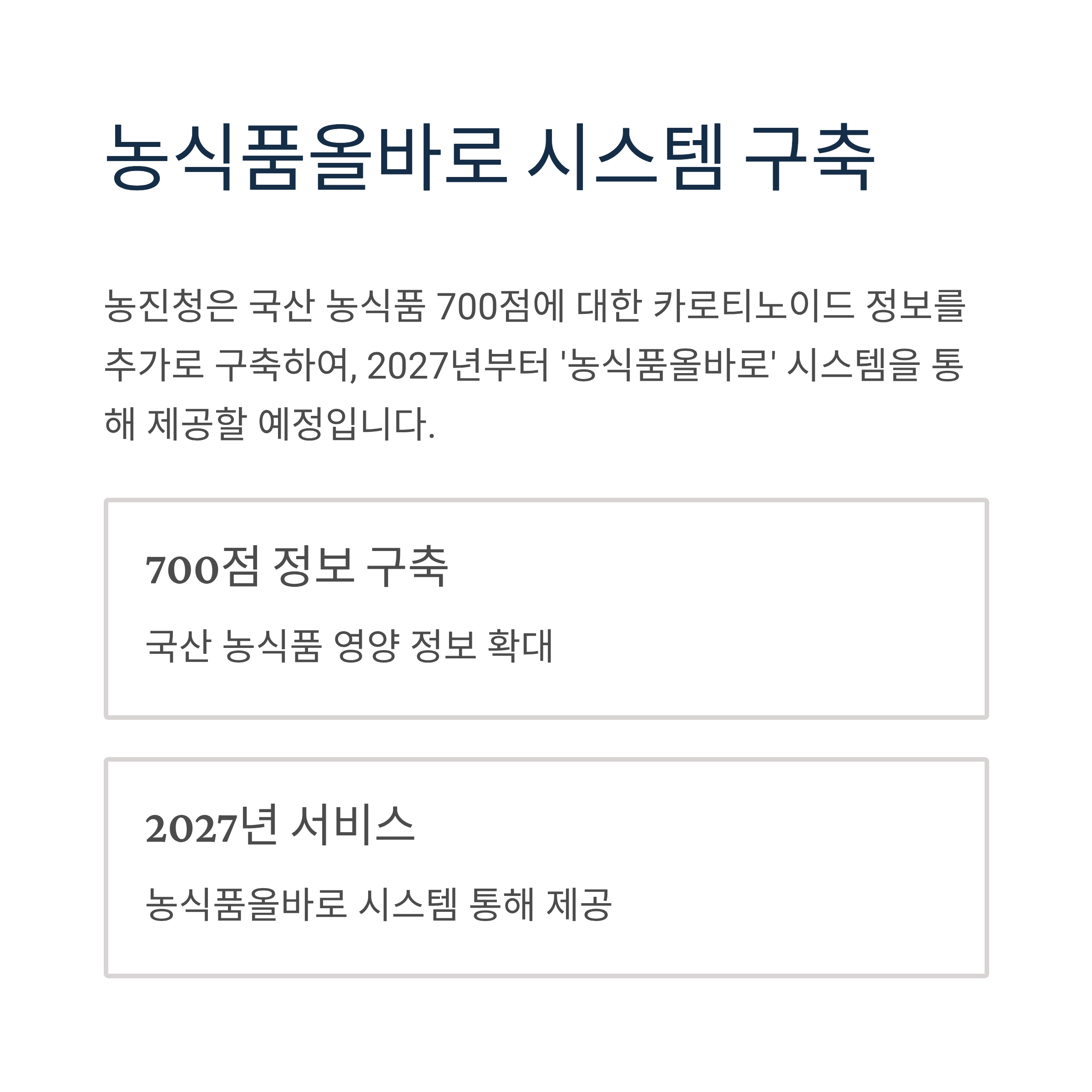 농촌진흥청은 이번 조사 결과 외에도 국산 농식품 700점에 대한 카로티노이드 정보를 추가로 구축하여, 2027년부터 농식품종합정보시스템 '농식품올바로'(koreanfood.rda.go.kr)를 통해 제공할 계획이라고 발표했습니다.