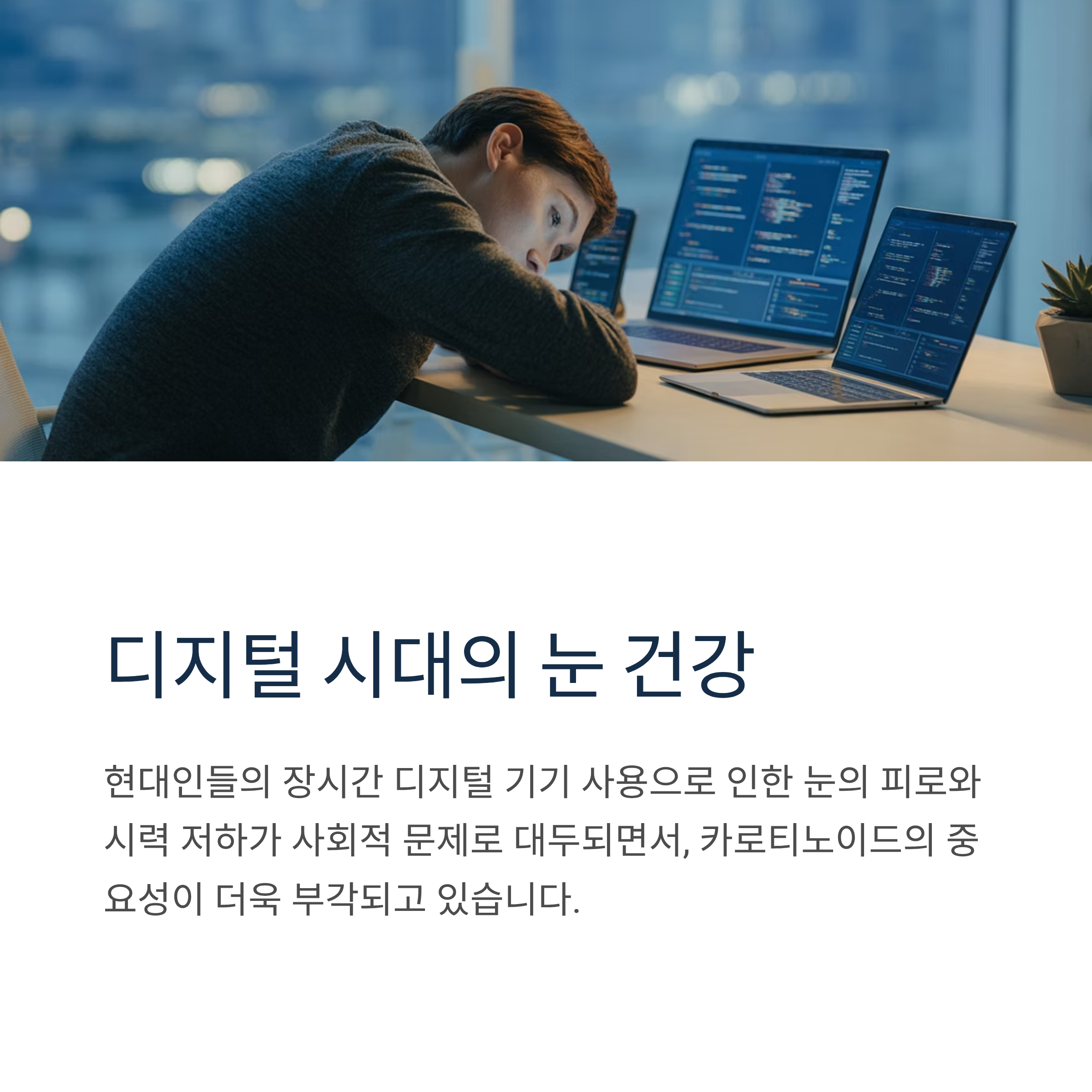 ⚠️ 중요: 카로티노이드가 부족할 경우 시각 기능 저하를 비롯한 다양한 건강 문제가 발생할 수 있어, 규칙적인 섭취가 매우 중요합니다. 특히 현대인들의 장시간 디지털 기기 사용으로 인한 눈의 피로와 시력 저하가 사회적 문제로 대두되면서, 카로티노이드의 중요성이 더욱 부각되고 있습니다.