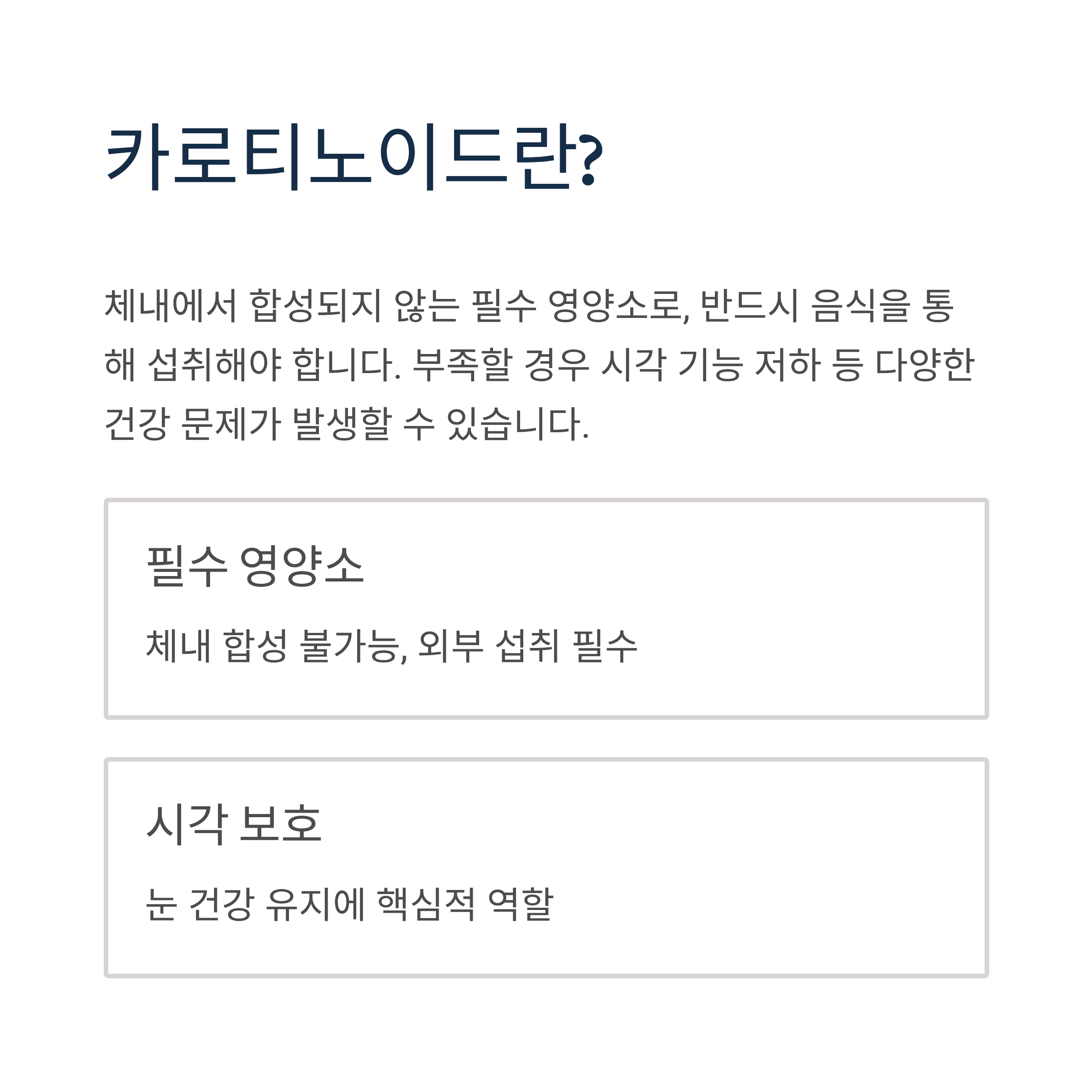 카로티노이드는 식이성 프로비타민 A 전구체인 레티노이드의 주요 공급원으로, 체내에서 합성되지 않는 필수 영양소입니다. 이는 반드시 음식이나 건강보조식품을 통해 외부에서 섭취해야 한다는 의미입니다.