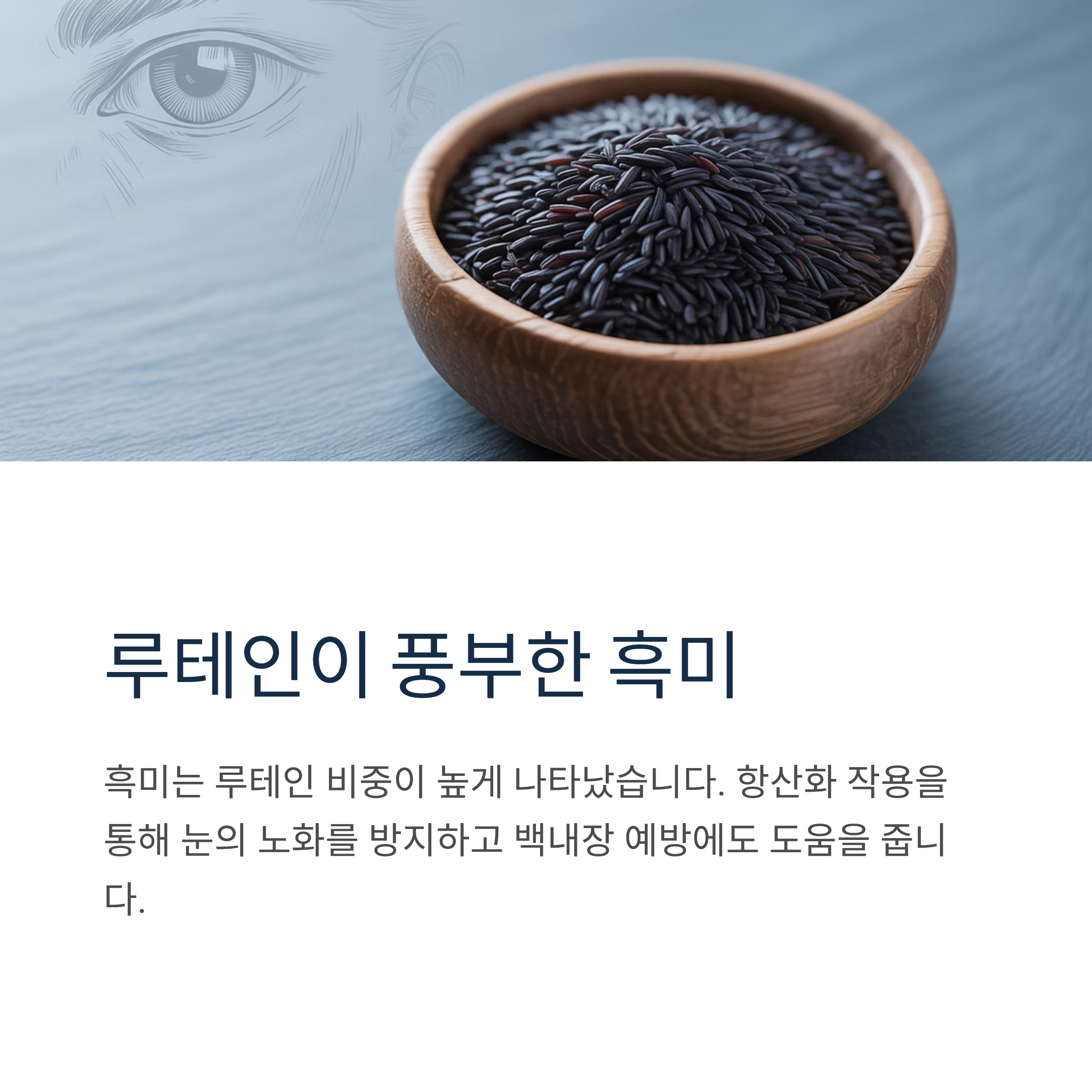 반면 흑미는 루테인 비중이 높게 나타났습니다. 루테인은 제아잔틴과 함께 망막의 황반 색소를 구성하며, 항산화 작용을 통해 눈의 노화를 방지하고 백내장 예방에도 도움을 줍니다.