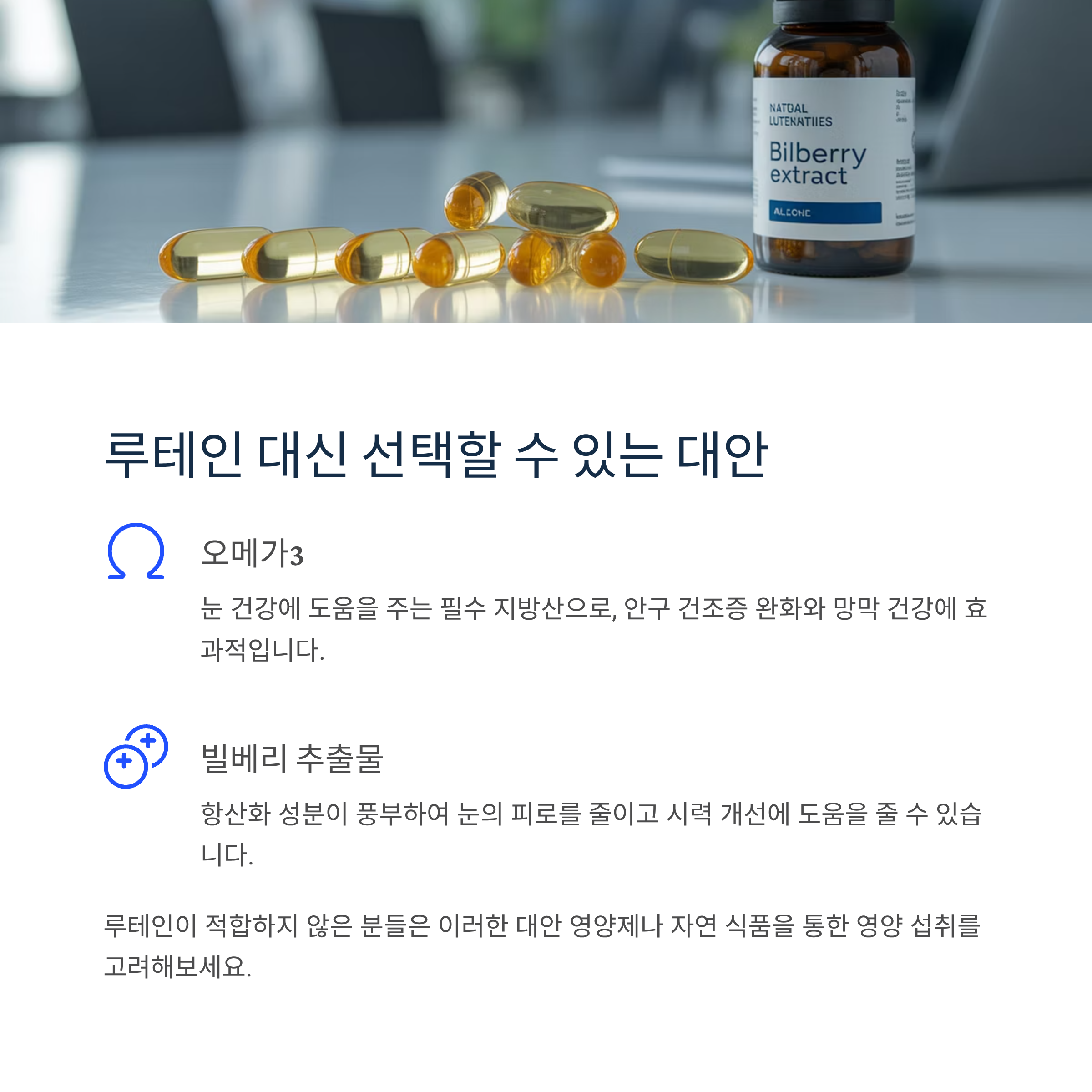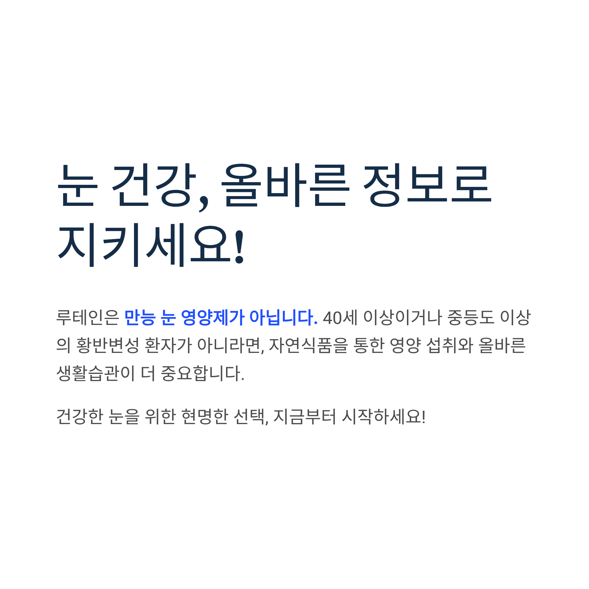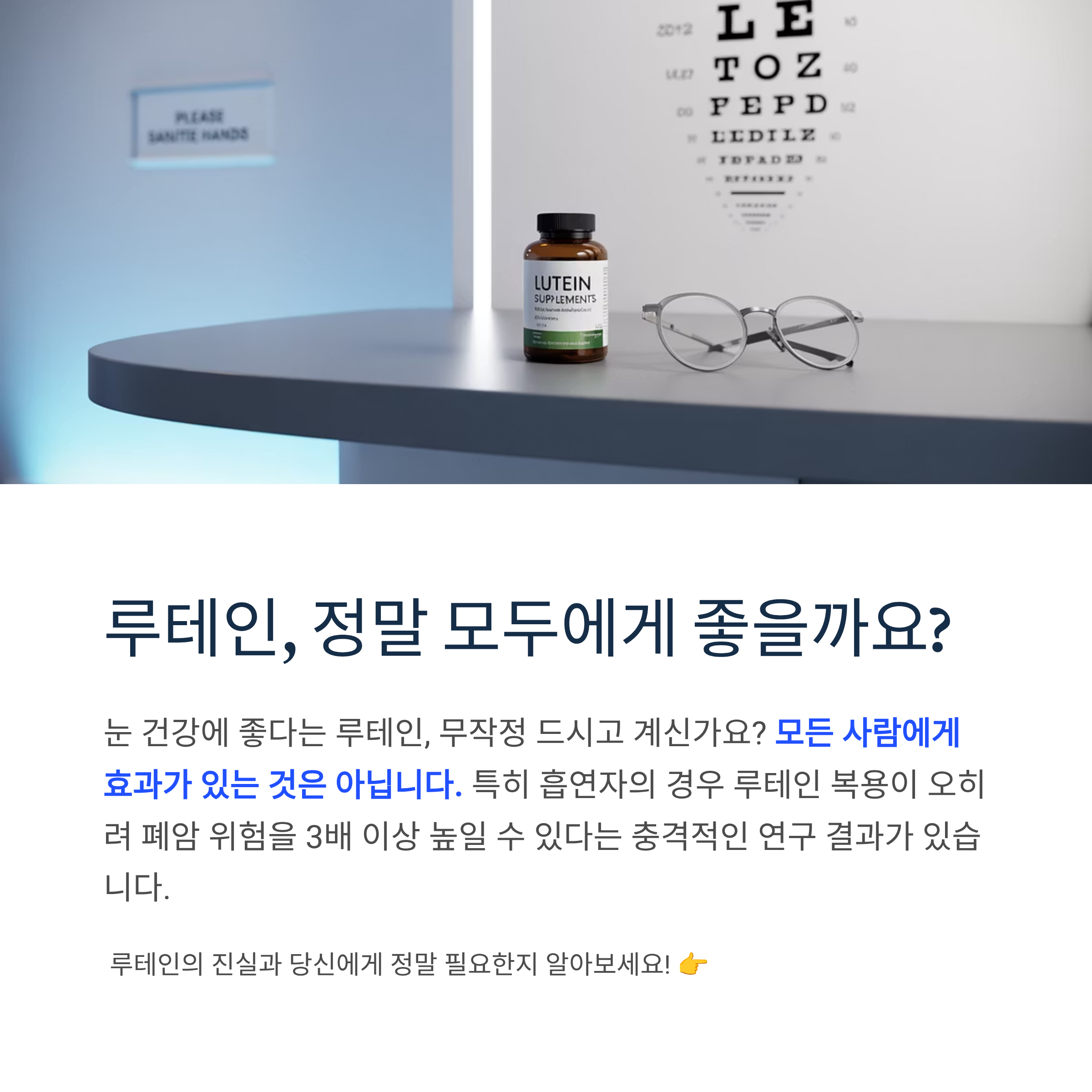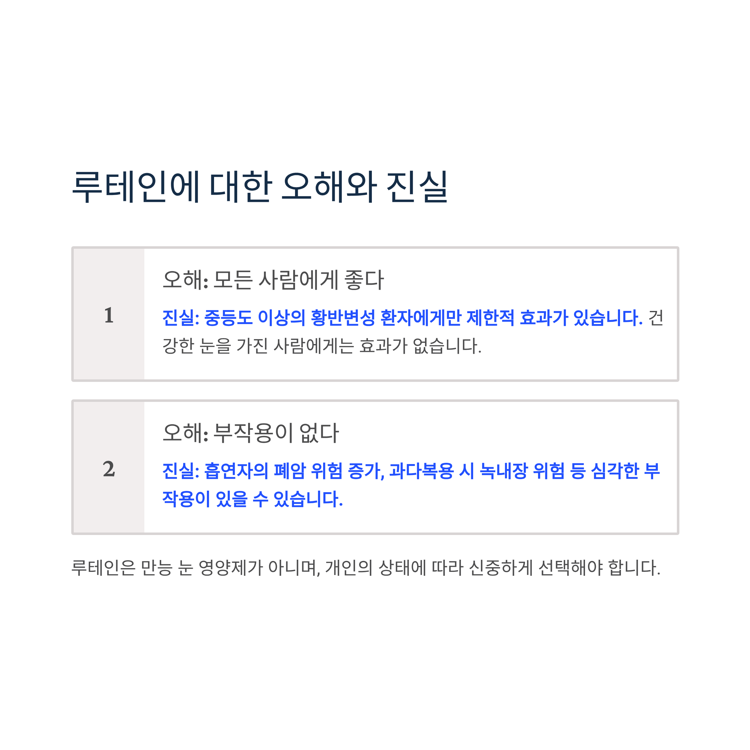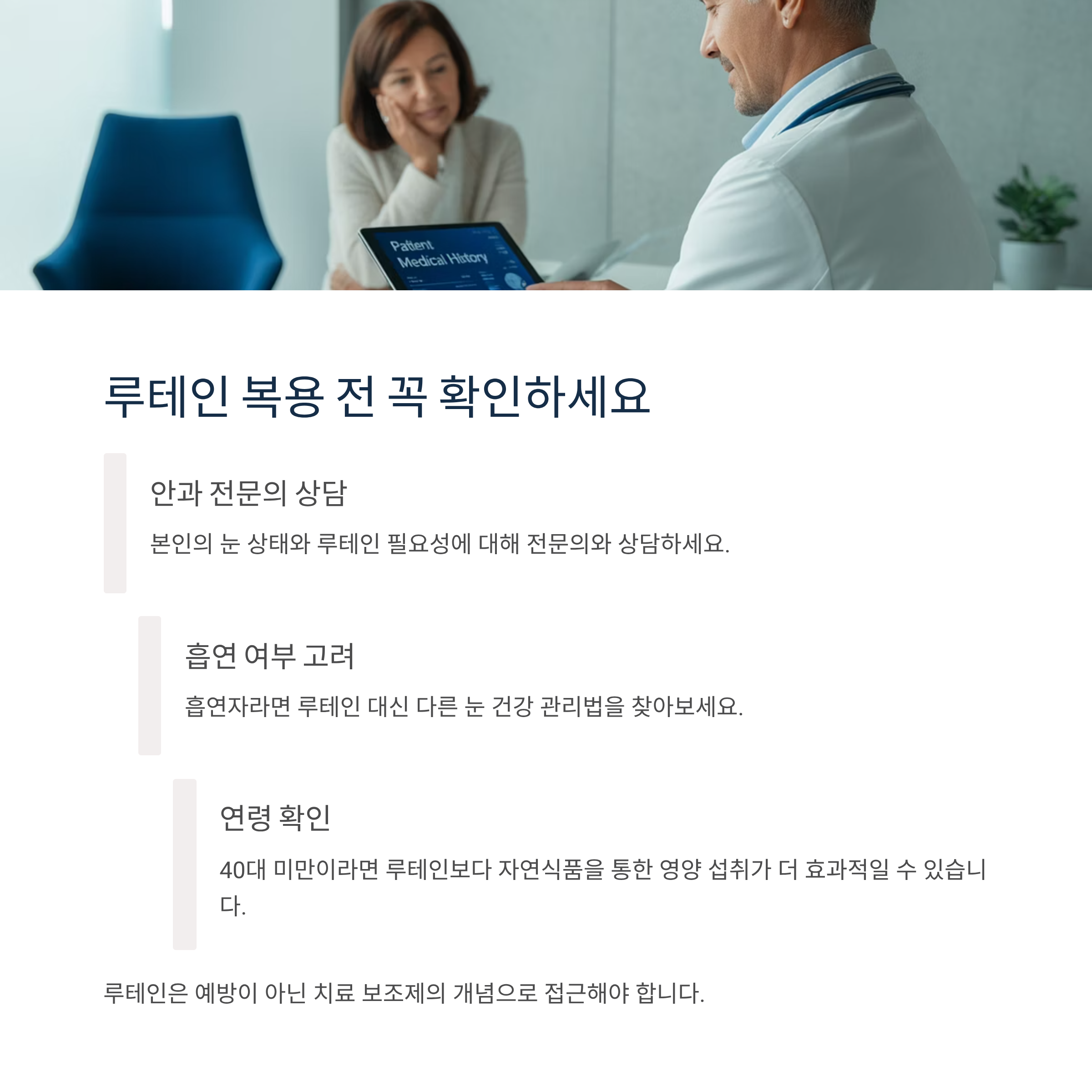 핵심 포인트: 루테인은 예방이 아닌 치료 보조제의 개념으로 접근해야 하며, 복용 전 안과 전문의와 상담을 통해 본인에게 필요한지 확인하는 것이 가장 중요합니다.
