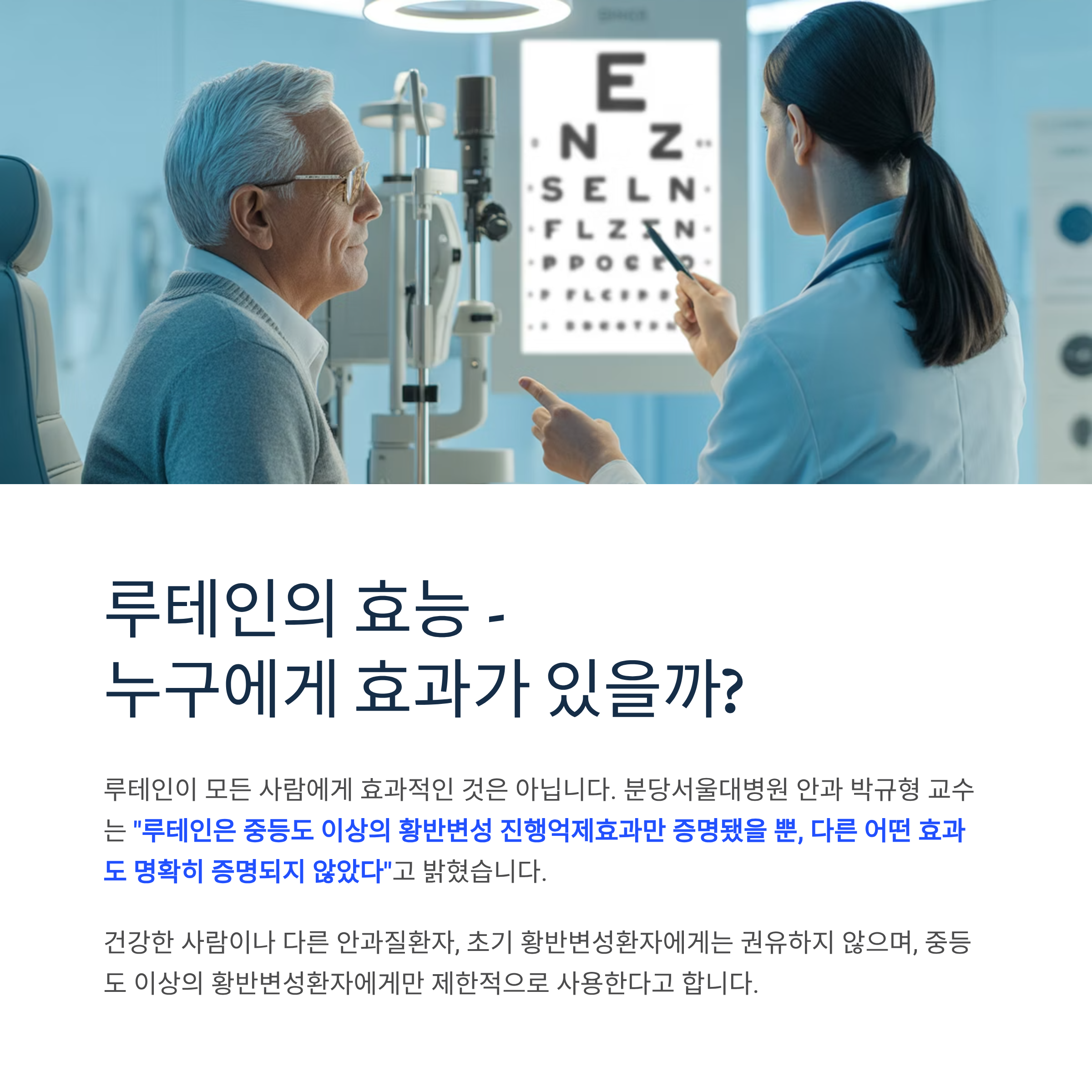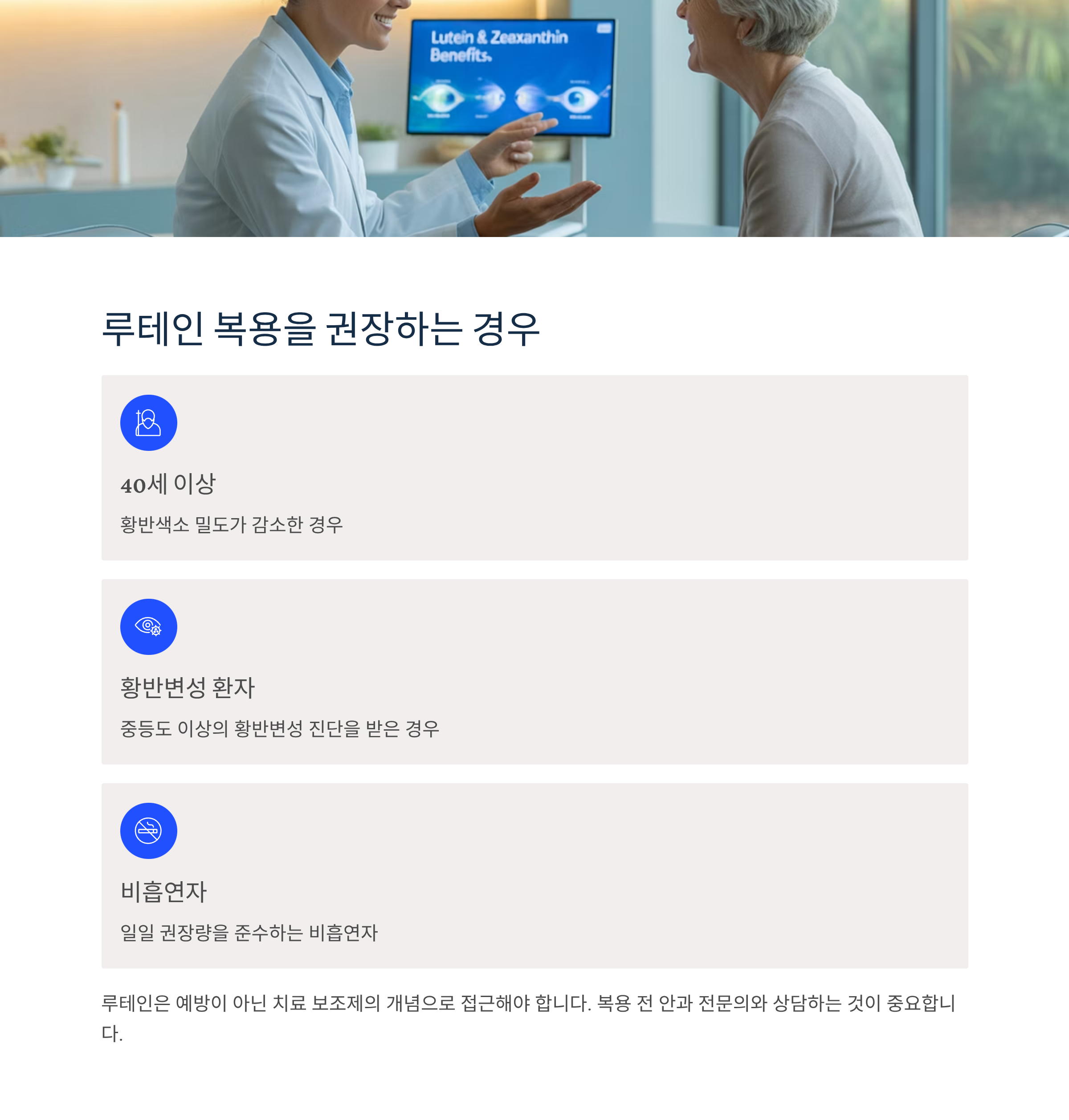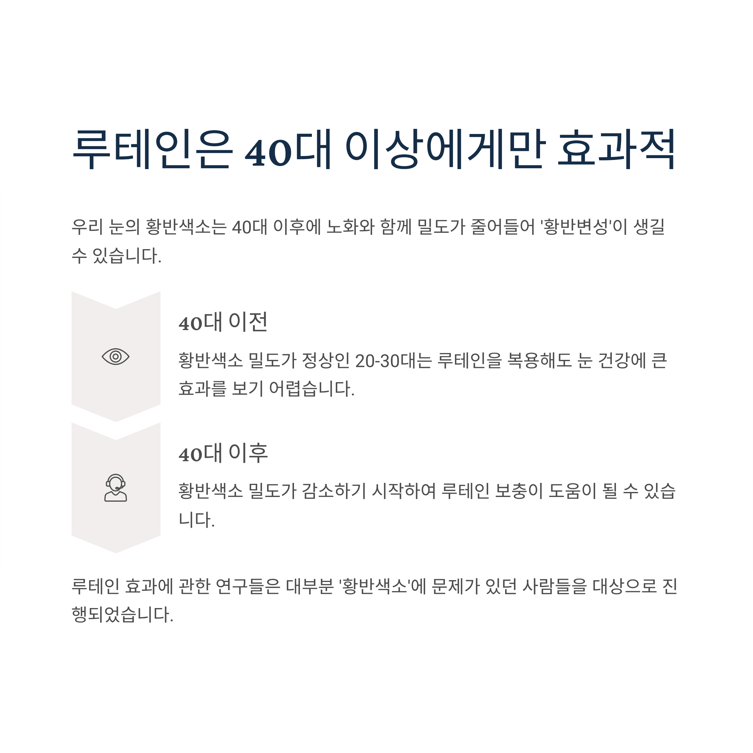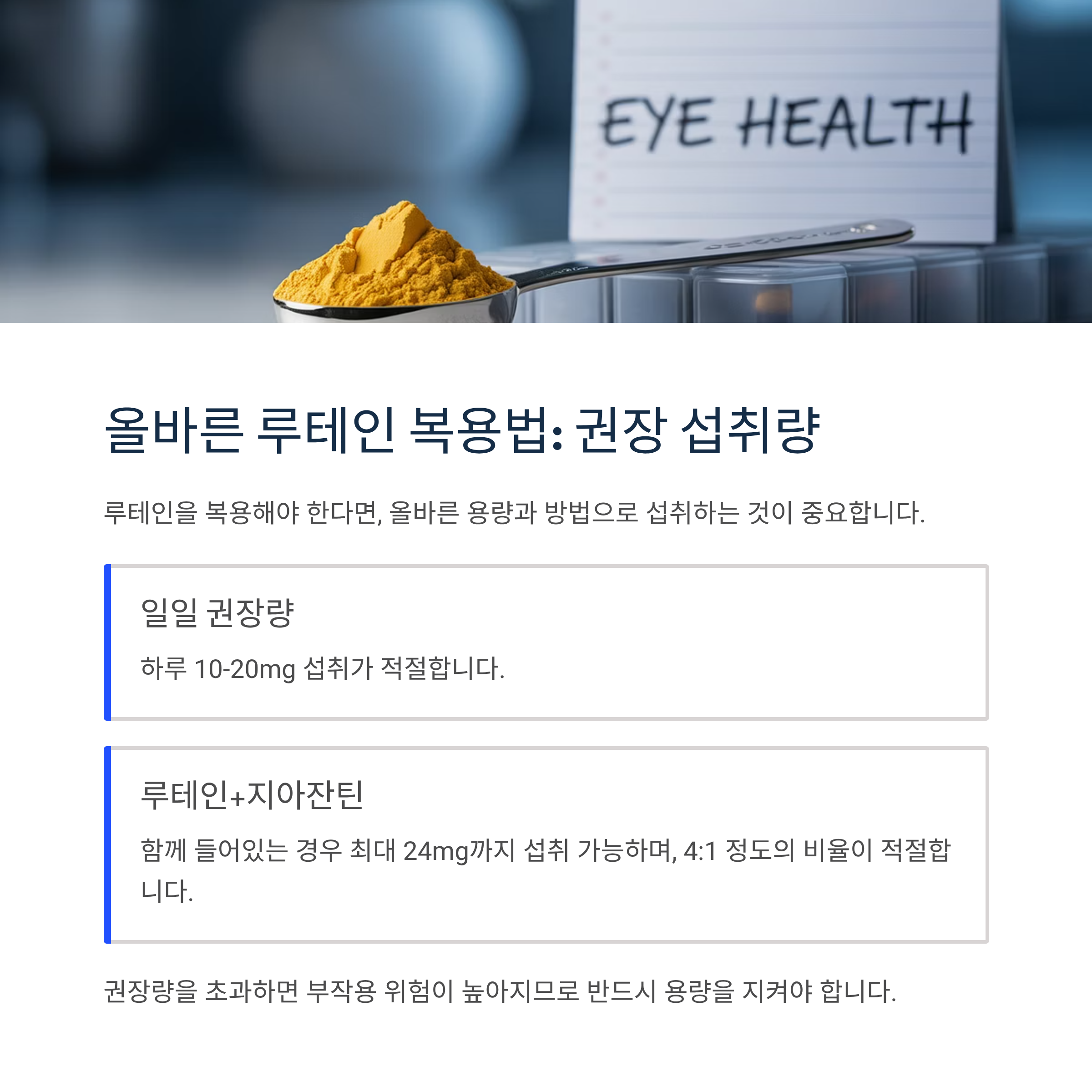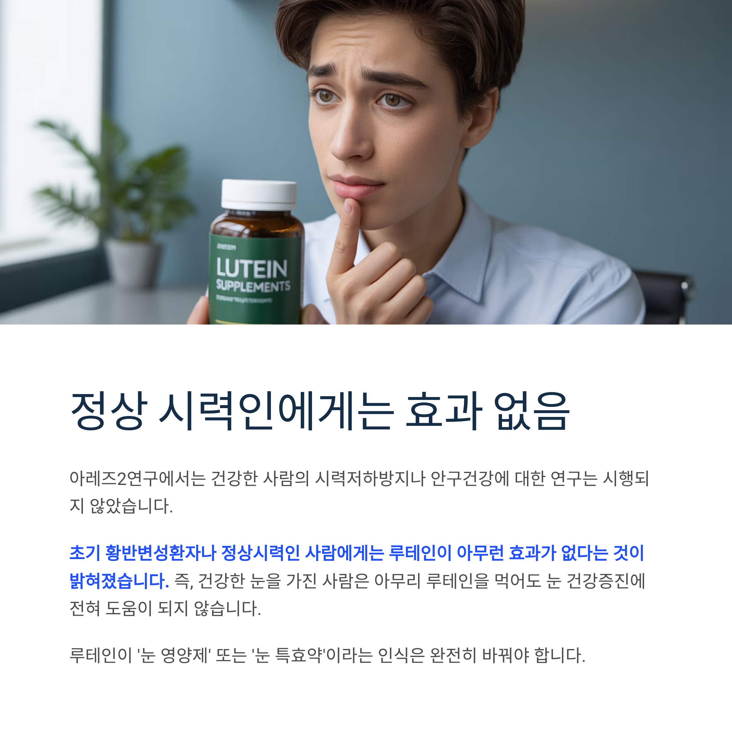 핵심 포인트: 루테인은 예방이 아닌 치료 보조제의 개념으로 접근해야 하며, 복용 전 안과 전문의와 상담을 통해 본인에게 필요한지 확인하는 것이 가장 중요합니다.