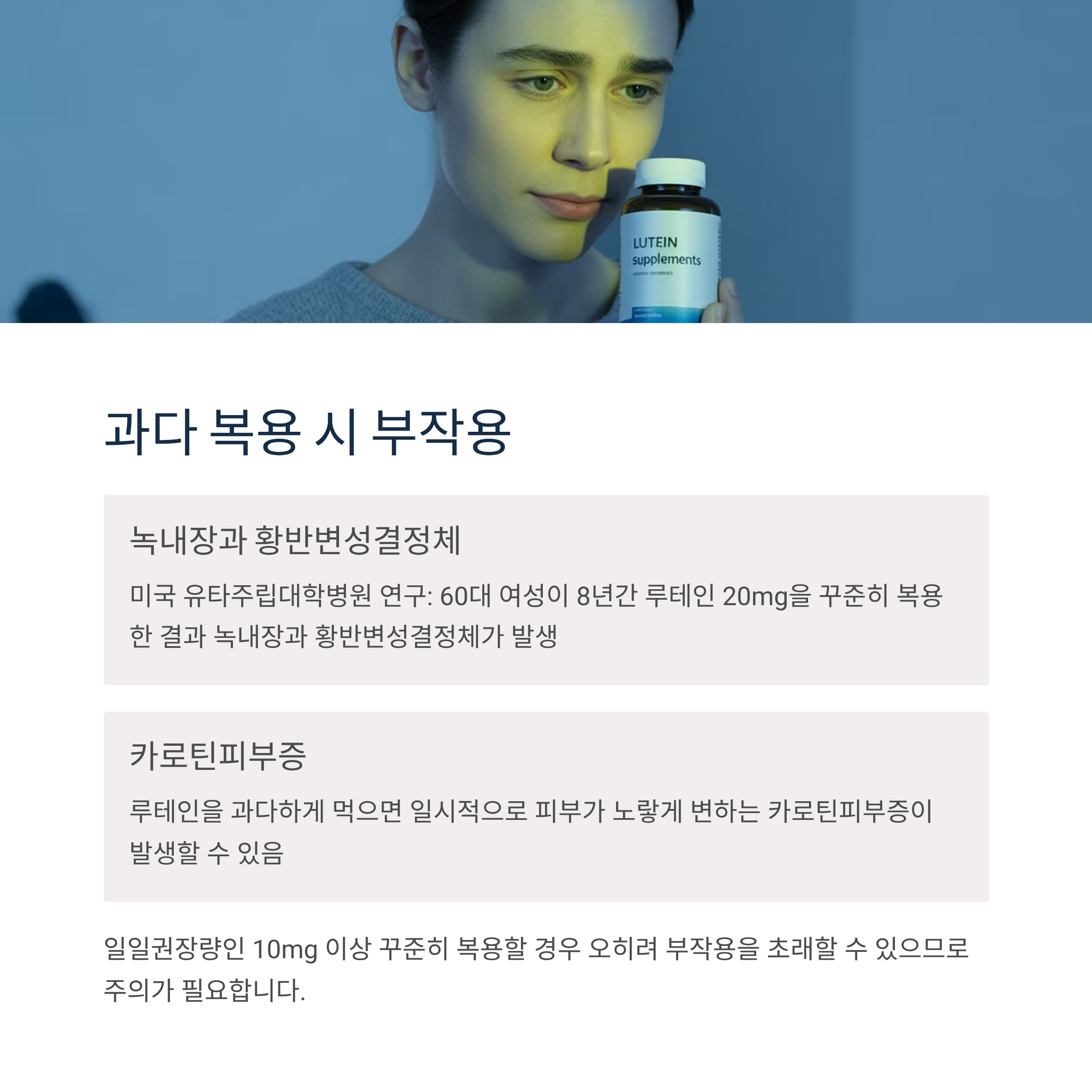 미국 유타주립대학병원의 모란안과가 진행한 연구에서 한 60대 여성이 8년간 루테인 20mg을 꾸준히 복용한 결과 녹내장과 황반변성결정체가 나타났으며, 이는 루테인을 일일권장량인 10mg 이상 꾸준히 복용할 경우 오히려 부작용을 초래할 수 있음을 보여주는 결과입니다.