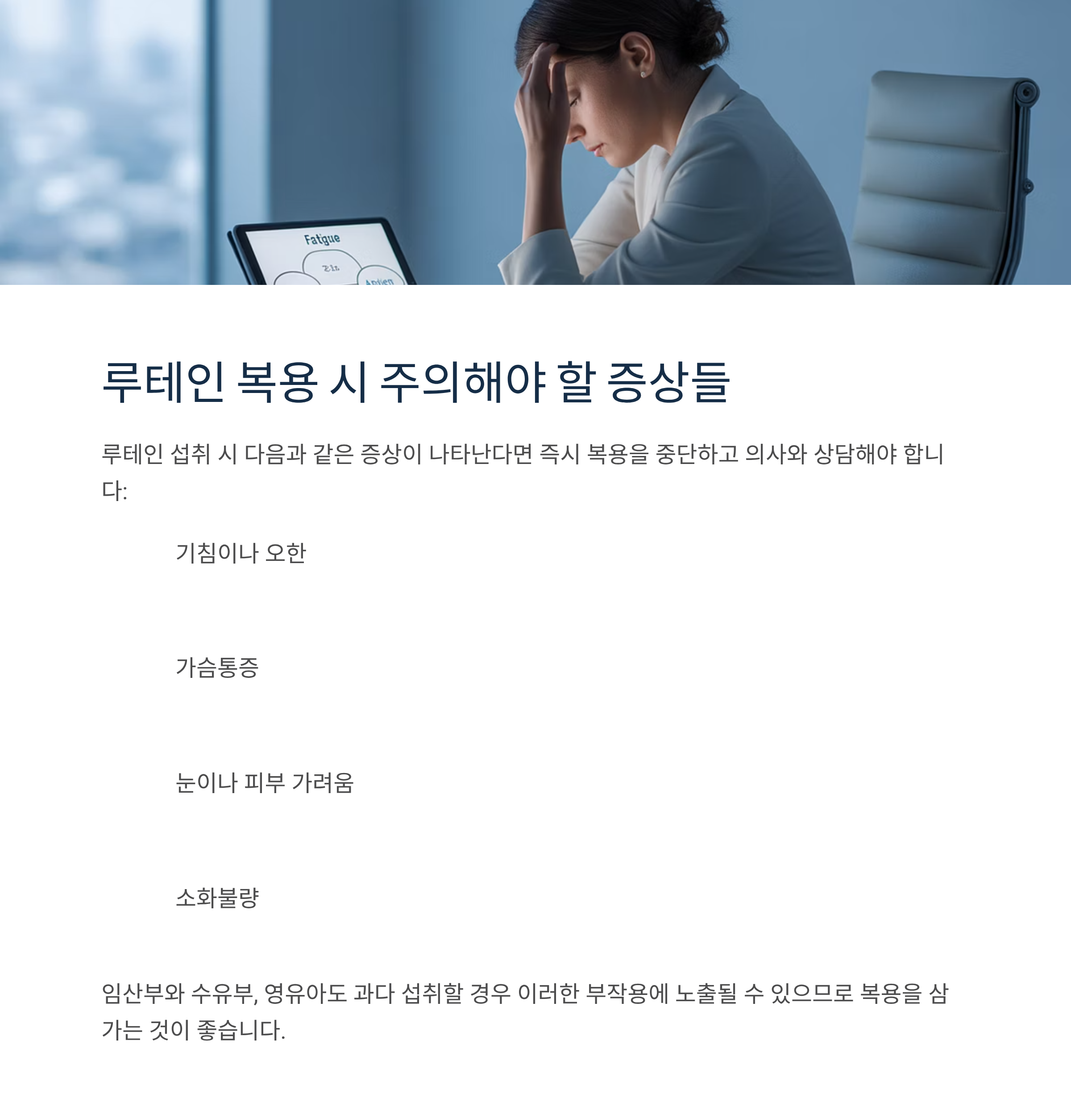 루테인 섭취시 기침이나 오한, 가슴통증, 눈이나 피부 가려움, 소화불량등의 증상이 있다면 복용을 중단해야 합니다.