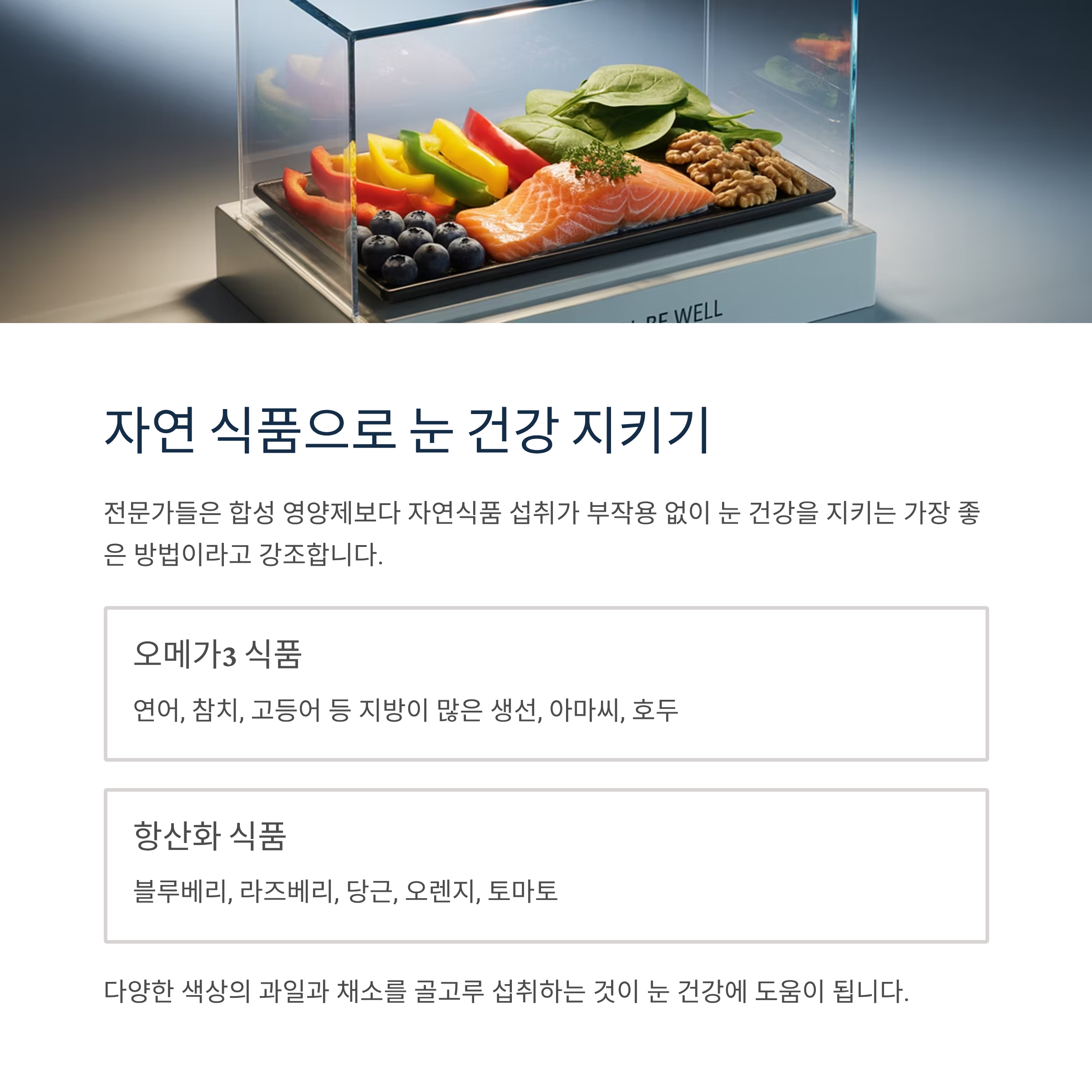 전문가들은 합성의약품을 과다 섭취하는 것 보다 녹색 채소와 같은 자연식품의 섭취가 부작용 없이 눈 건강을 지키는 가장 좋은 방법이라고 당부했습니다.