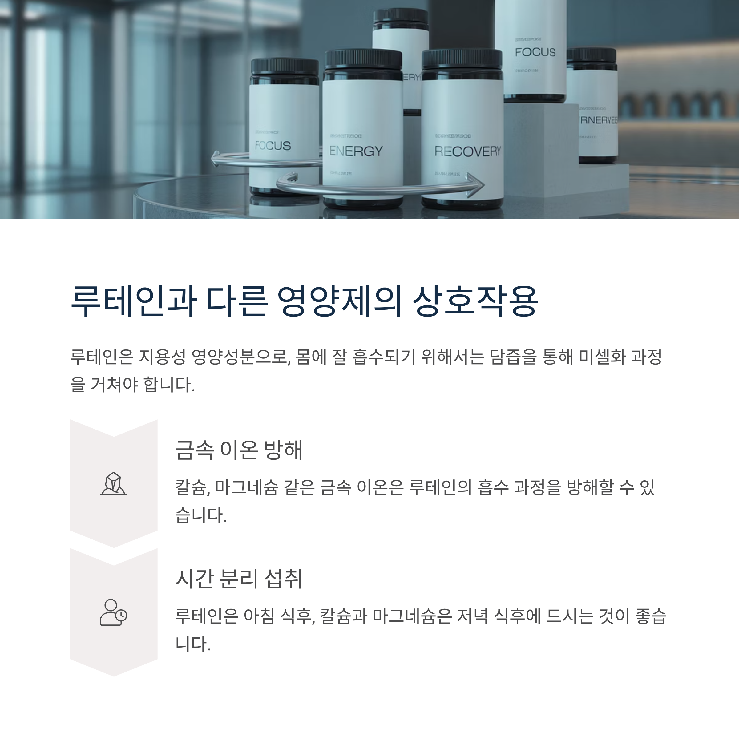 루테인은 지용성 영양성분으로, 몸에 잘 흡수되기 위해서는 담즙을 통해 미셀화 과정을 거쳐야 하는데, 이때 칼슘, 마그네슘같은 금속 이온은 이 과정을 방해할 수 있습니다.