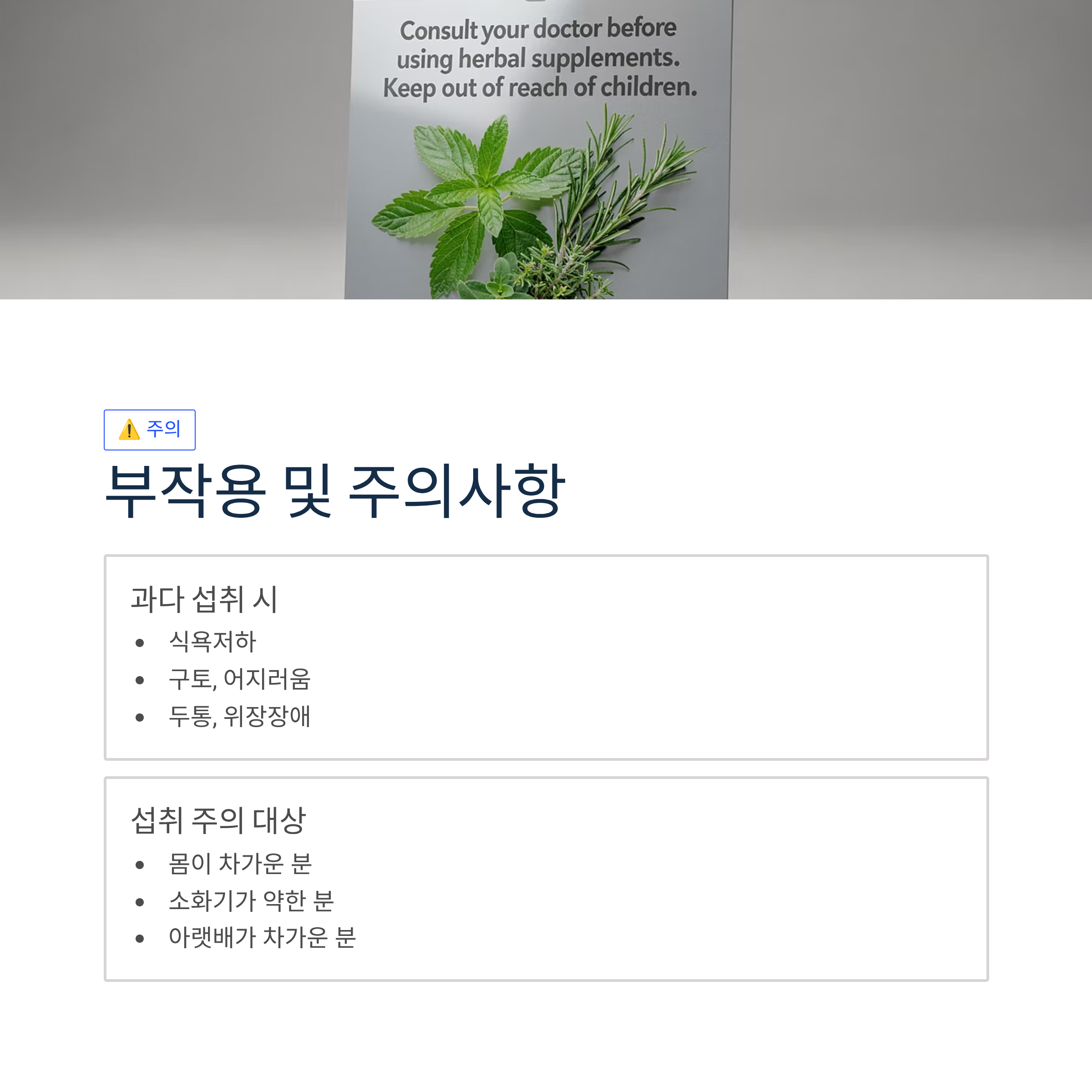 과다 섭취 시 식욕저하, 구토, 어지러움, 두통, 위장장애가 발생할 수 있습니다. 마가목은 성질이 차가운 편이라 평소 몸이 차거나 소화기가 약한 분, 아랫배가 차가운 분은 소량부터 시작하거나 생강, 대추와 함께 섭취하는 것이 좋습니다.
