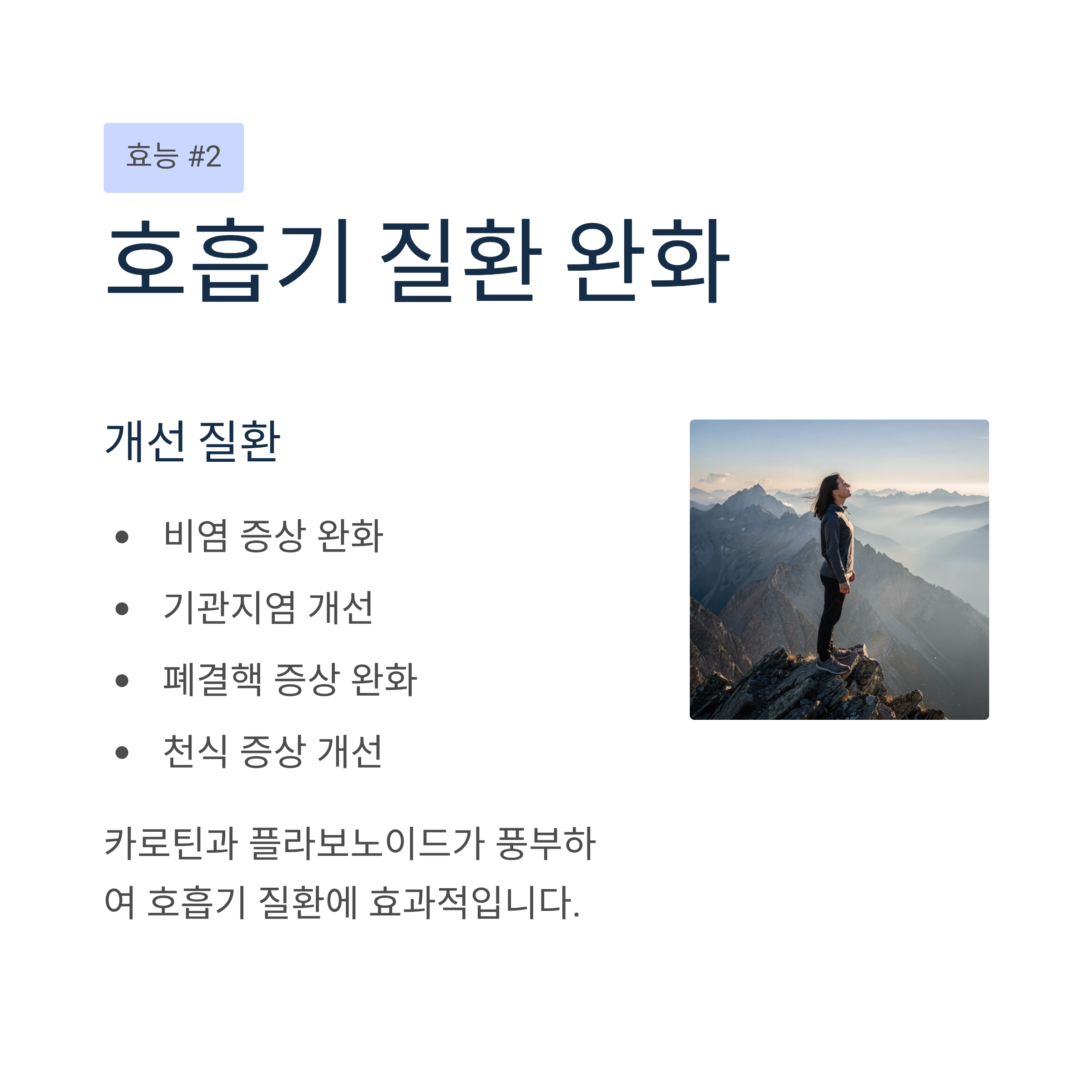 카로틴과 플라보노이드가 풍부하여 비염, 기관지염 등 호흡기 질환 개선에 효과적입니다. 폐결핵이나 천식 증상 완화에도 민간요법으로 활용되어 왔습니다.