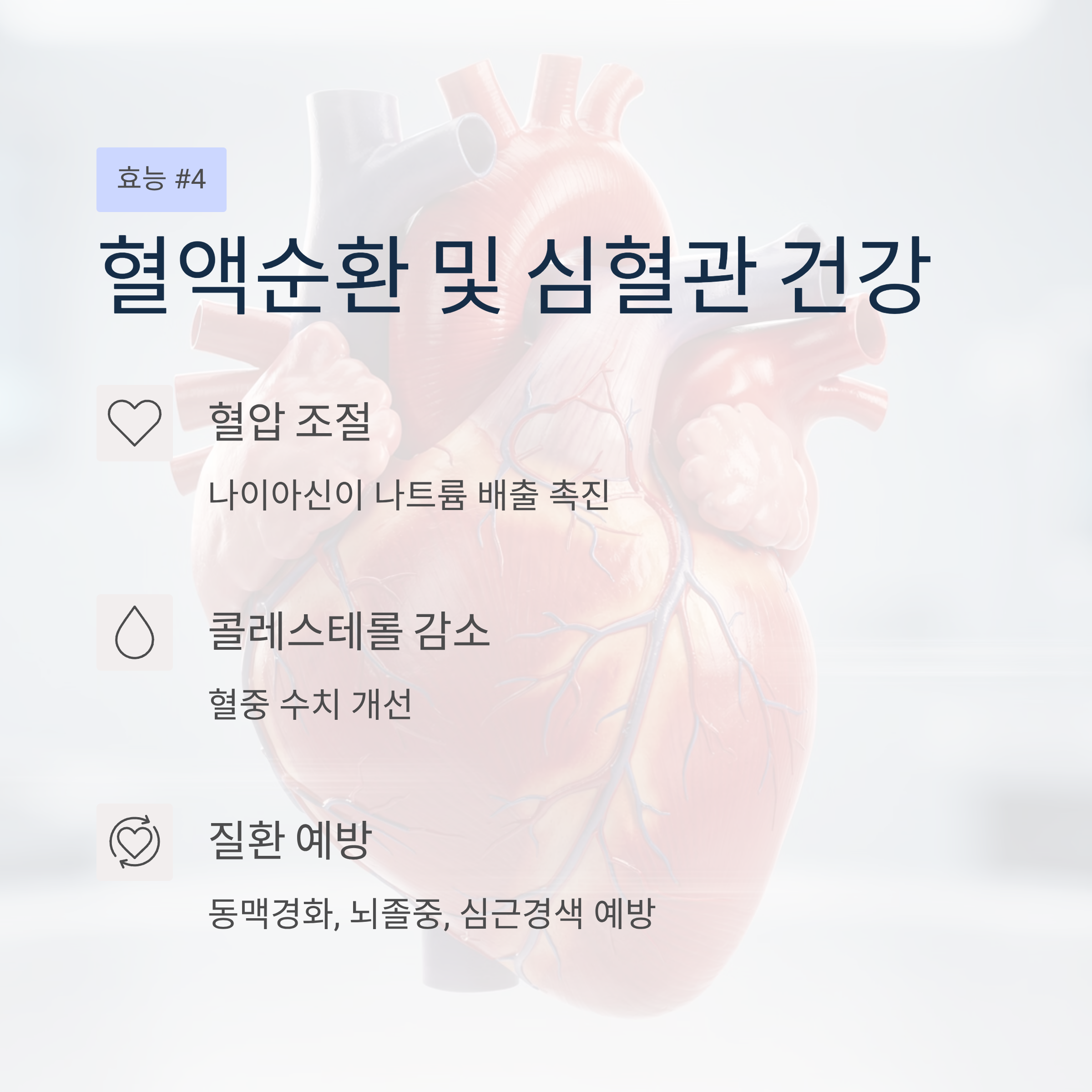 나이아신 성분이 체내 나트륨 배출을 도와 혈압을 낮추고, 혈중 콜레스테롤 수치를 감소시켜 동맥경화, 뇌졸중, 심근경색 등 심혈관 질환 예방에 효과적입니다.