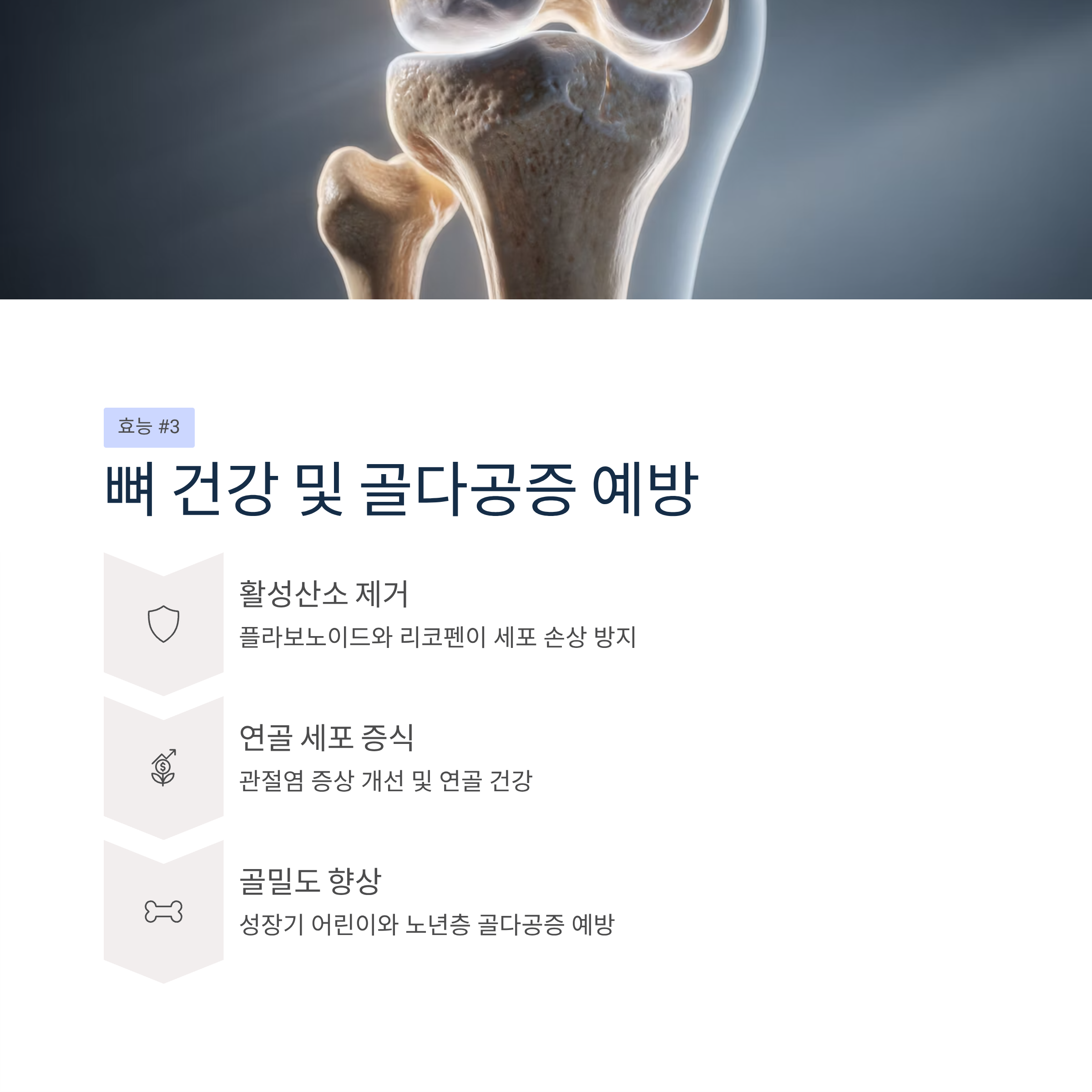 플라보노이드와 리코펜 성분이 활성산소를 제거하고 연골 세포 증식을 촉진하여 관절염 증상을 개선합니다. 골밀도를 높여 성장기 어린이와 노년층의 골다공증 예방에 도움을 줍니다.