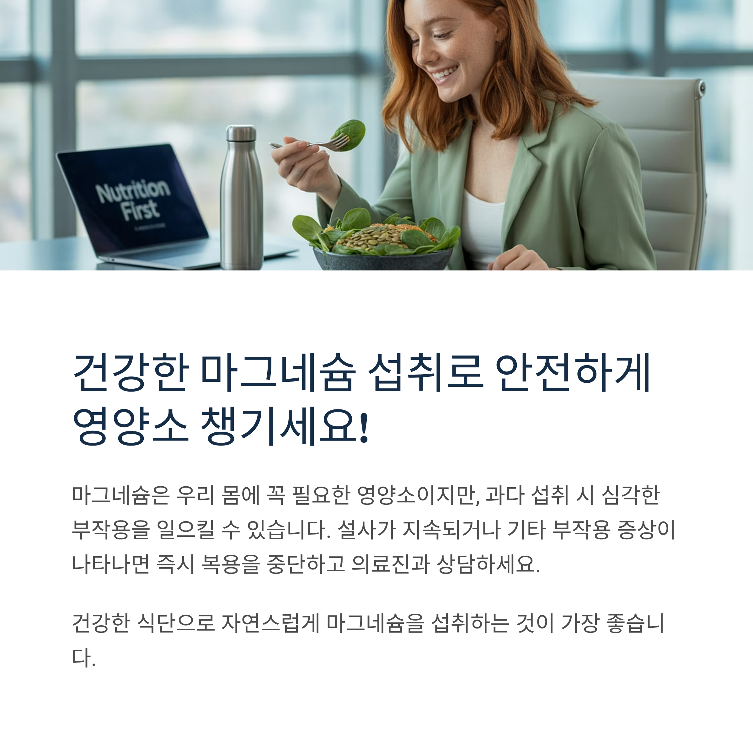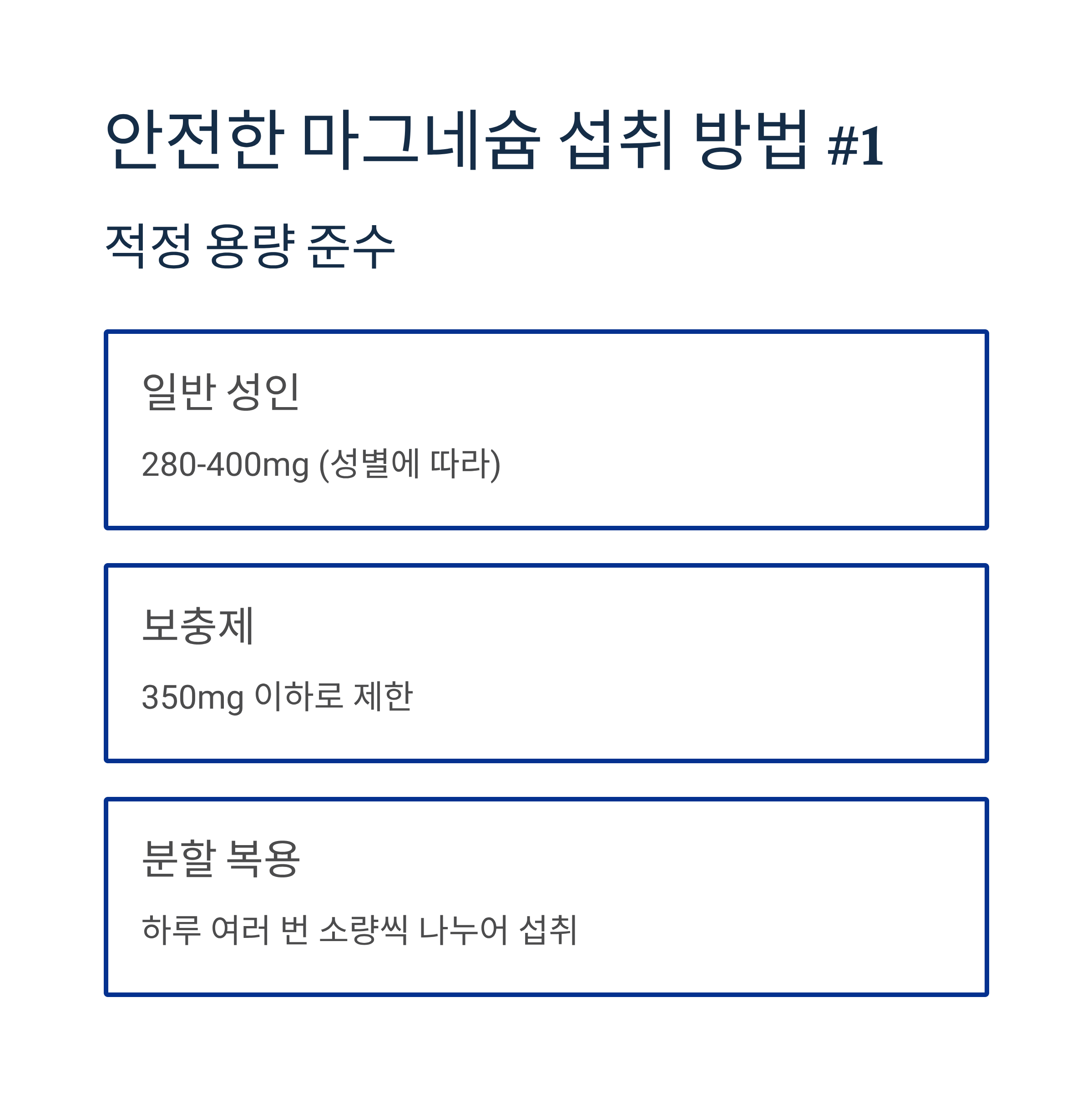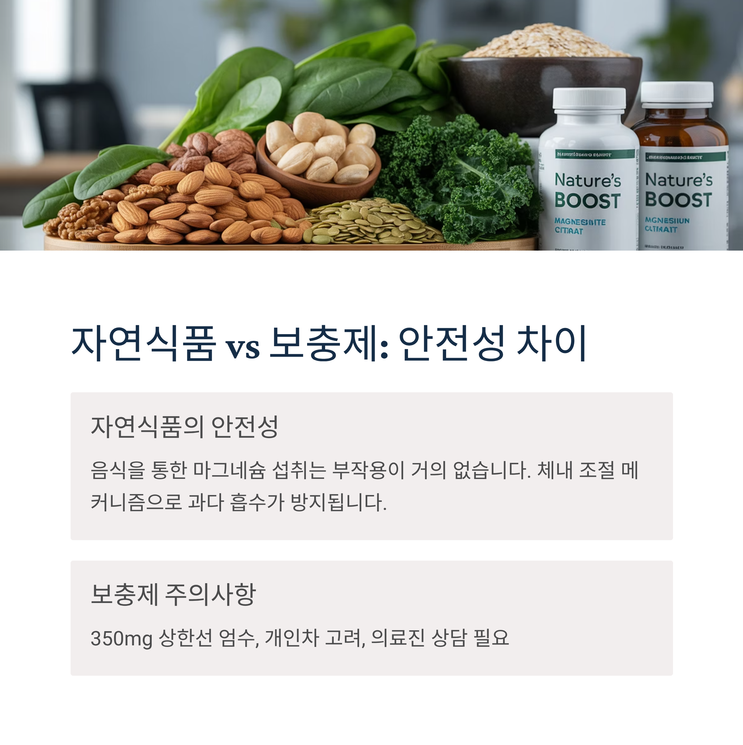 건강한 식단을 통한 자연스러운 마그네슘 섭취와 필요시 의료진 지도하에 적절한 보충제 복용이 가장 안전하고 효과적인 방법임을 기억하세요.
