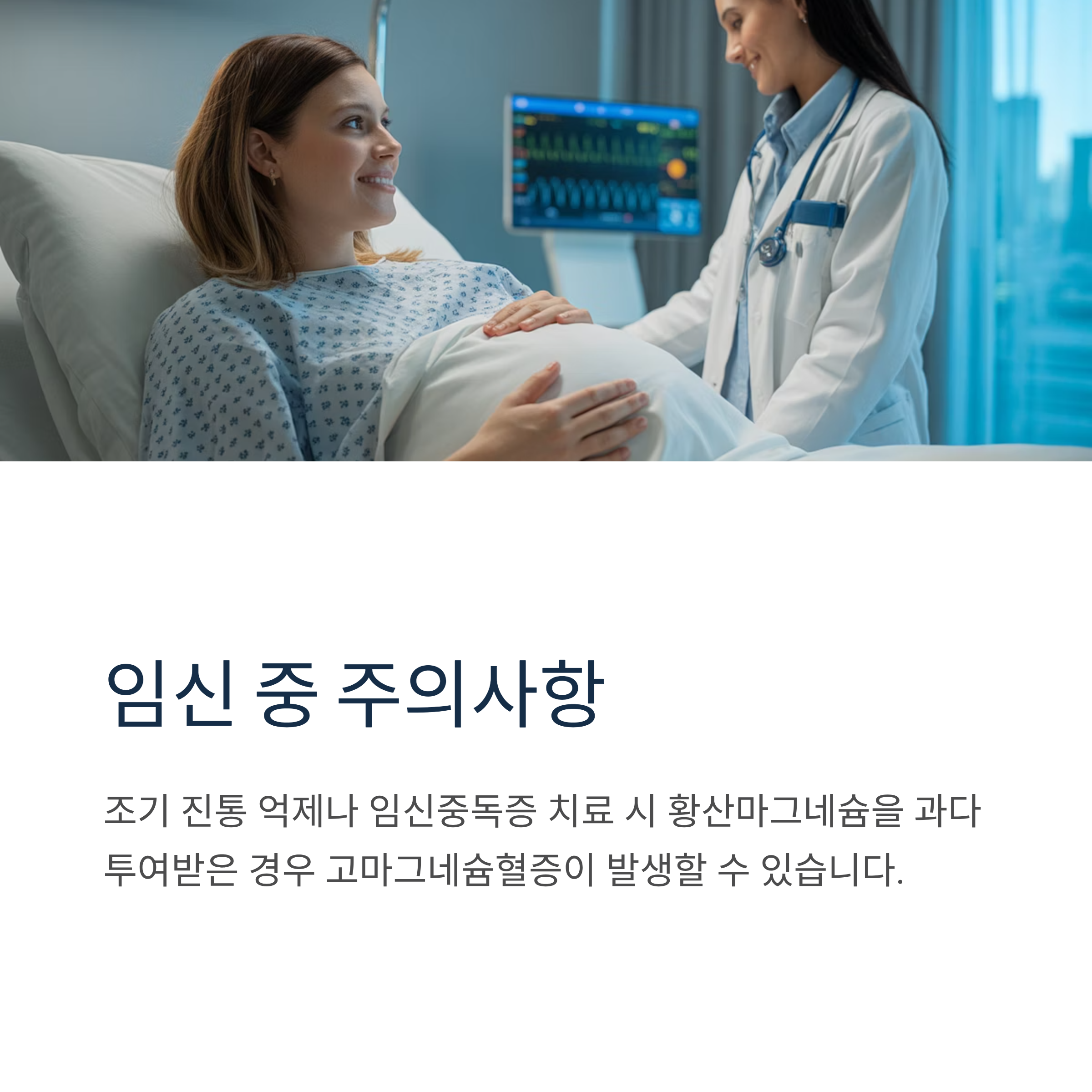 조기 진통 억제나 임신중독증 치료 시 황산마그네슘을 과다 투여받은 경우 고마그네슘혈증이 발생할 수 있습니다.