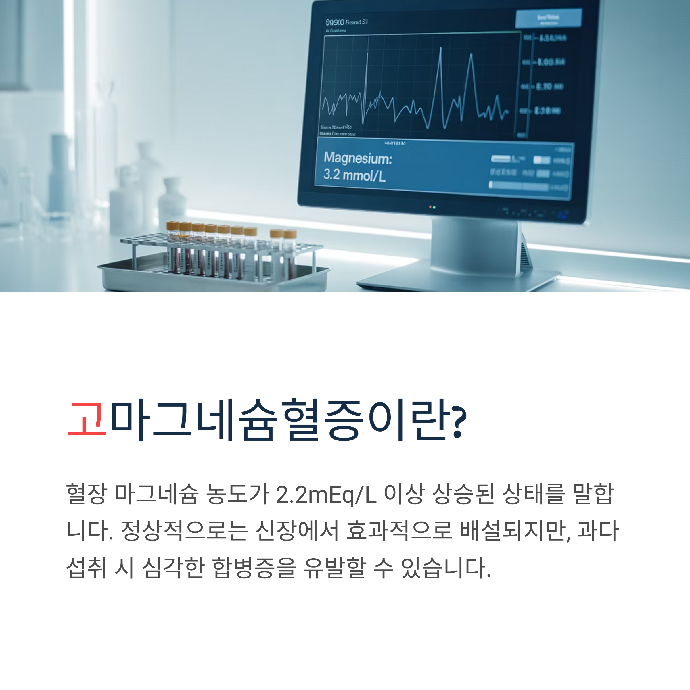 마그네슘 과다 섭취로 인한 고마그네슘혈증(Hypermagnesemia)은 혈장 마그네슘 농도가 2.2mEq/L 이상 상승된 상태를 말합니다. 정상적으로는 신장에서 매우 효과적으로 마그네슘을 배설하기 때문에 드물게 발생하지만, 일단 발생하면 심각한 합병증을 유발할 수 있습니다.