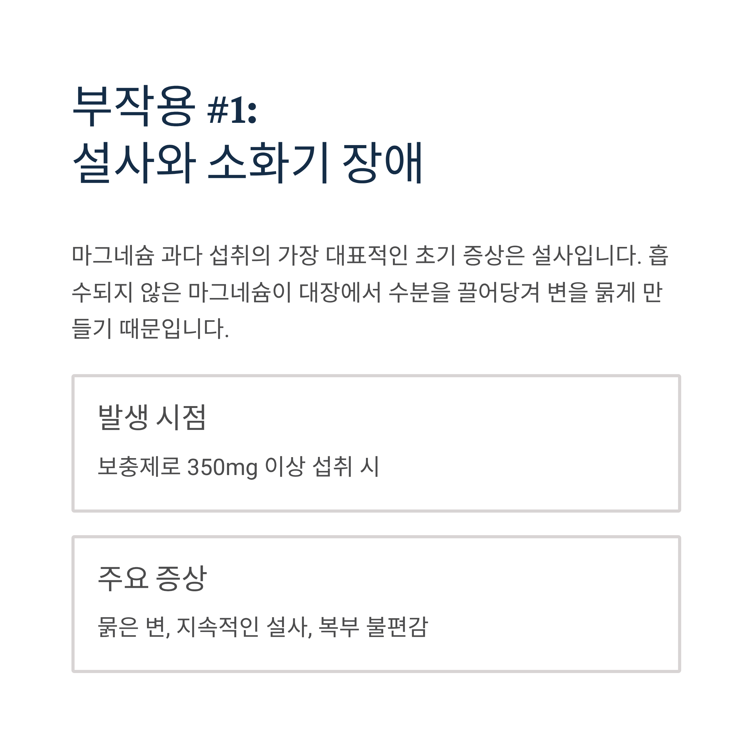 - 보충제 350mg 이상 섭취 시 발생