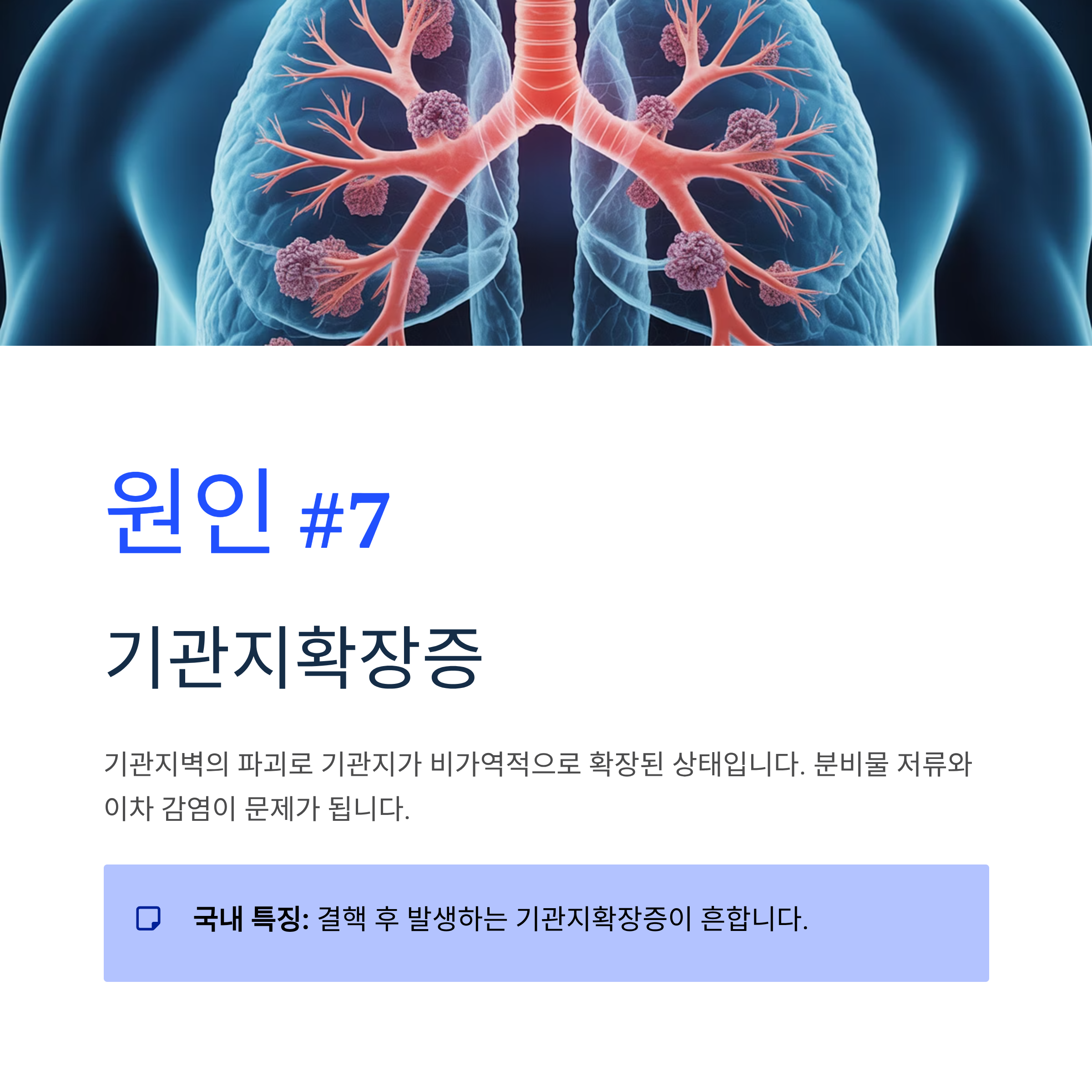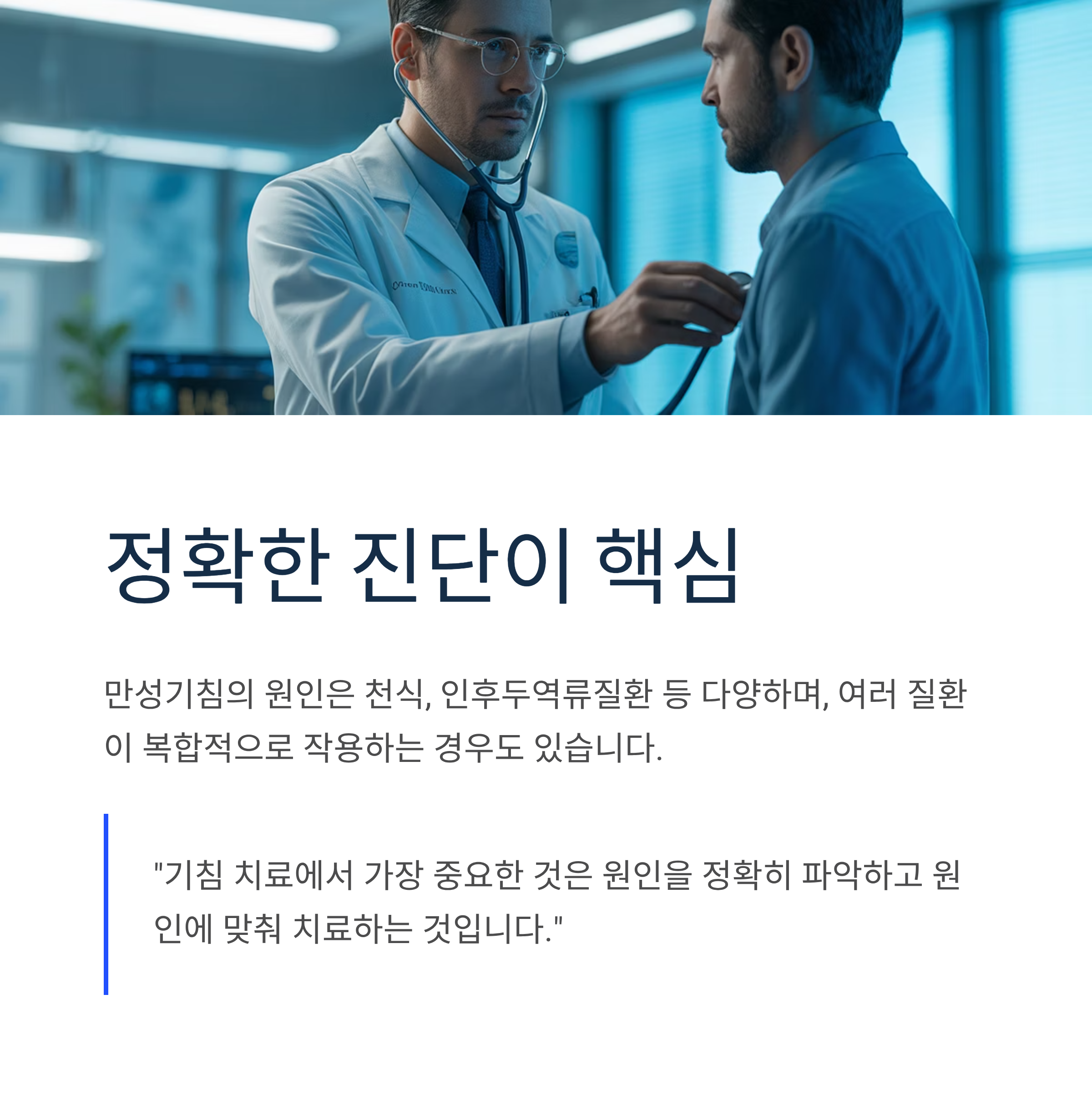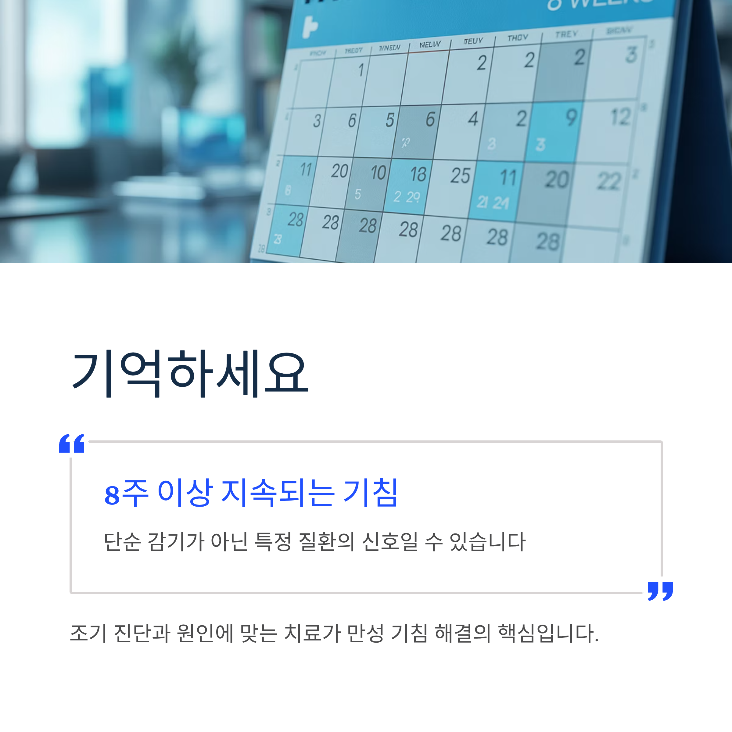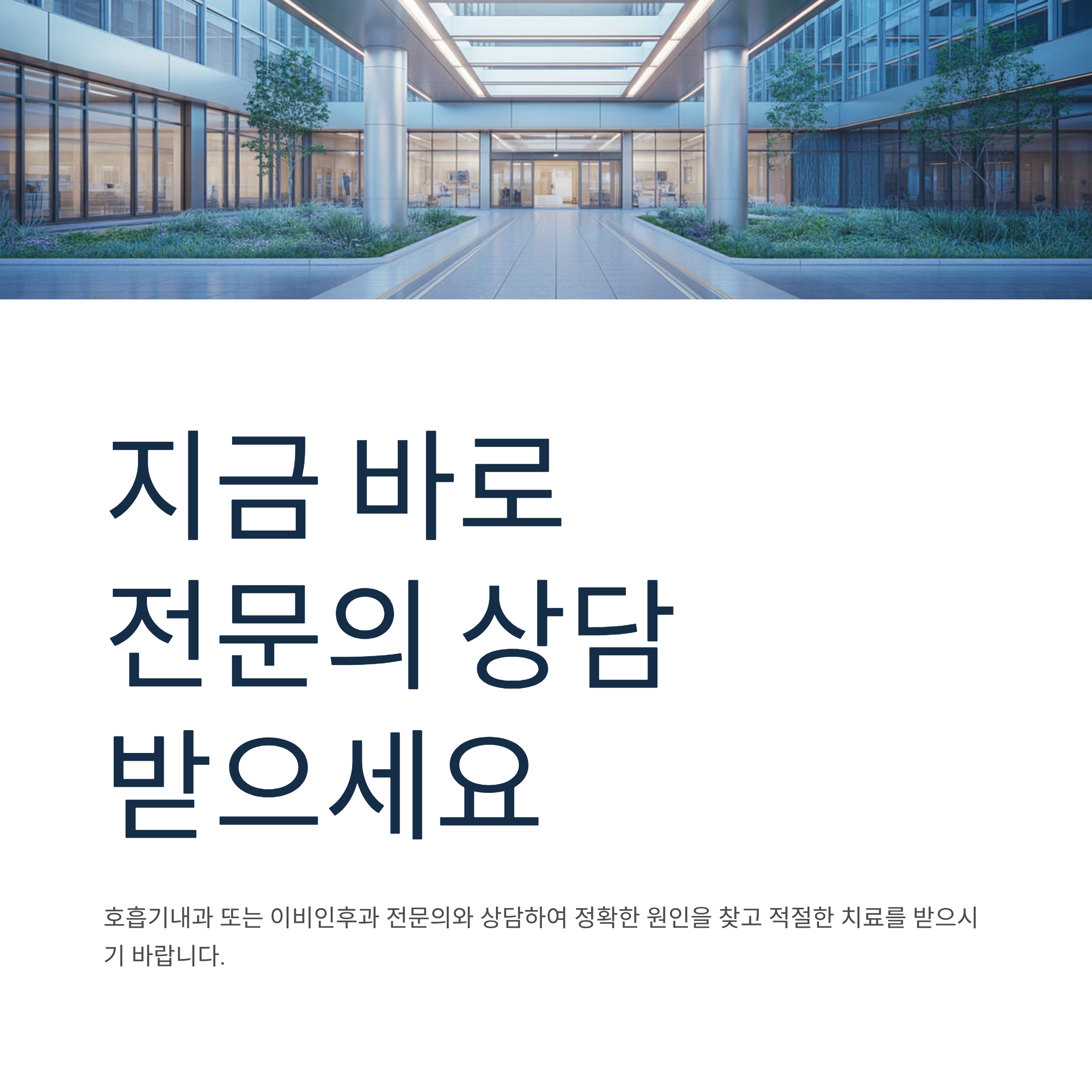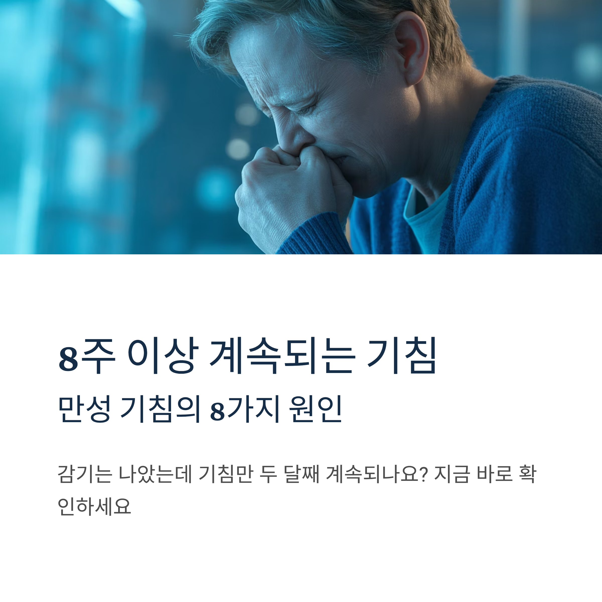 8주 이상 지속되는 만성 기침은 단순 감기가 아닌 특정 질환의 신호일 수 있습니다. 위의 8가지 원인 질환 중 의심되는 증상이 있다면 호흡기내과나 이비인후과 전문의 상담을 받으시기 바랍니다. 조기 진단과 원인에 맞는 치료가 만성 기침 해결의 핵심입니다.
