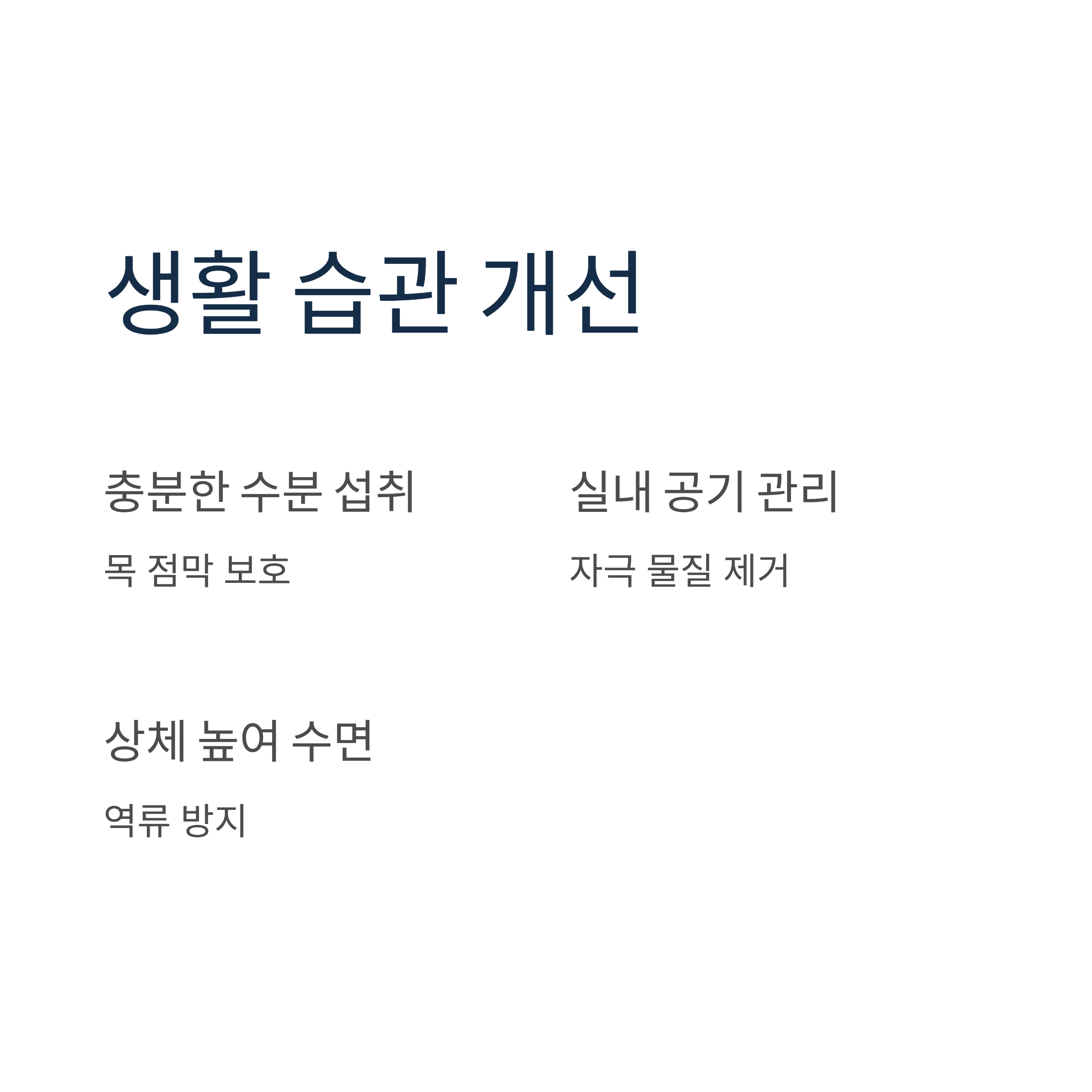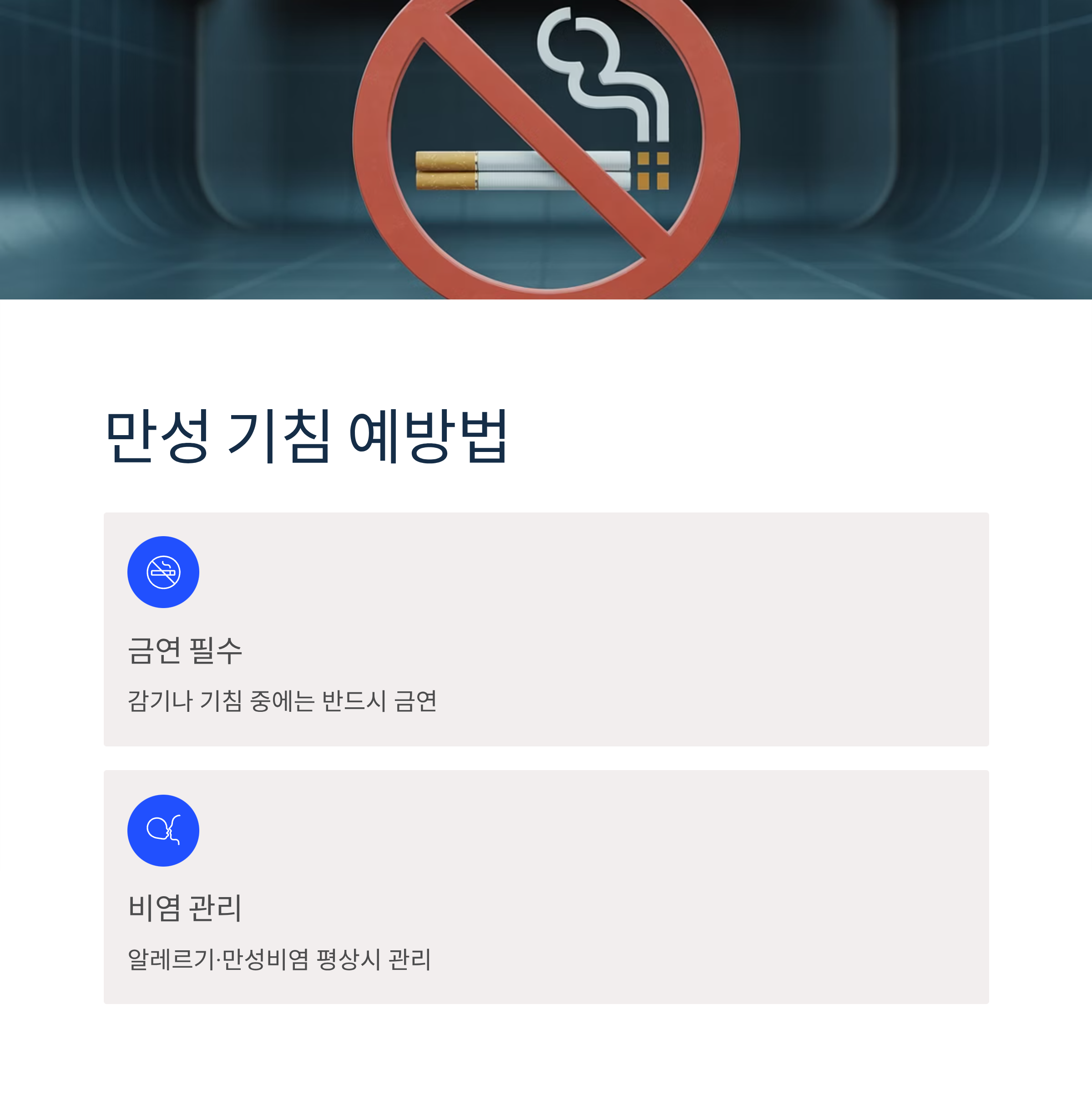- 비염 관리: 알레르기비염 또는 만성비염이 있으면 평상시에 관리해서 만성기침으로 진행되지 않도록 해야 합니다.