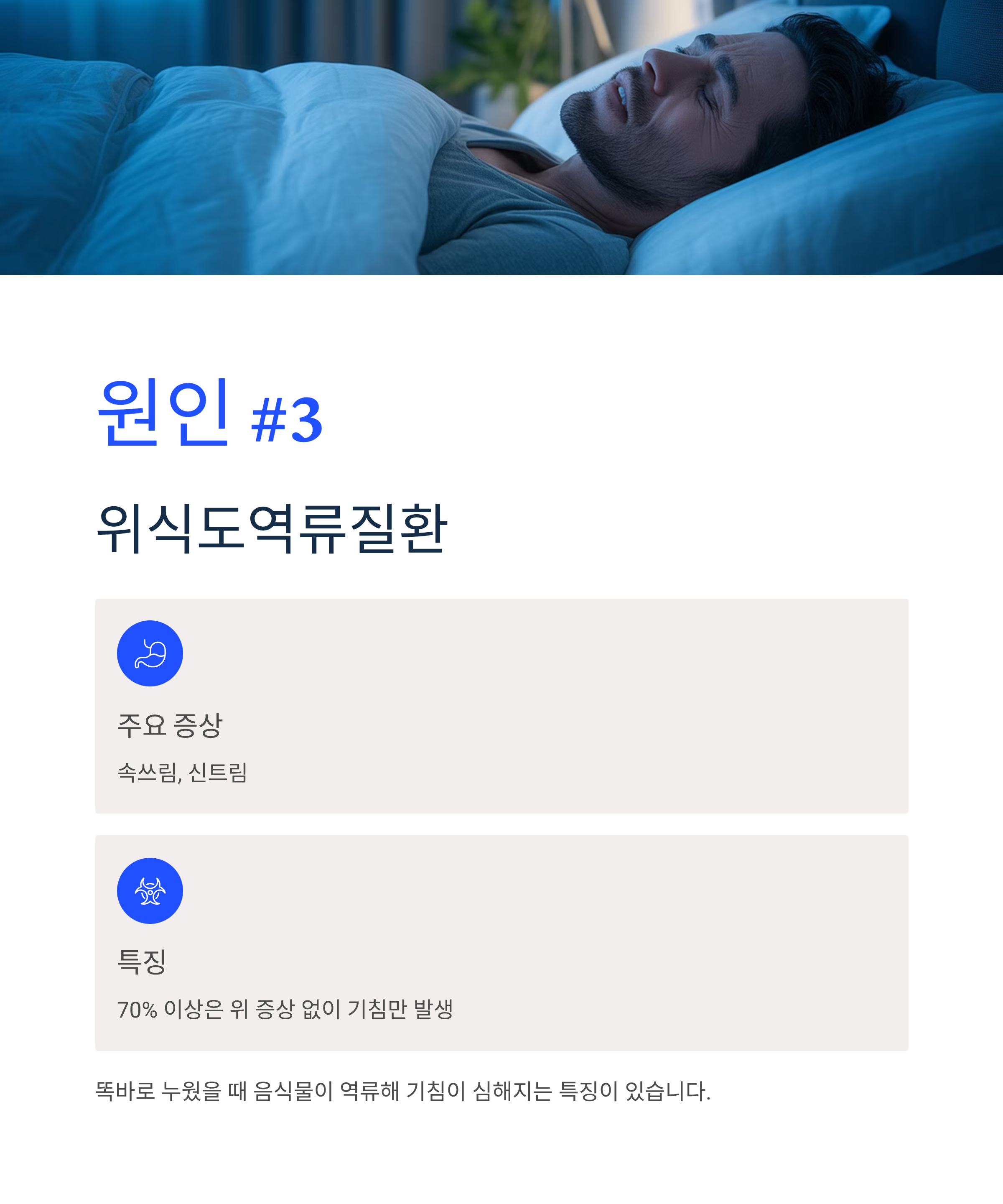기관지 천식 다음으로 흔한 만성 기침의 원인이 위식도 역류 질환입니다. 속쓰림이나 신트림 등의 위식도 증상을 동반하기도 하지만, 이런 증상 없이 기침만 하는 경우도 70% 이상 됩니다. 똑바로 누웠을 때 음식물이 역류해 기침이 심해지는 특징이 있습니다.